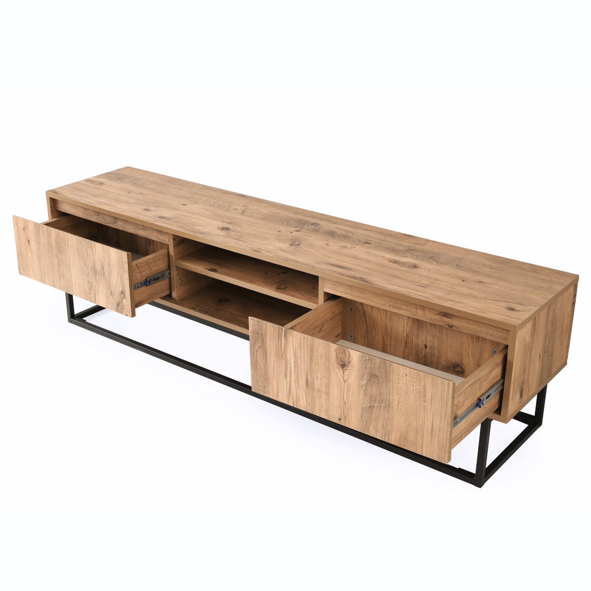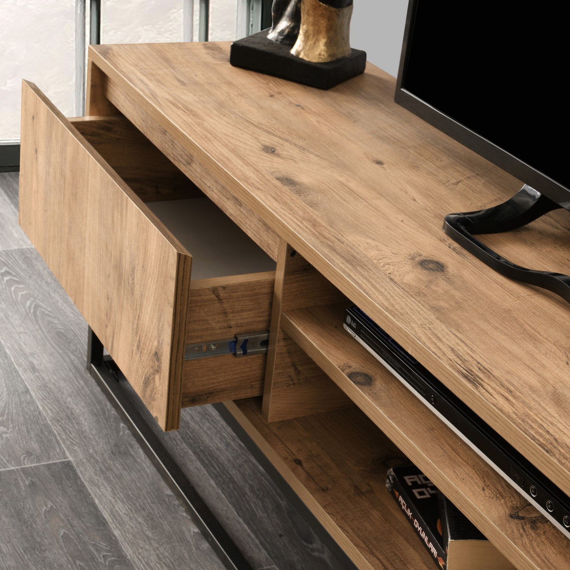 TV stolík BELINDA je spojením jednoduchého, napriek tomu okúzľujúceho vzhľadu v industriálnom štýle. Spojenie prírodného dekora borovice a kovovej podnože dokáže vytvoriť v interiéri veľmi útulnú atmosféru, ktorá bude každodenným potešením pre vaše oči. Korpus bol vytvorený z laminovaného materiálu s hrúbkou 18 mm s povrchom bez veľkého nároku na údržbu. Čierno lakovaná kovová podnož potom dodáva stolíku patričnú stabilitu. TV stolík BELINDA nie je iba osobitým kusom nábytku, ale vďaka dvom zásuvkám a otvoreným policiam tiež poskytuje dostatok úložného priestoru na všetko potrebné.