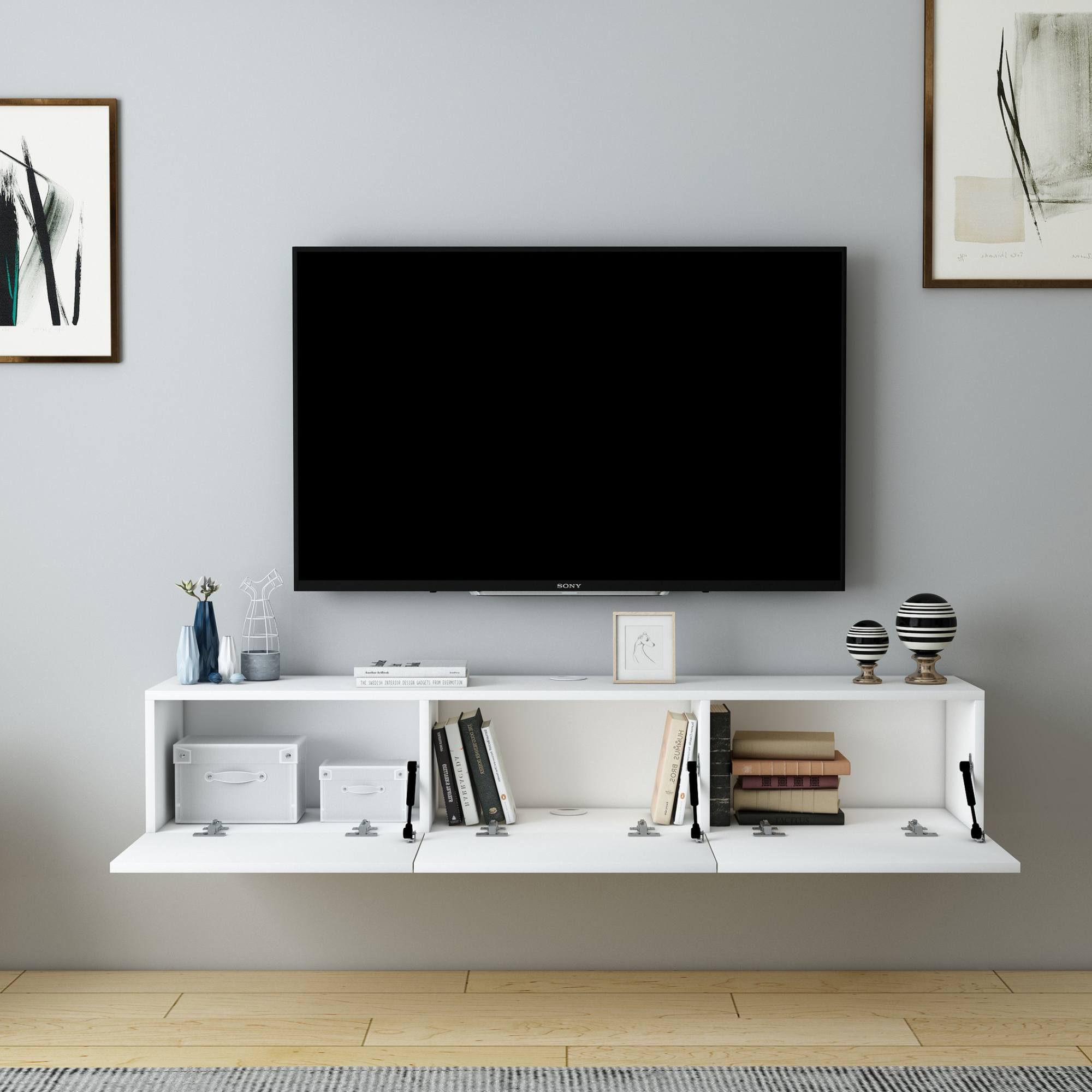 Závesný TV stolík DENBY, ktorý zaujme vďaka svojmu štýlovému bezrúčkovému prevedeniu, je stelesnením minimalistického štýlu.