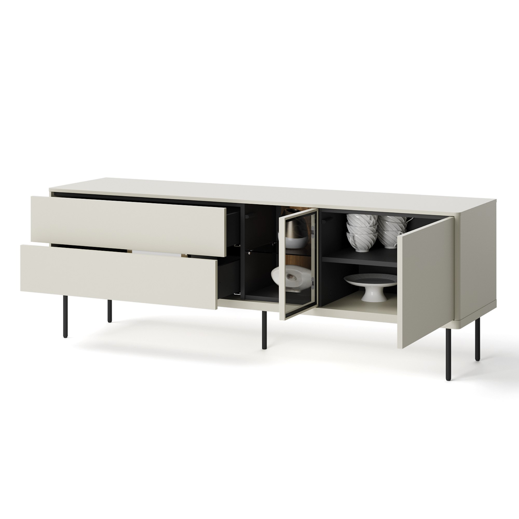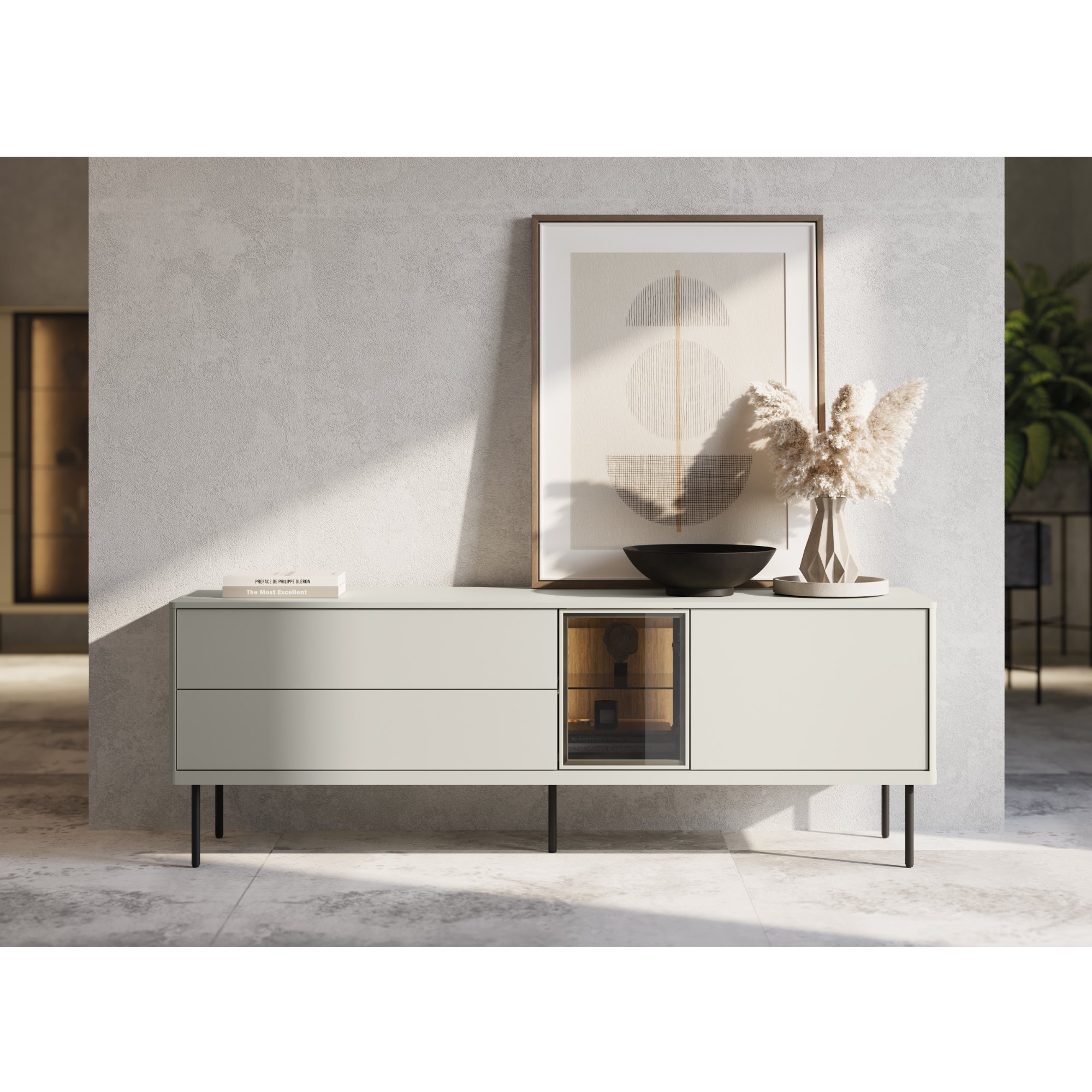 TV stolík ponúka dostatok úložného priestoru nielen na TV príslušenstvo, ale aj na ďalšie užitočné predmety. Okrem 2 zásuviek disponuje aj 2 vloženými policami, z ktorých 1 je zo skla. Nechýba ani LED osvetlenie, ktoré umožní dekoráciám vystaveným za presklenými dvierkami vyniknúť naplno.