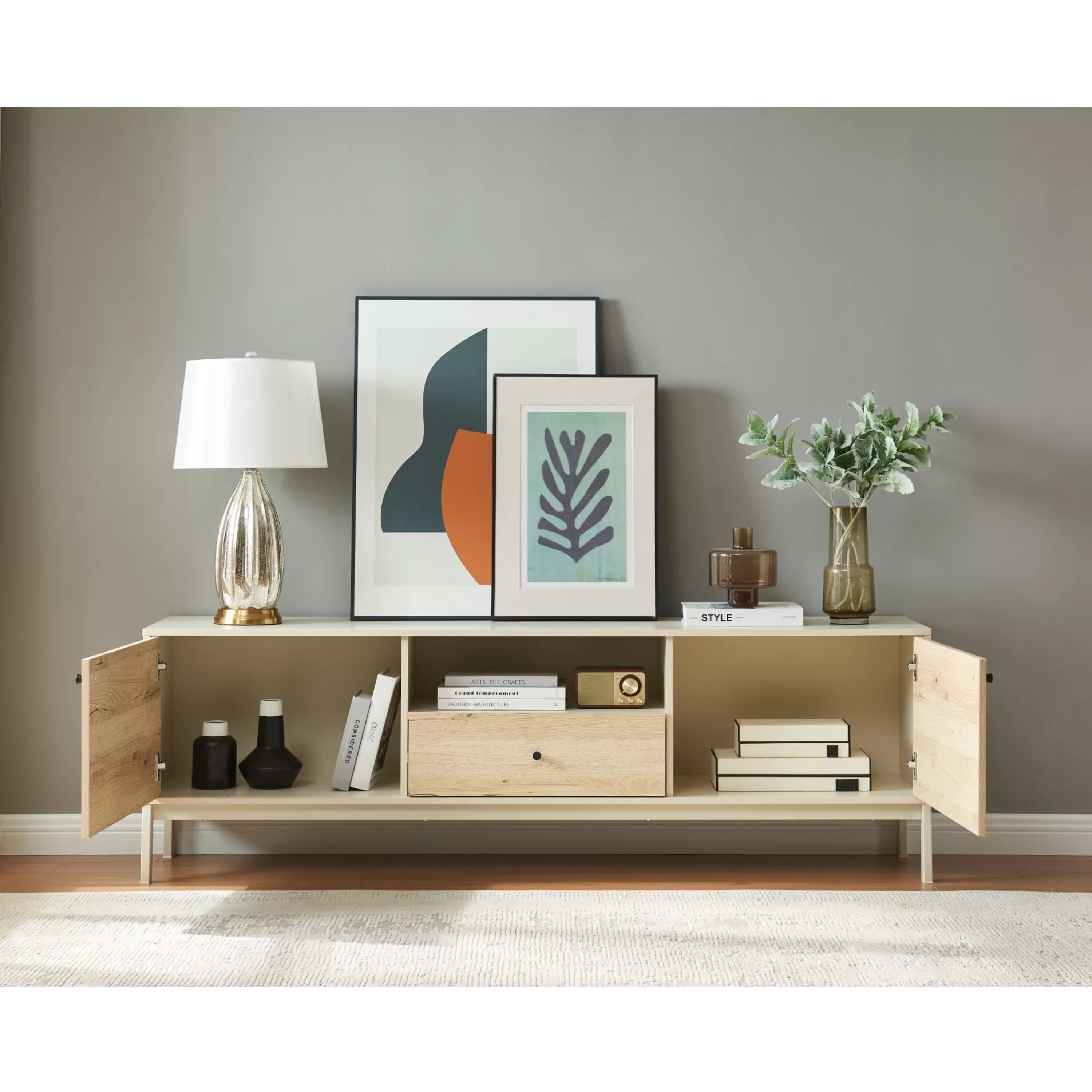 Disponuje 2 otočnými dvierkami a 1 zásuvkou. Všetko je vybavené praktickými úchytkami a doplnené dekorom alpského duba, ktorý dodáva stolíku prírodný nádych. Nad zásuvkou nájdete ďalší otvorený úložný priestor, ideálny na uloženie ovládačov. Korpus stolíka je vyrobený z laminovanej drevotrieskovej dosky v bielej farbe. Jeho stabilitu zaisťujú 4 biele kovové nohy. Svojimi rozmermi 180x58x40 cm poskytuje dostatok priestoru pre vašu televíziu a jej príslušenstvo. Svojím jednoduchým nadčasovým dizajnom zapadne do viacerých interiérov.