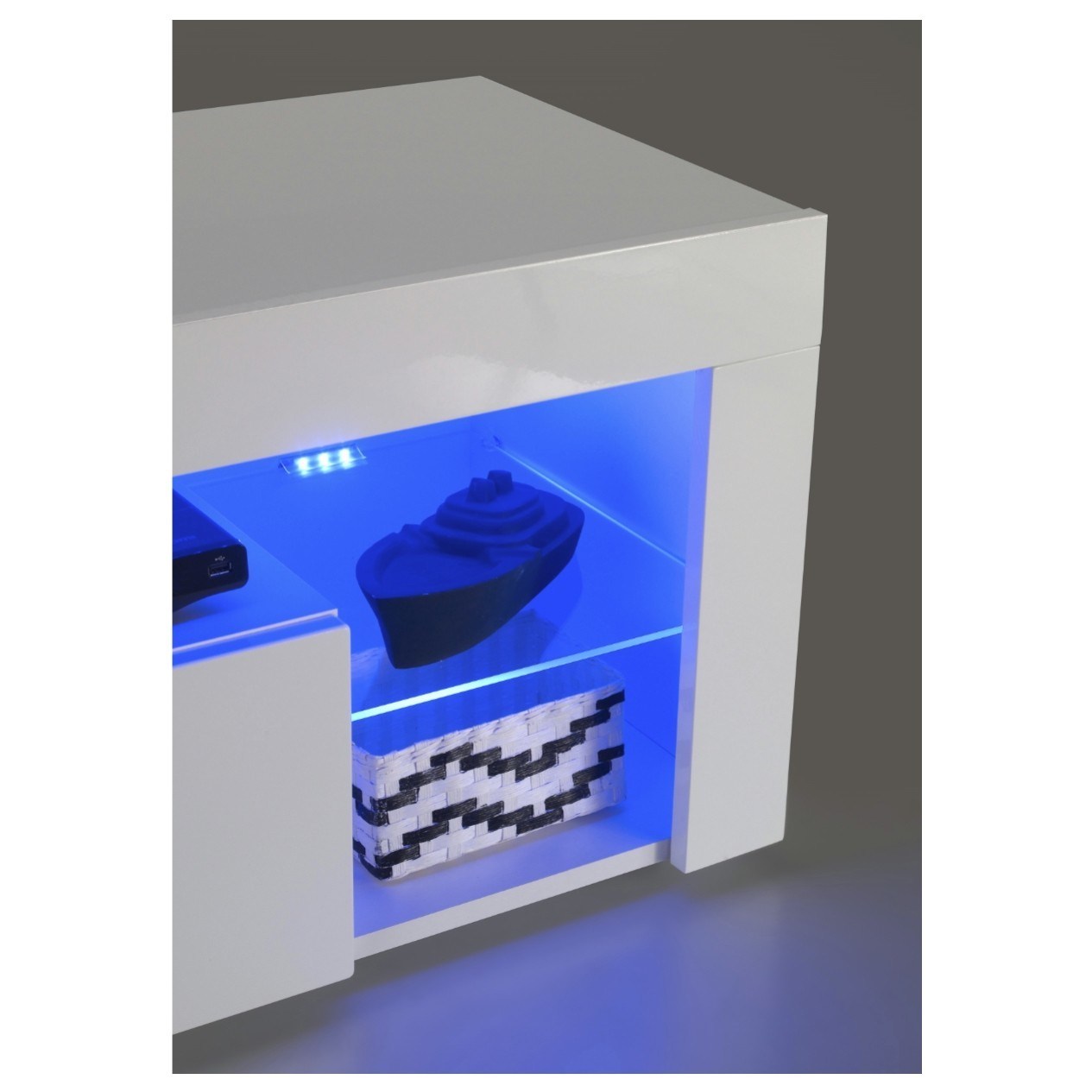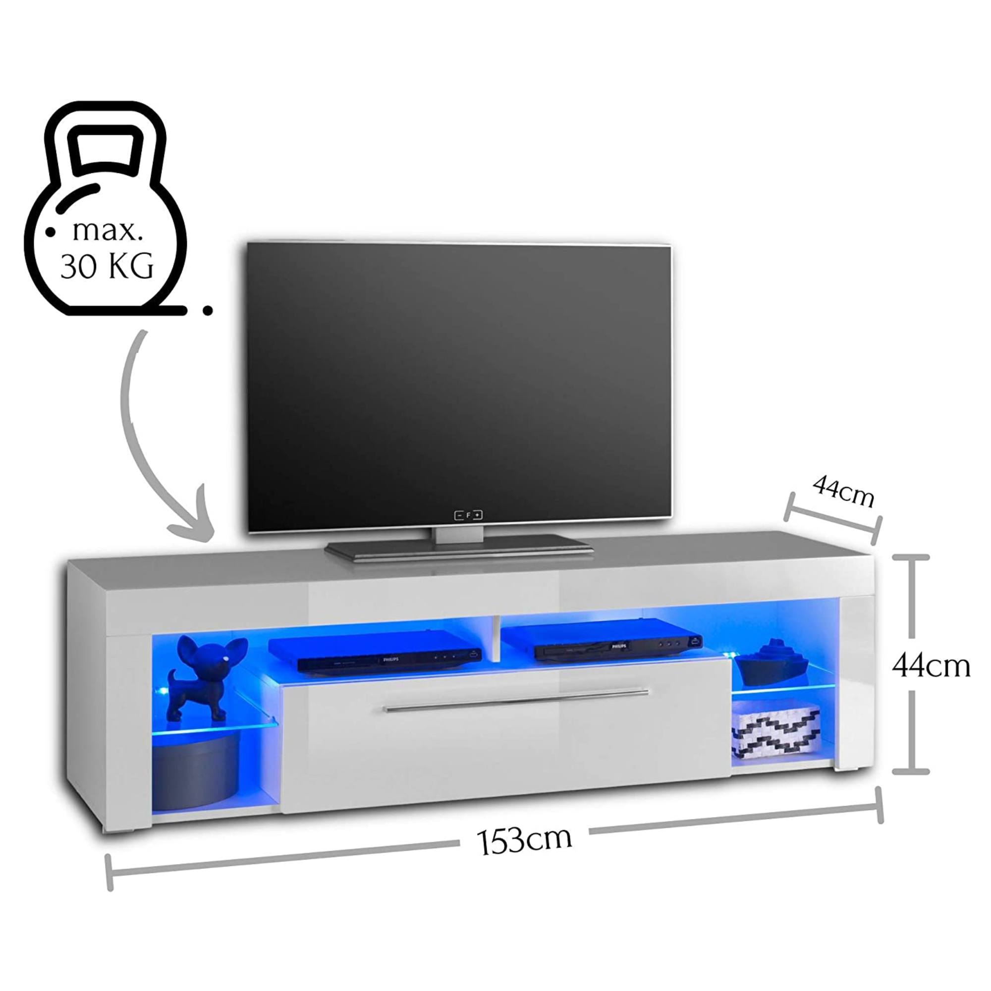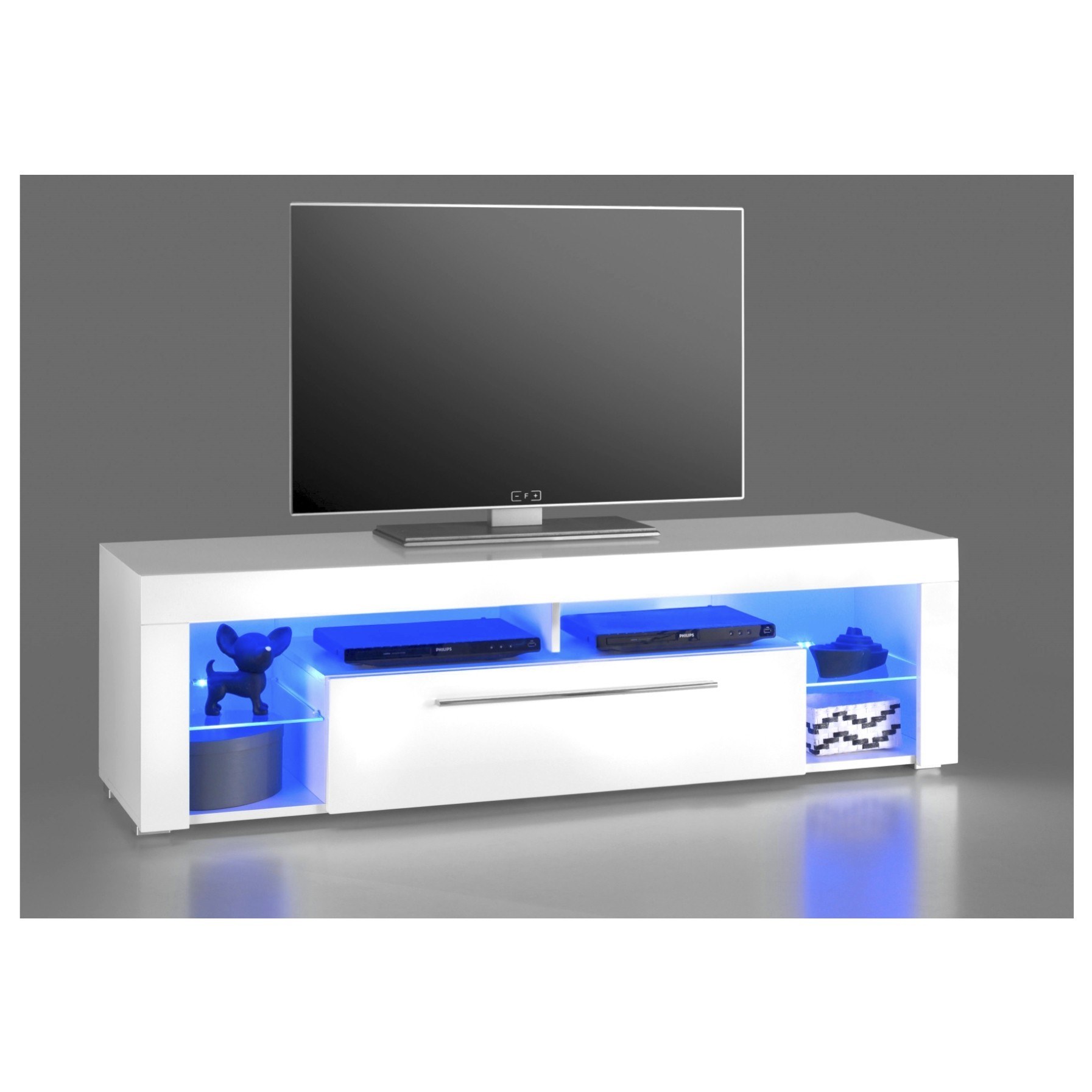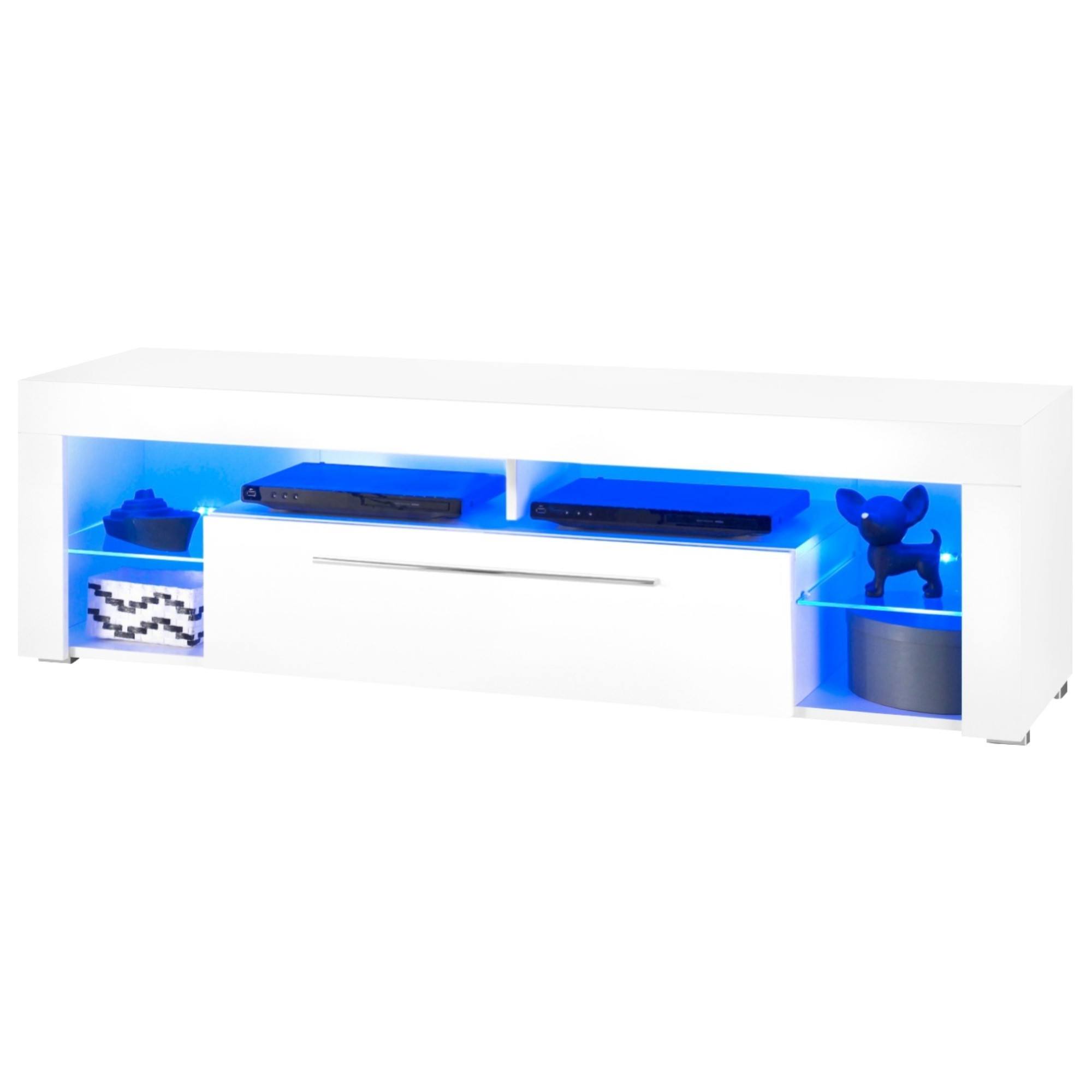 TV stolík GOAL vám doplní obývaciu izbu o praktický a módny kus nábytku. Čisté línie stolíka v kombinácii so skvelou vychytávkou v podobe modrého LED podsvietenia predstavujú špičkový moderný dizajn. TV stolík má dostatok úložného priestoru za výsuvnými dvierkami, rozsiahle otvorené miesto, kam sa skvele hodí TV príslušenstvo či nejaké štýlové dekorácie. Stolík je vyrobený z MDF materiálu, ktorý nie je náročný na údržbu. Vylaďte si obývaciu izbu naším praktickým TV stolíkom GOAL.