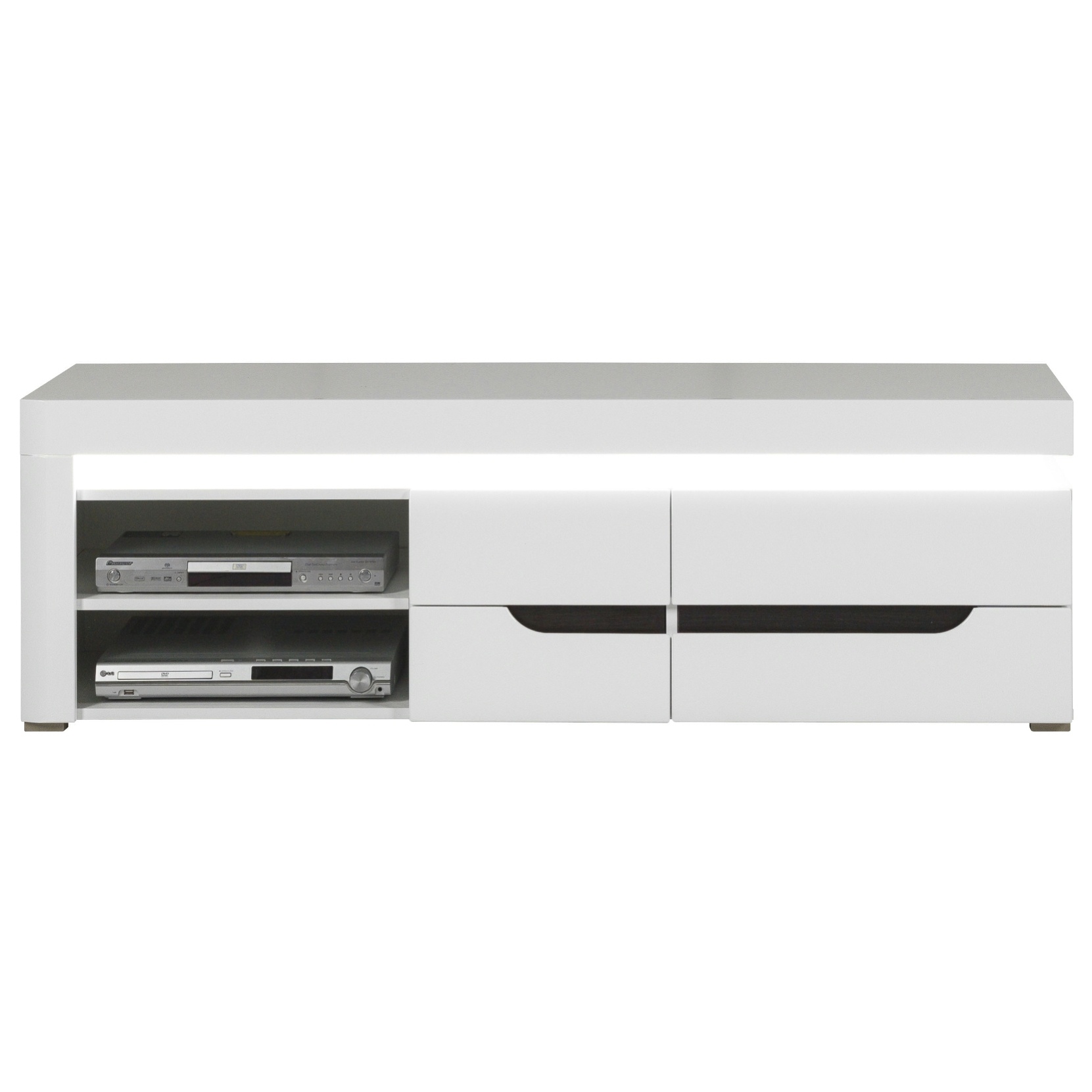 Elegantný TV stolík IVONA je vyrobený z kvalitného lamina a MDF, jeho celkový vzhľad navyše podtrhuje moderné LED osvetlenie. Úložný priestor je rozčlenený na otvorený úložný priestor s jednou vloženou policou, ideálne na uloženie audio zariadenia. Za dvojicou dvierok s tichým dovieraním sa nachádza ďalší úložný priestor. V oblasti rúčok si možno individuálne zvoliť lištu v bielej farbe alebo v dekore duba maggia. Hrany TV stolíka sú vybavené ABS hranami. Laminovaný materiál vďaka ľahkej údržbe a svojim odolným vlastnostiam zaistí dlhú životnosť. Nohy TV stolíku sú plastové s možnosťou regulácie.