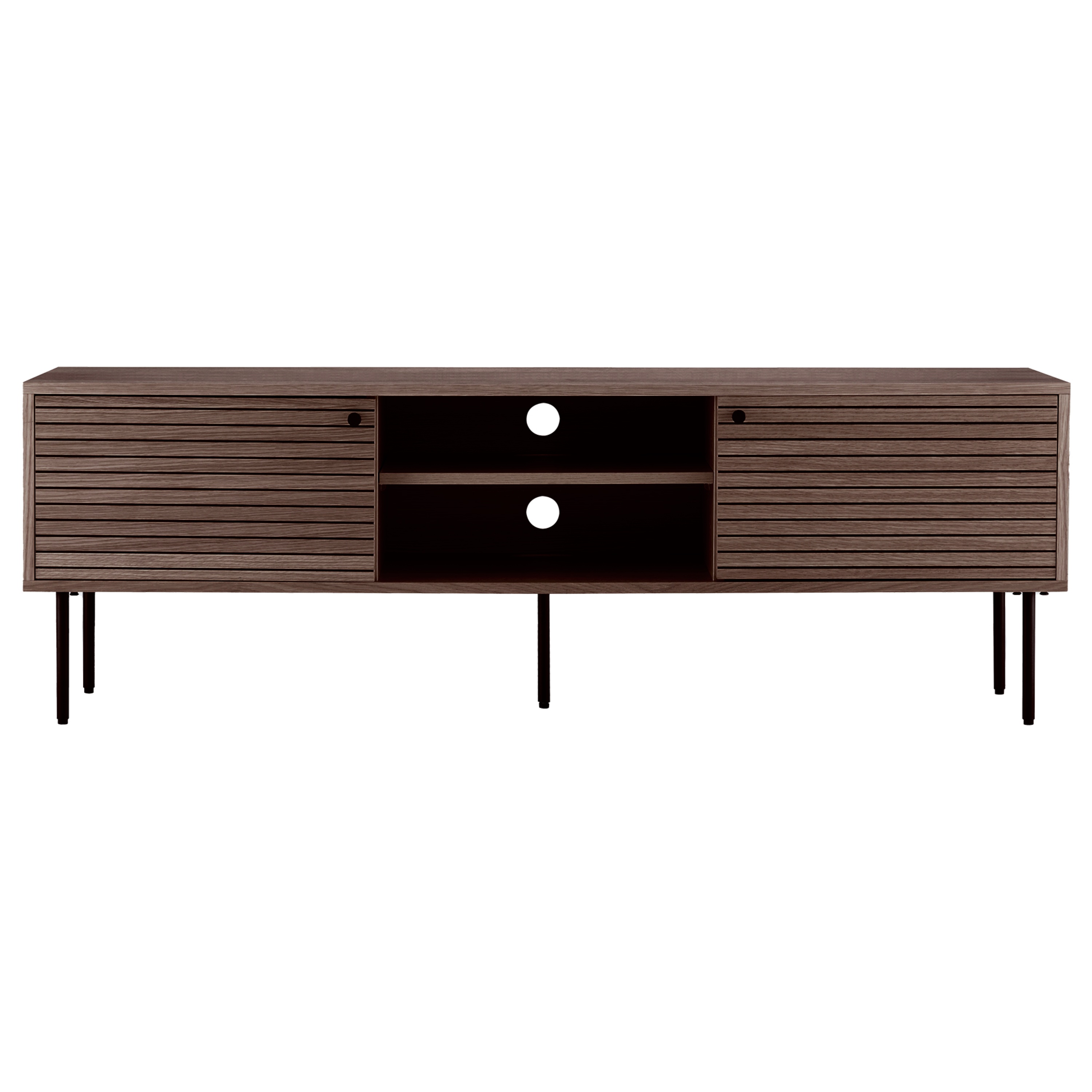 Konštrukcia je vybavená uzatvárateľnými úložnými priestormi s otočnými dverami, ktorých ľahké otváranie umožňujú drobné rúčky. Ďalej ponúka otvorený priestor s vloženou policou a otvory na kabeláž na zadnej strane. Celkový vzhľad stolíka zvýrazňujú úzke, kovové nôžky v čiernej farbe. Konštrukcia je vyrobená z ľahko udržiavateľnej laminovanej drevotriesky v kombinácii s MDF materiálom a dubovou dyhou.