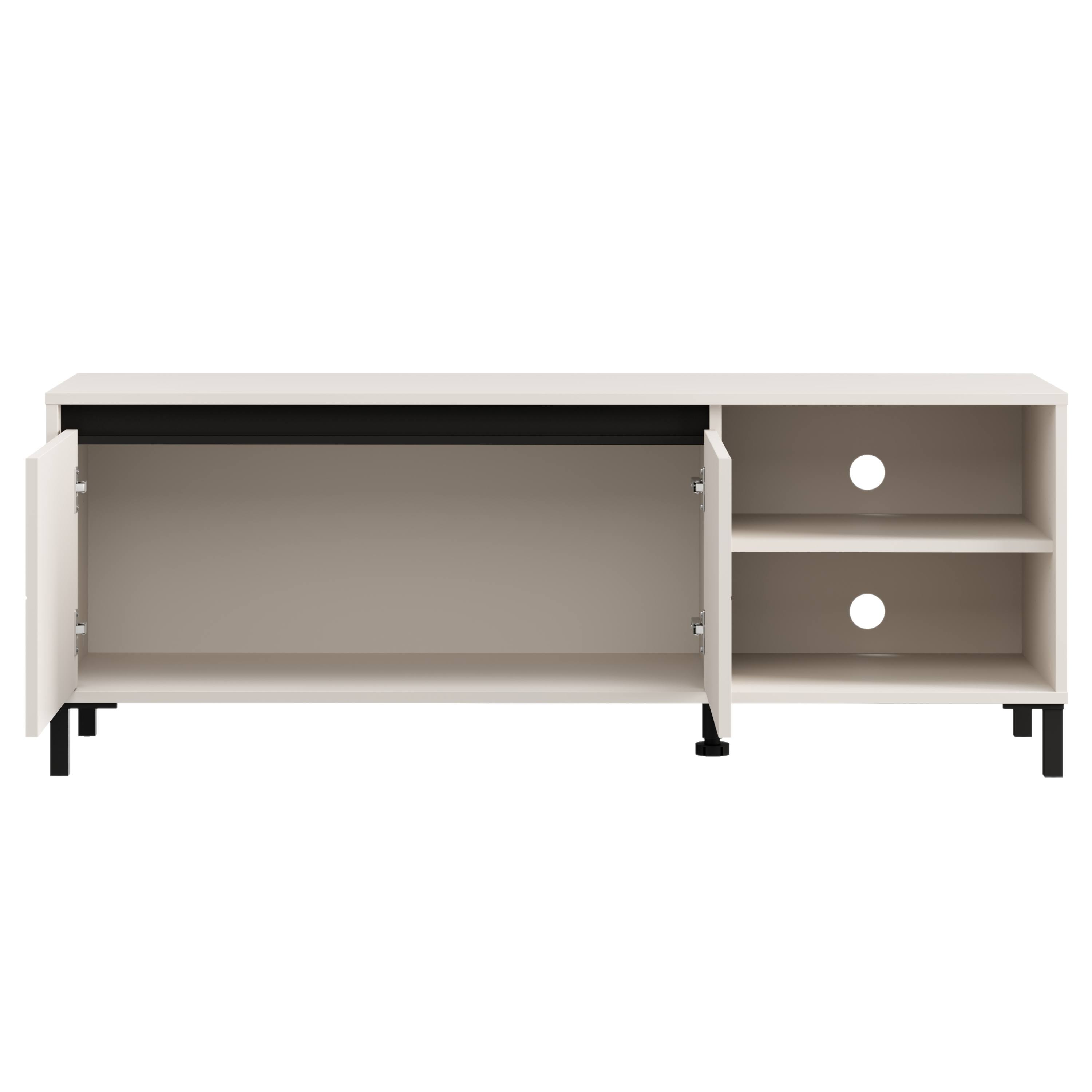 Jeho súčasťou je uzatvárateľný priestor za otočnými dverami, kam uložíte všetko, čo chcete mať skryté a zároveň vždy poruke. Stolík ďalej ponúka otvorený priestor s vloženou policou a praktickými otvormi na nenápadné vedenie kabeláže. Stolík je vyrobený z materiálu nenáročného na údržbu.