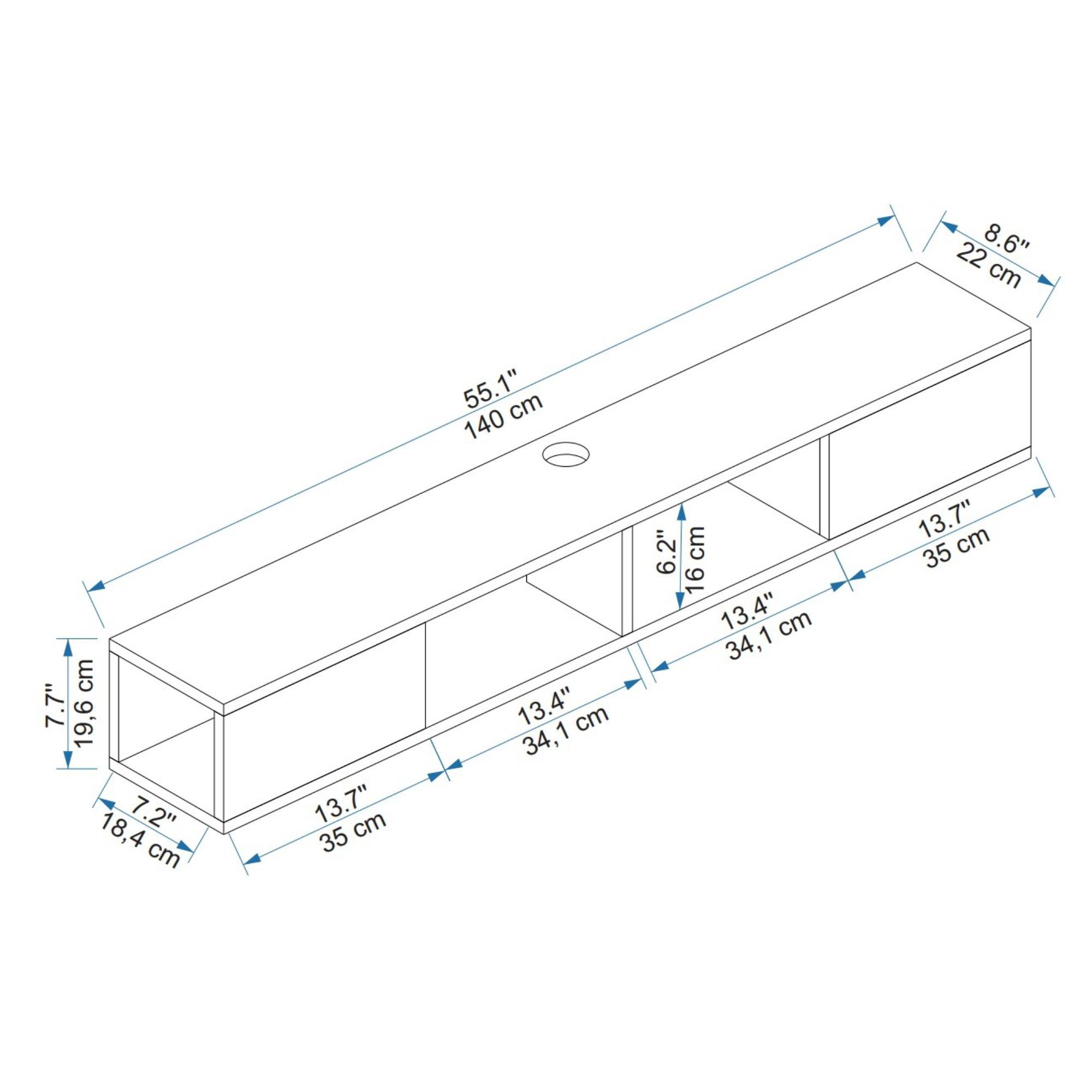 Disponuje otvoreným úložným priestorom, ktorý vytvára 2 oddelené bunky. Tie vytvárajú miesto na odloženie ovládačov či vystavenie dekorácií. Vrchná doska so šírkou 140 cm je vybavená otvorom na kabeláž. Vďaka nástennému vyhotoveniu ho možno umiestniť tak, ako vám to najlepšie vyhovuje. Vyhotovenie bez úchytiek a nožičiek perfektne podčiarkuje jeho čistý dizajn. Vďaka tomu sa bude ľahko kombinovať s ďalšími doplnkami v interiéri.