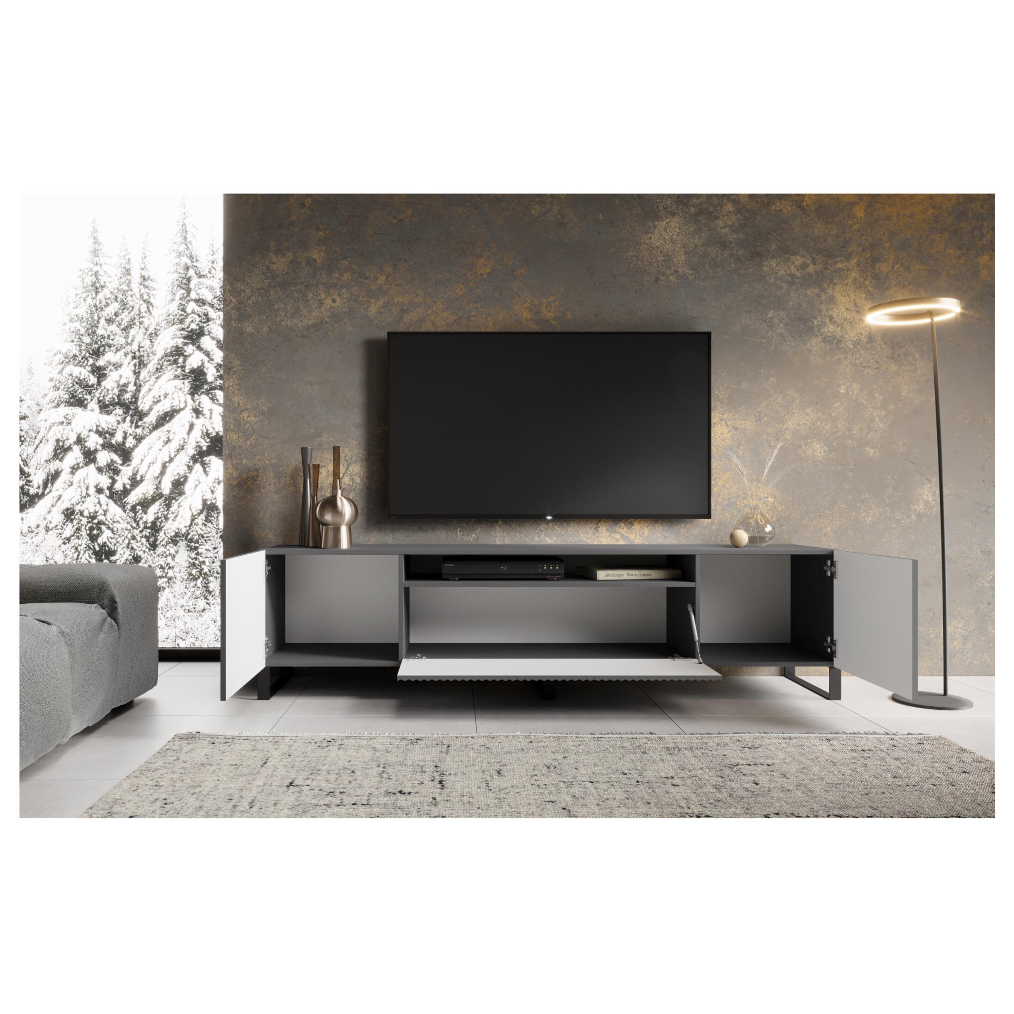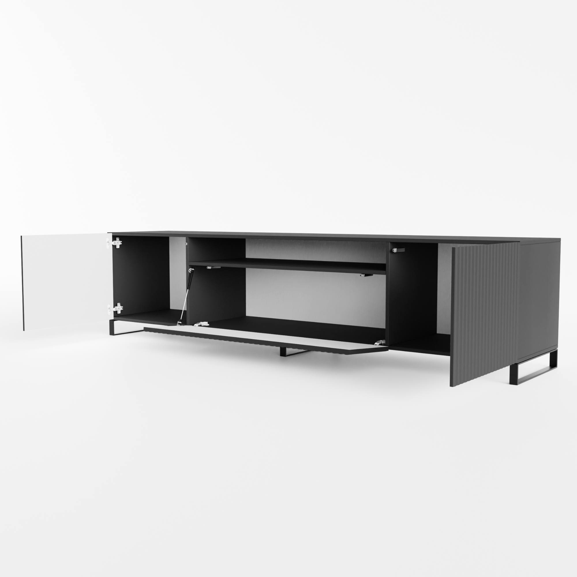 TV stolík ponúka dostatok úložného priestoru, ktorý je uzatvárateľný 2 otočnými a 1 výklopnými dvierkami**. Poskytne tak miesto nielen pre TV príslušenstvo, ale aj ďalšie veci, ktoré v obývačke potrebujete mať po ruke.