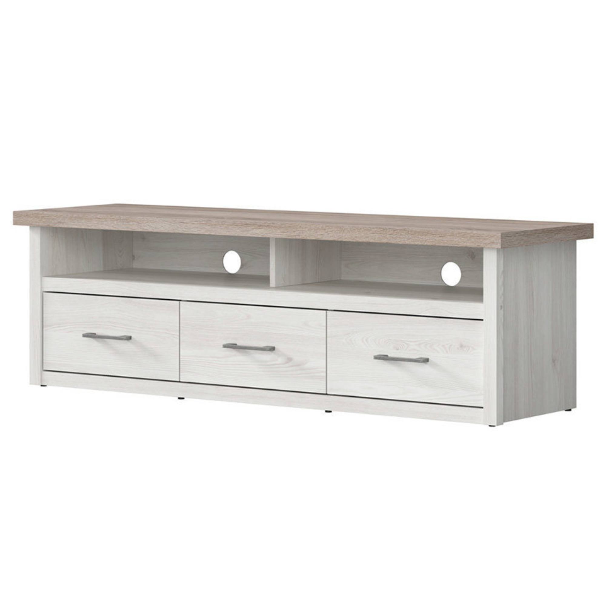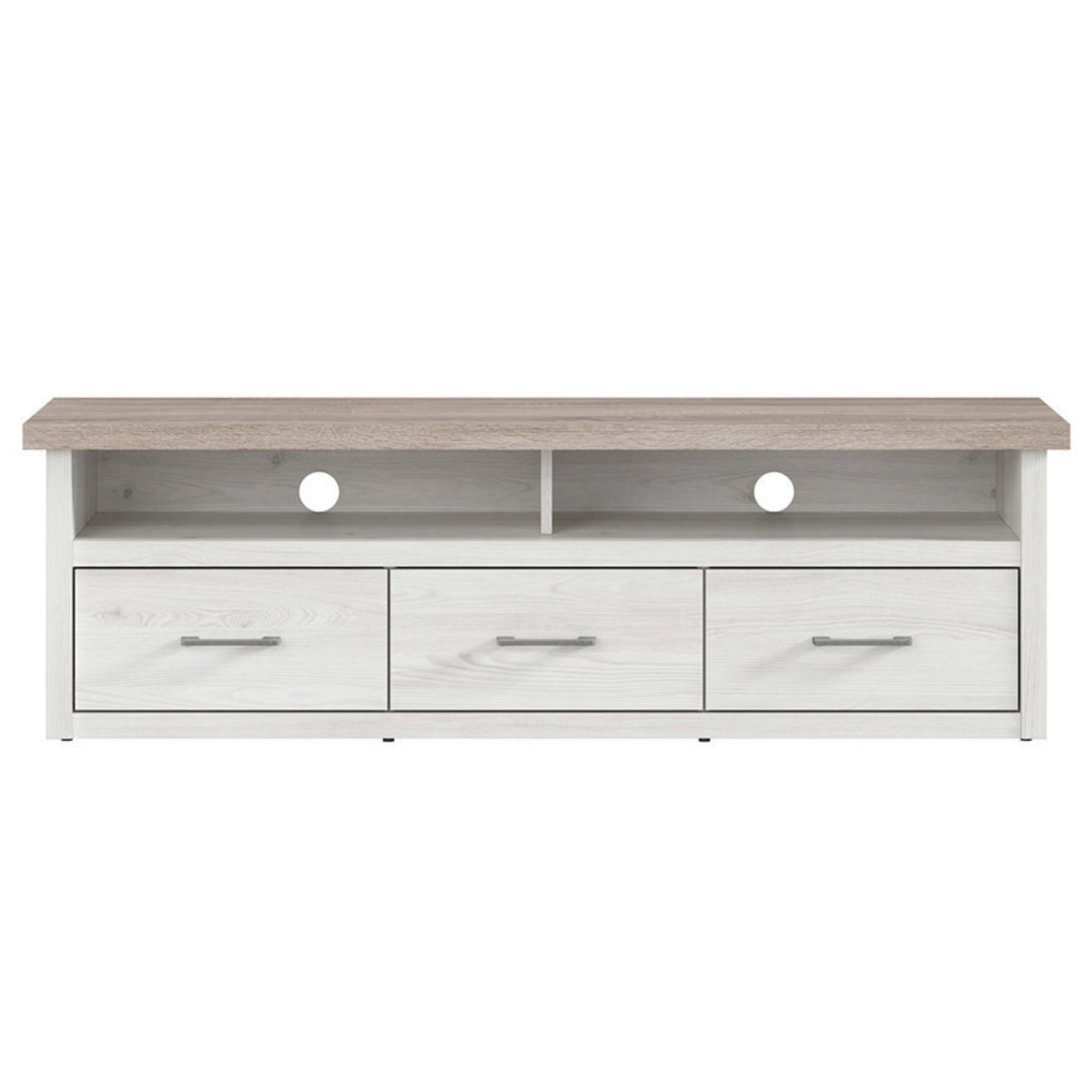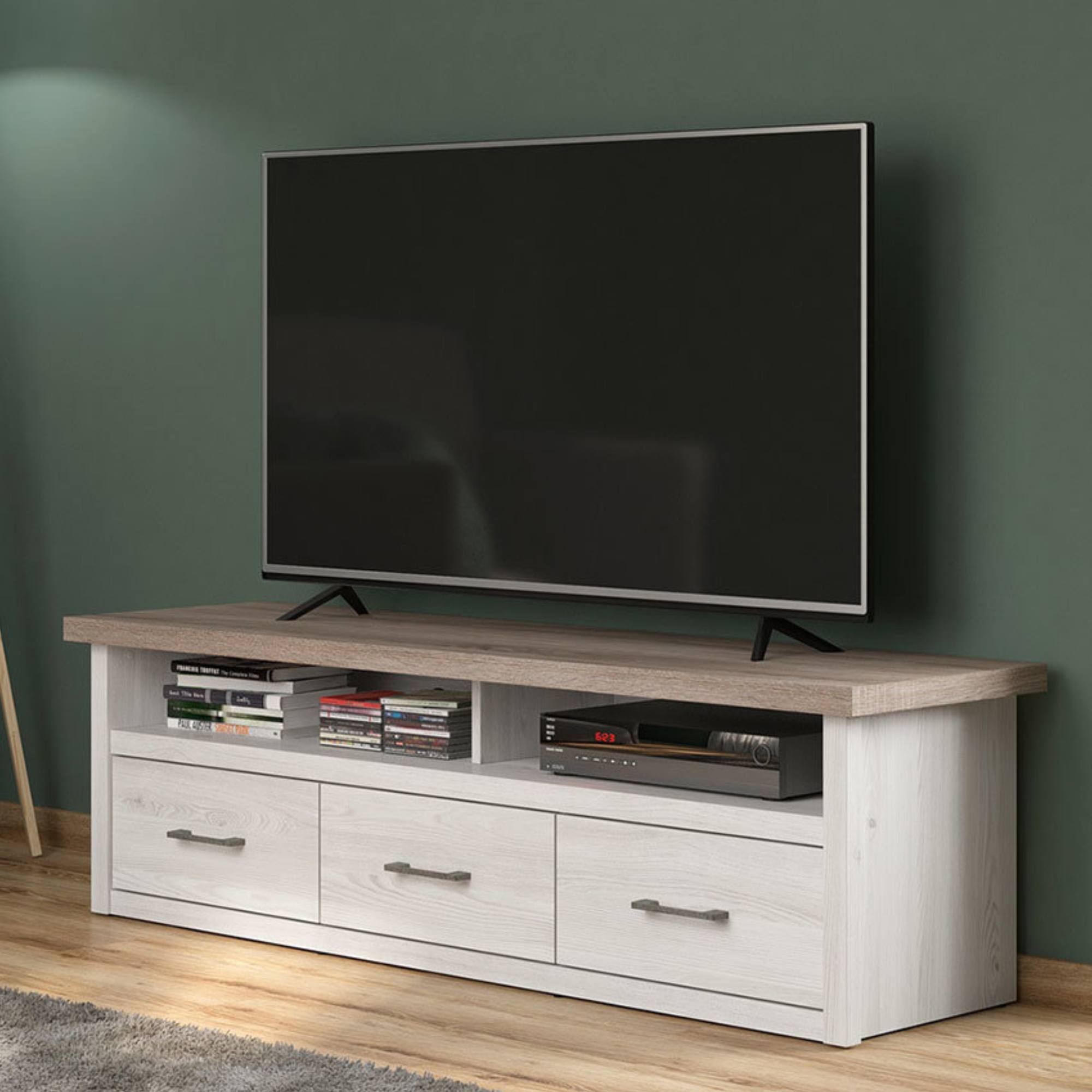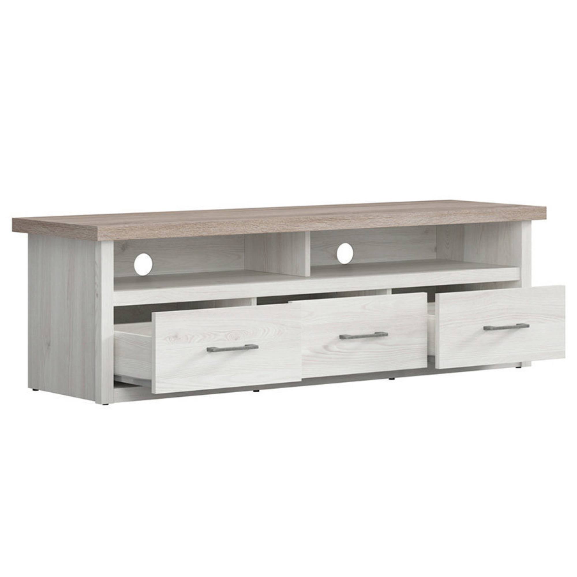 Tento praktický TV stolík vo vidieckom štýle je vyrobený z odolného lamina v príjemnej kombinácii dekorov bielej pínie a duba truffel. Rúčky majú farbu kovu. Obsahuje 3 zásuvky a 2 otvorené police.