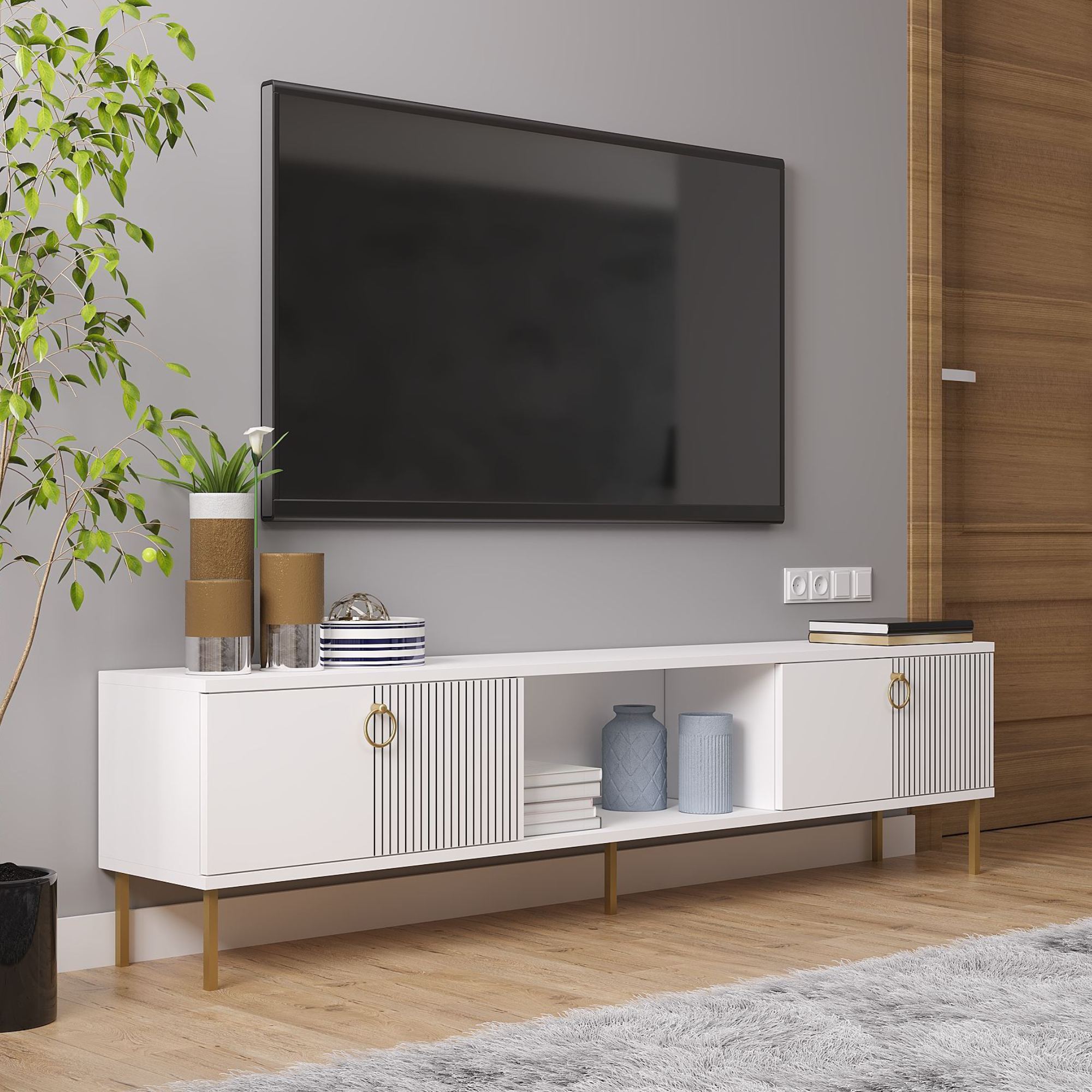 TV stolík ponúka dostatok úložného priestoru nielen pre TV príslušenstvo. Jeho dvierka sú pre lepšiu manipuláciu vybavené praktickými rúčkami. TV stolík má vysoké nohy, čo uľahčuje upratovanie pod ním.