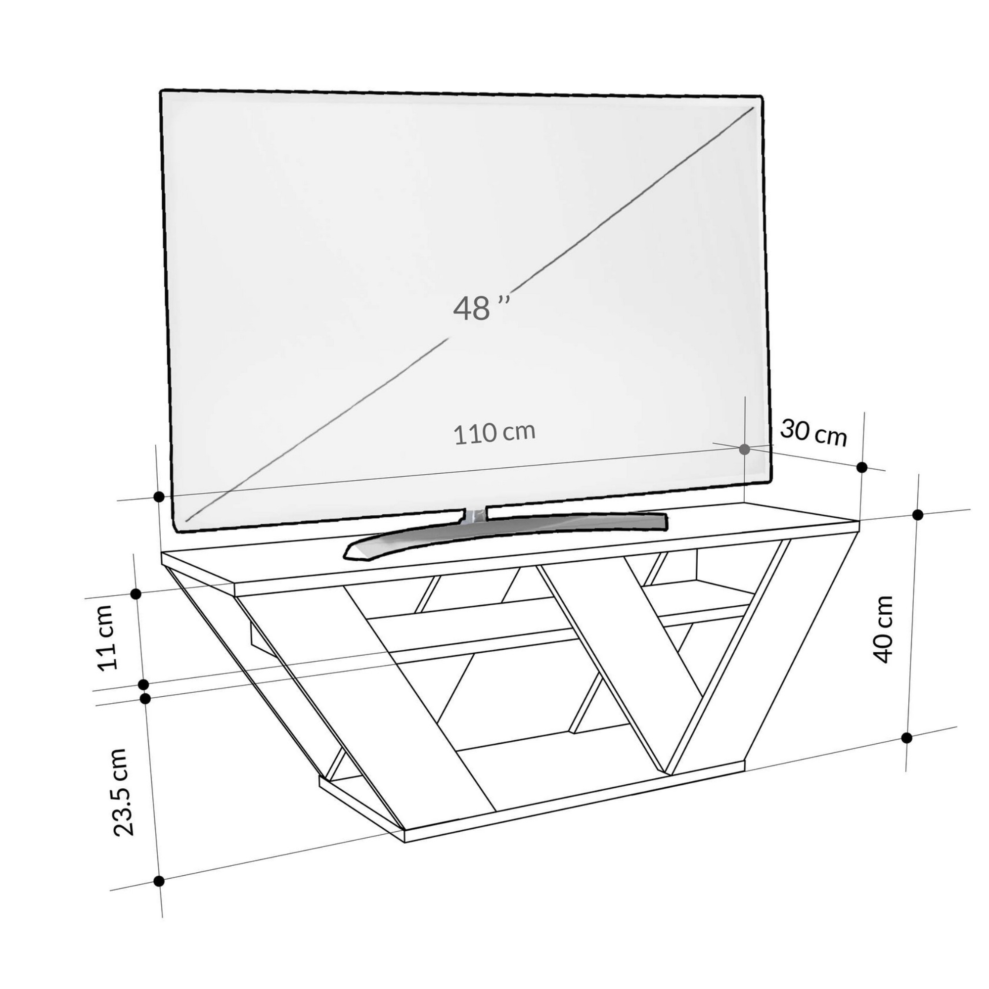 Horná doska stolíka so šírkou 110 cm okrem samotnej televízie pojme aj rôzne dekorácie. 1 vloženú policu zas môžete využiť priamo na TV príslušenstvo. Priestor pod policou ponúkne miesto na ďalšie predmety, ktoré si želáte vystaviť.