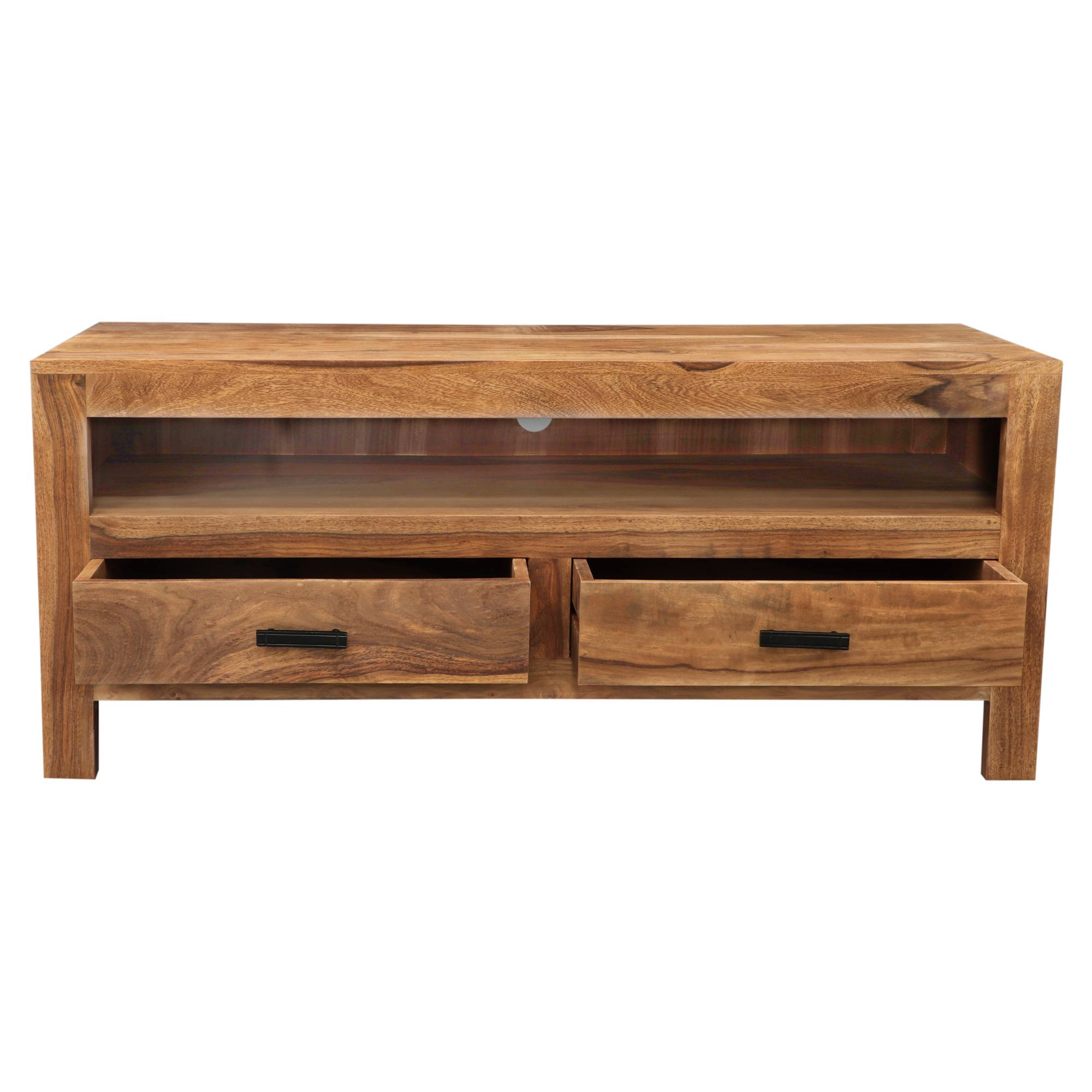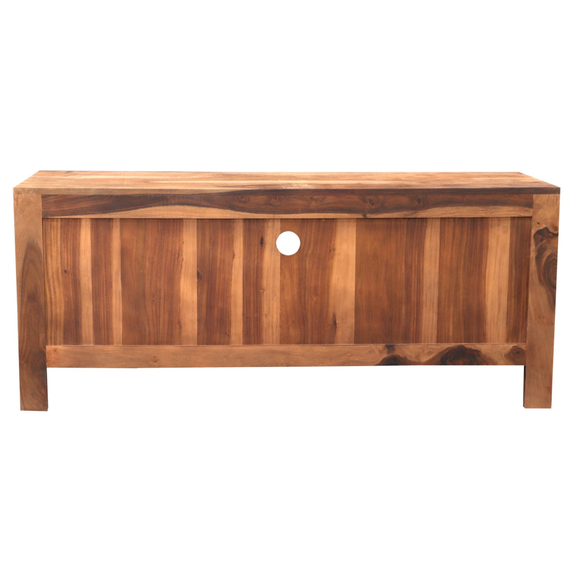 Je vyrobený z masívneho palisandrového dreva s charakteristicky tmavou farbou a krásnou výraznou kresbou, ktorú ešte viac zvýrazňuje morená povrchová úprava. Tá vytvára jeho orientálny dizajn a dodáva interiéru prírodný nádych. Vďaka unikátnej kresbe je každý kus originál. Palisander sa vyznačuje svojou pevnosťou a tvrdosťou, ktoré zaisťujú jeho stabilnú konštrukciu. Disponuje 2 zásuvkami s úchytkami na pohodlnú manipuláciu. Nad zásuvkami nájdete ďalší otvorený úložný priestor s otvorom na káble, ideálny na umiestnenie DVD prehrávačov, set-top boxov či iných zariadení.