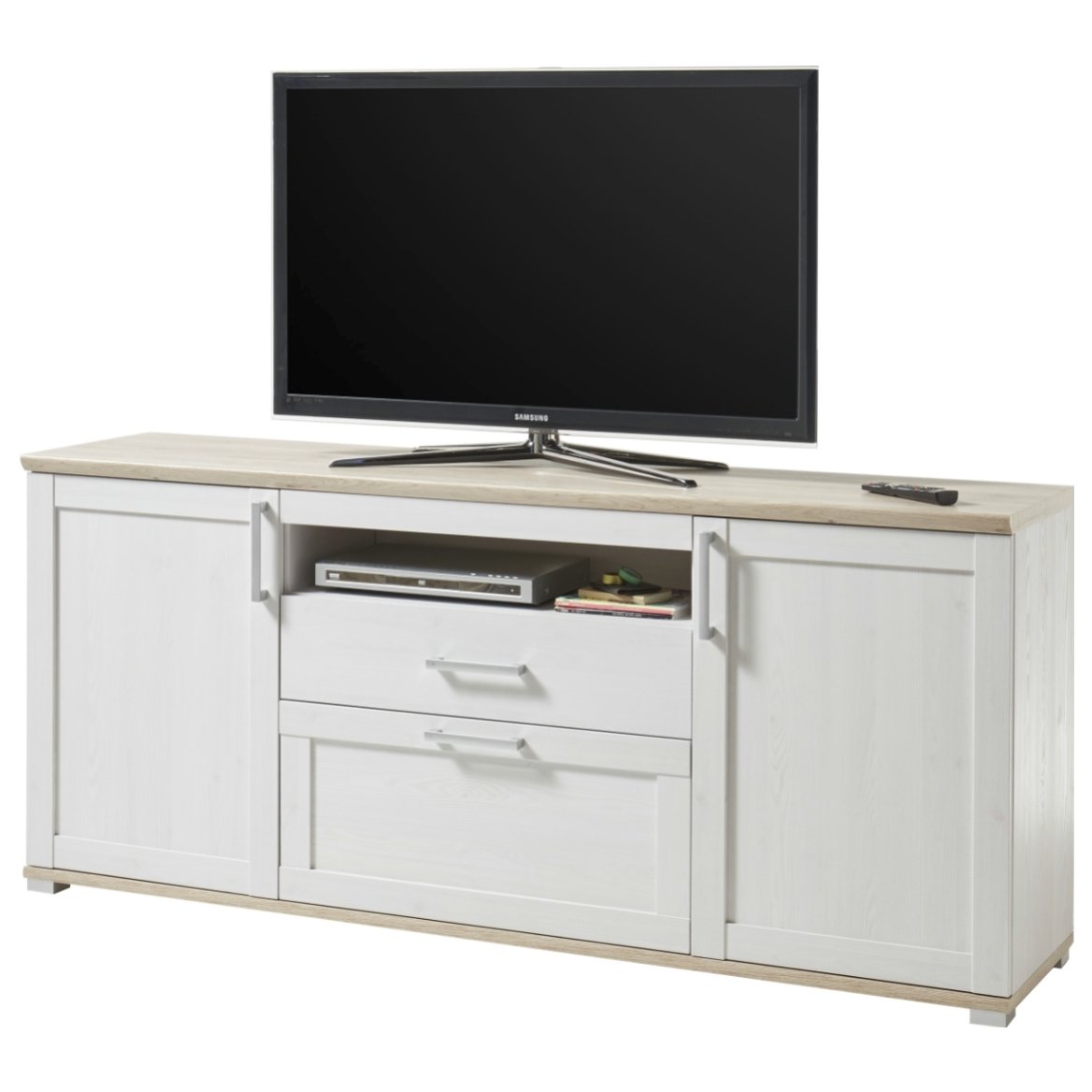 Elegantná TV komoda ROMANCE je vyrobená v romantickom vintage dizajne. Jemná kombinácia drevených dekorov duba a smrekovca zapadne snáď do každého interiéru ladeného vo svetlých a pastelových tónoch, alebo do vidieckeho štýlu.