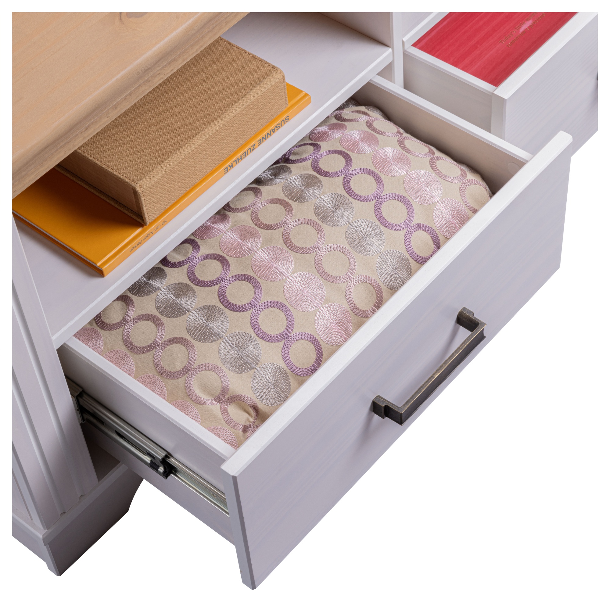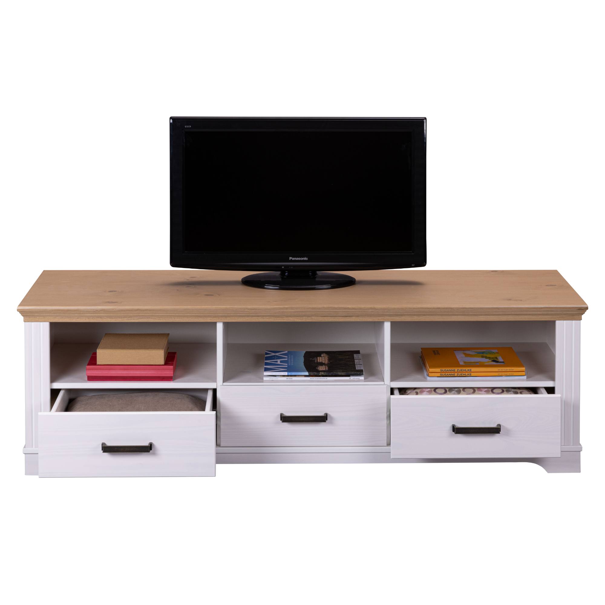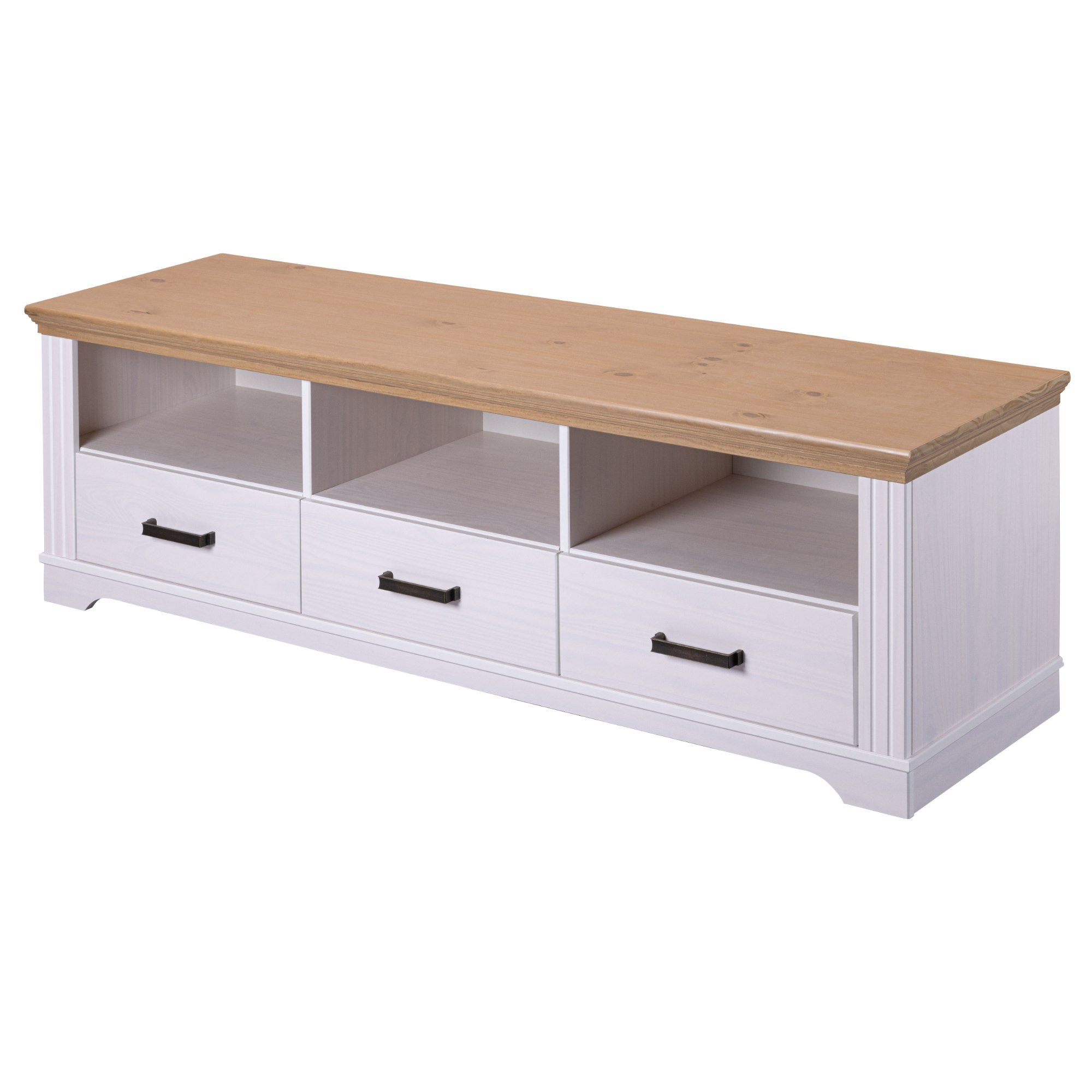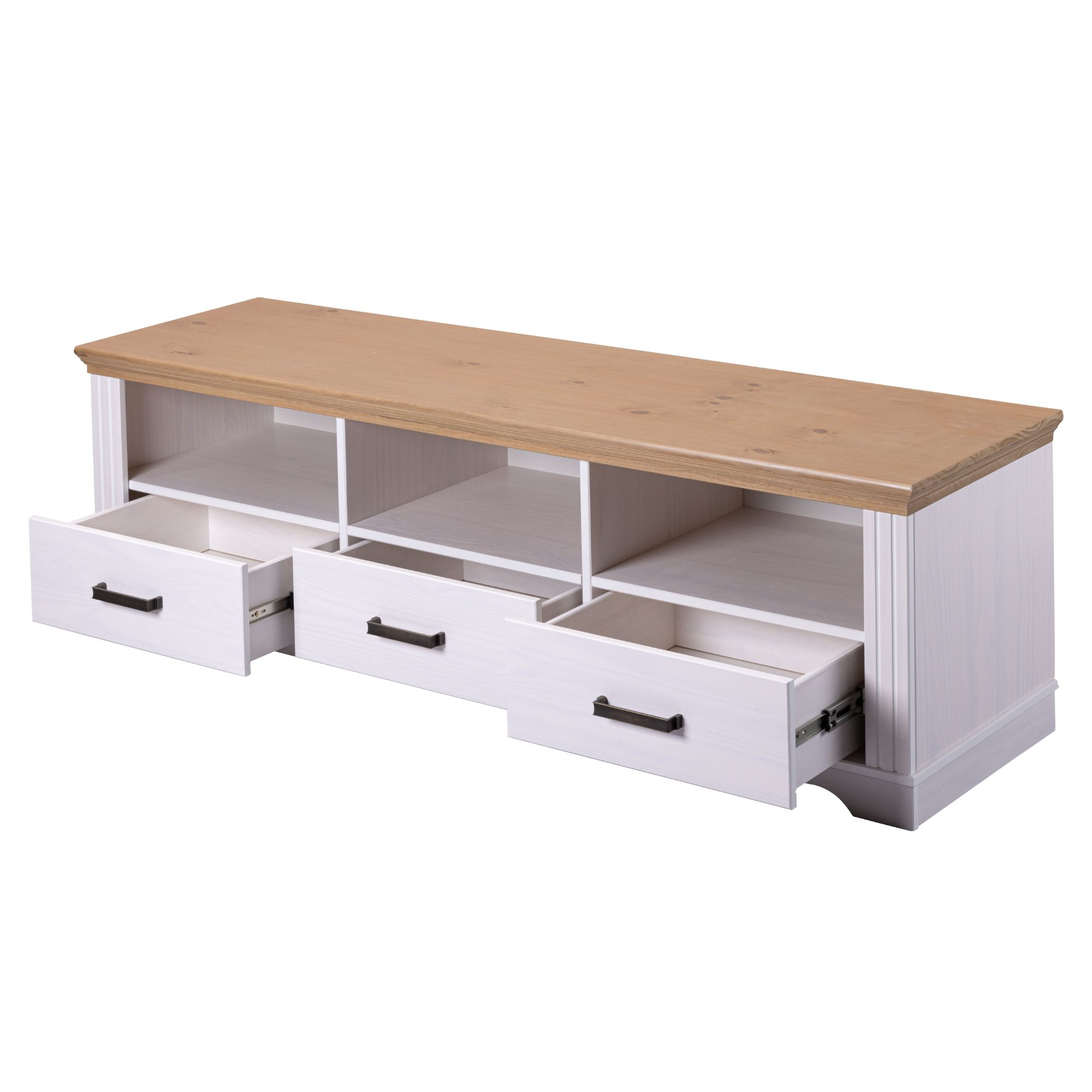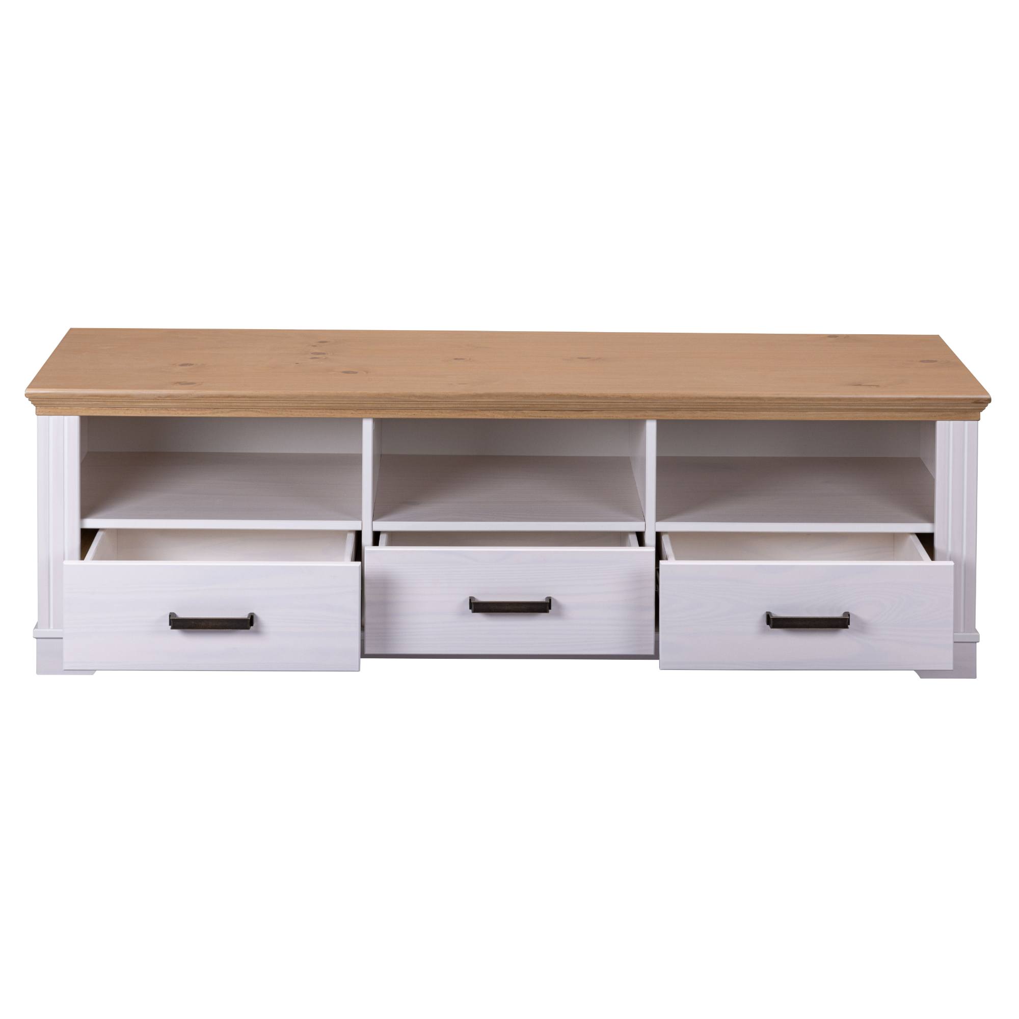 Prakticky riešená konštrukcia disponuje 3 priestrannými zásuvkami a 3 otvorenými odkladacími priehradkami. Stolík tak poskytuje dostatok miesta na uloženie všetkého TV príslušenstva a ďalších predmetov. Predné plochy zásuviek sú navyše vybavené kovovými medenými rúčkami na jednoduchú každodennú manipuláciu. Stolík je vyrobený z masívneho borovicového dreva, ktoré konštrukcii dodáva potrebnú pevnosť, odolnosť a dlhú životnosť.