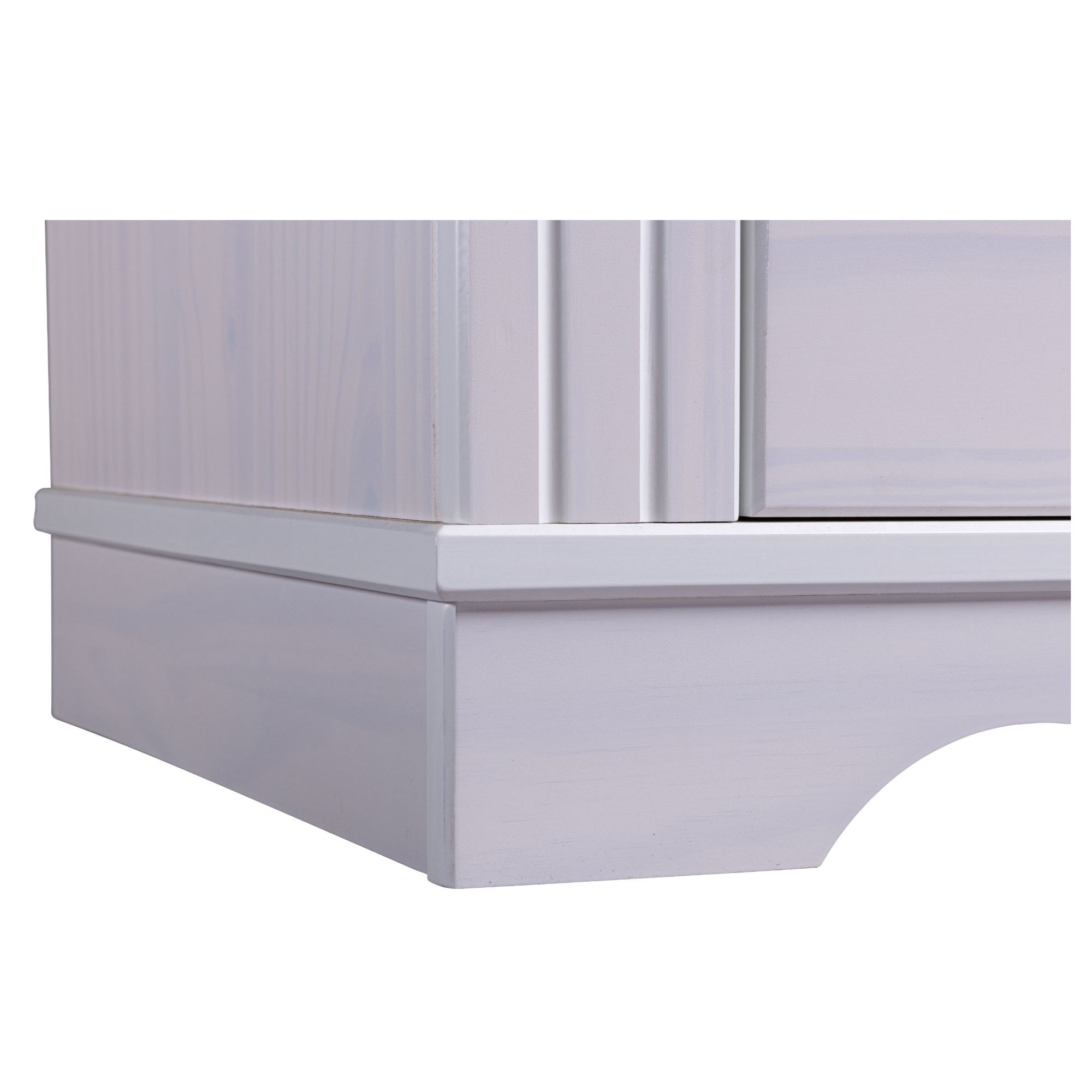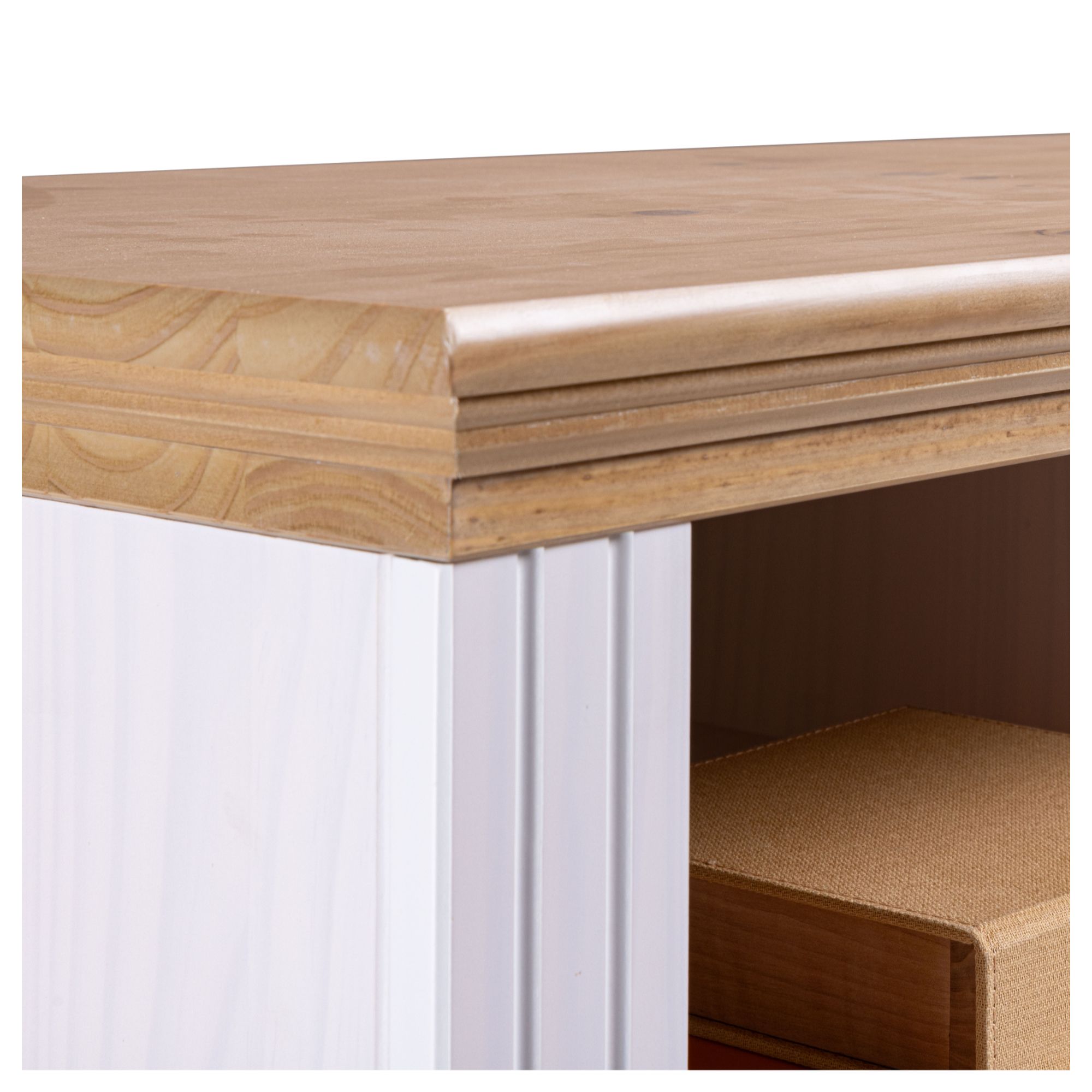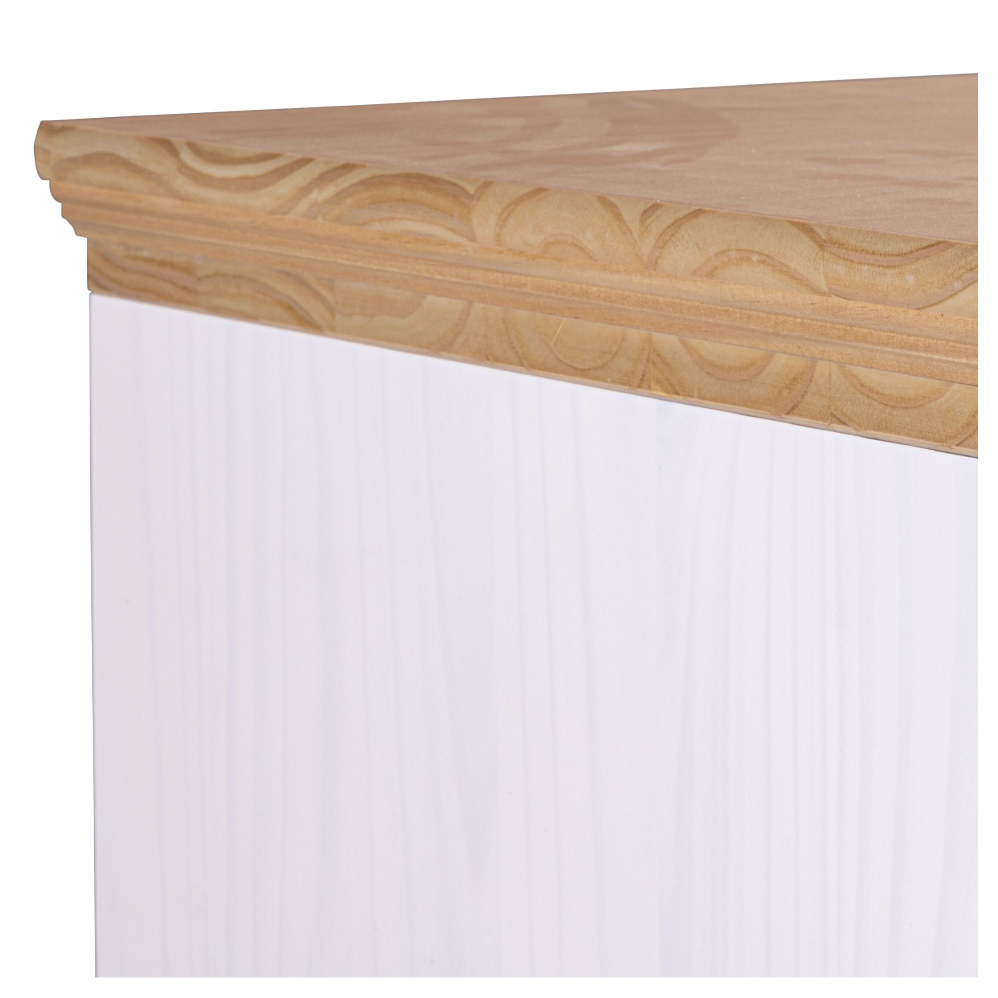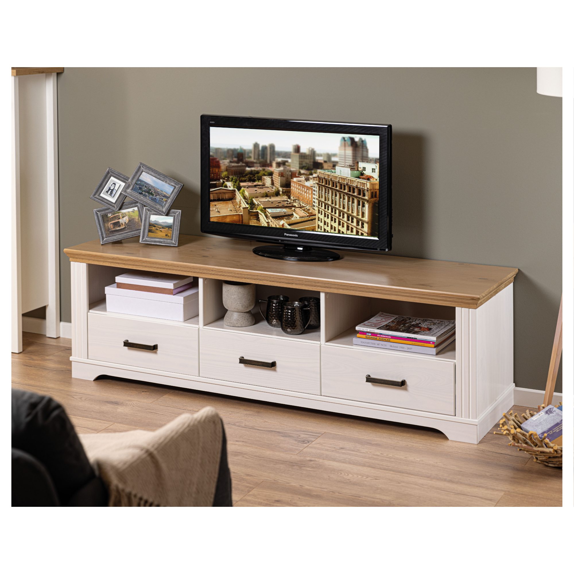 Nadčasový TV stolík SEYDIE vyhotovený v čistej a elegantnej kombinácii bielej a hnedej farby s množstvom dekoratívnych detailov je ideálnou voľbou do obývacích izieb inšpirovaných vidieckym štýlom.