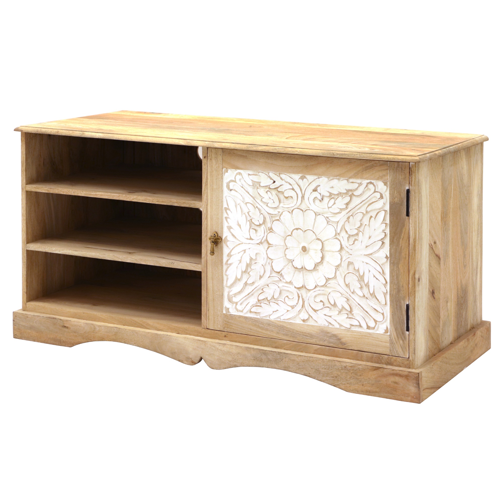 TV stolík SITAK 120 je ručne vyrezávaný z exotického mangového dreva v prírodnej povrchovej úprave, ktorá zvýrazňuje jeho pevnosť a kresbu dreva, čo robí každý kus nábytku jedinečným. Kombinácia hladkého dreva a vzorov v kriedovo bielej farbe dodáva stolíku osobitý boho štýl, ktorý upúta pozornosť v každom interiéri.