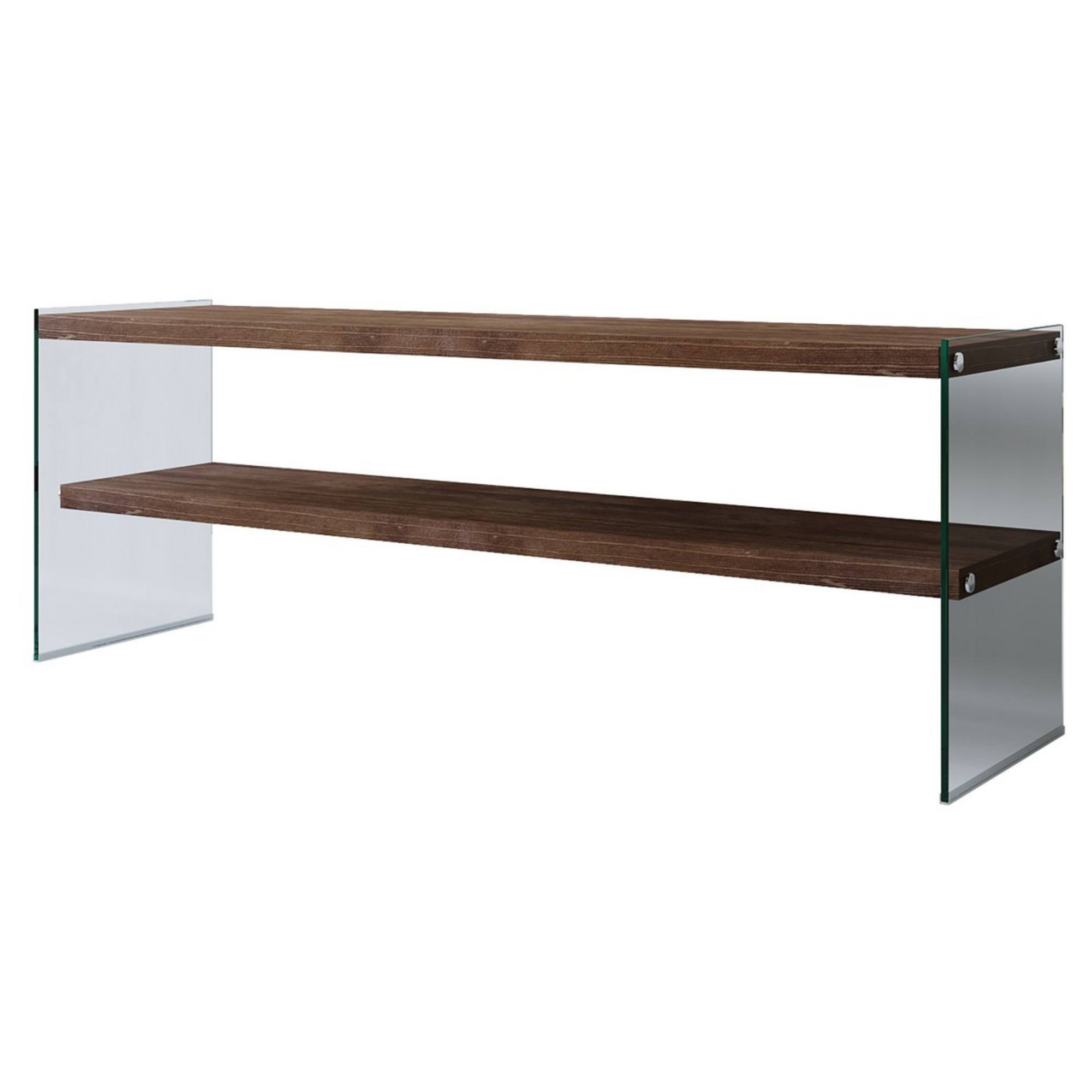 Stabilné nohy tohto TV stolíka sú vyrobené z tvrdeného skla. Horná doska a 1 vložená polica, z ktorých každá má nosnosť 20 kg, sú z masívneho borovicového dreva.
