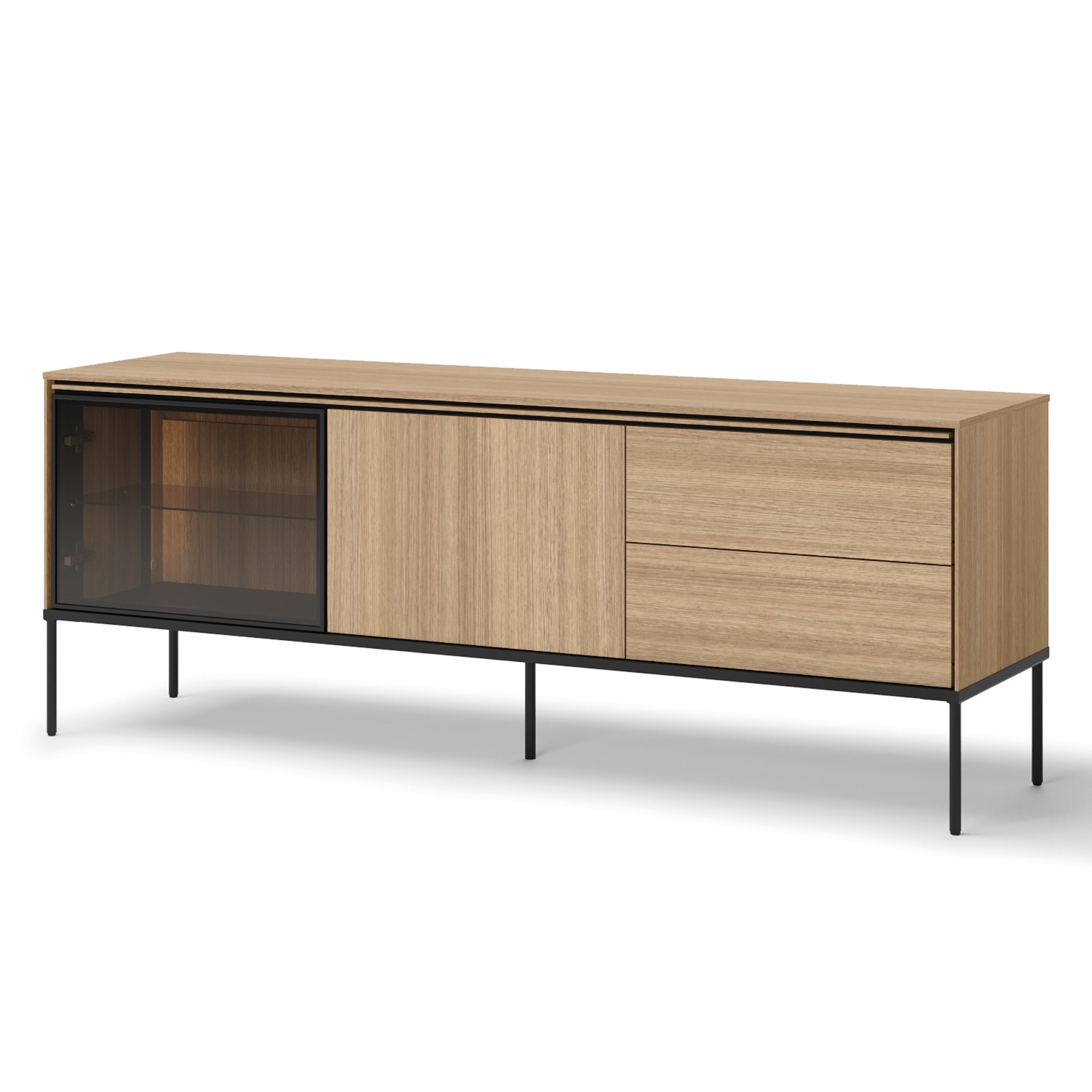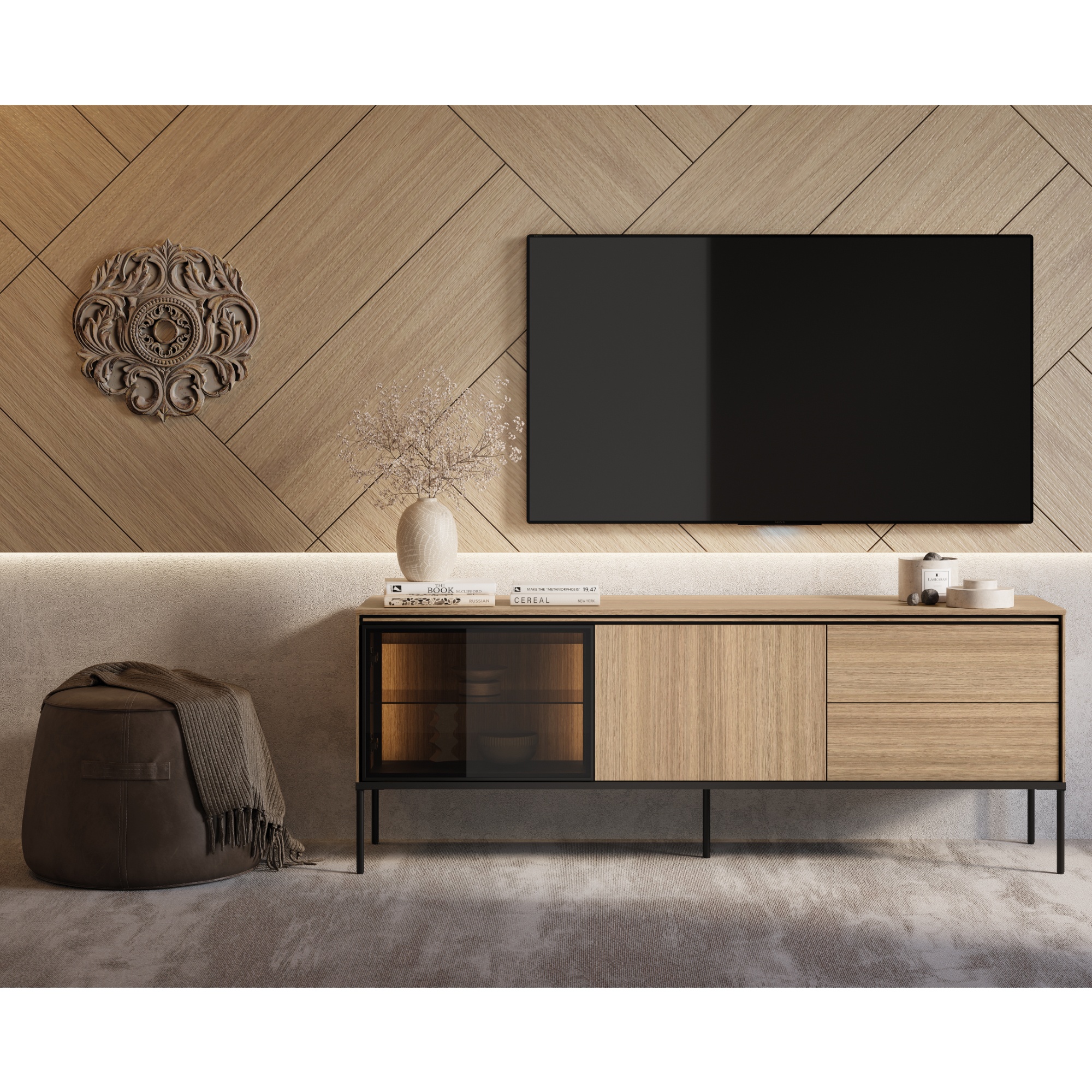 TV stolík poskytuje dostatok úložného priestoru nielen na TV príslušenstvo, ale umožňuje aj vystavenie vašich obľúbených dekorácií. Okrem 2 zásuviek, do ktorých si môžete uložiť rôzne drobnosti, disponuje aj 2 vloženými policami, z ktorých 1 je zo skla. Aby predmety vystavené za presklenými dvierkami mohli naplno vyniknúť, je TV stolík vybavený štýlovým LED osvetlením.