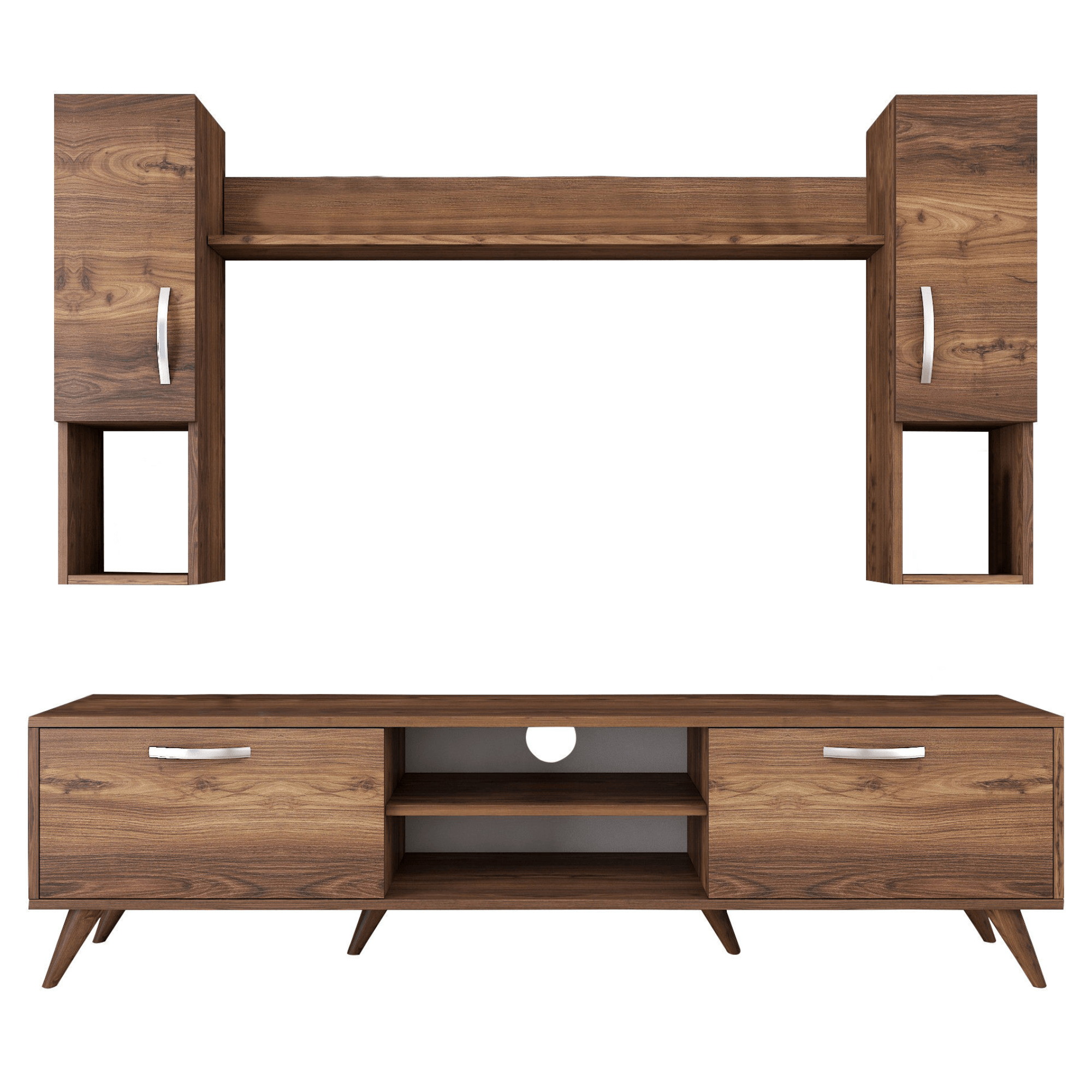 Široká TV komoda prakticky kombinuje otvorené a uzatvárateľné úložné priestory. Ľavá aj pravá strana sú identické a otvárajú sa pomocou výklopných dverí. Prostredná otvorená časť obsahuje 1 priestrannú vloženú policu a otvor na kabeláž na zadnej strane. Všetky tieto prvky spoločne vrchnou odkladacou doskou utvárajú ideálne zázemie na uloženie všetkého TV príslušenstva. Komodu podopierajú výrazné, kónické nohy. Nástenná časť pozostáva z 2 identických skriniek a samostatnej nástennej police. Každá nástenná skrinka obsahuje 2 vložené police a je čiastočne uzatvárateľná. Samostatná polica skrinky prepája a vytvára odkladací priestor na rastliny, fotografie a ďalšie dekorácie. Jednotlivé časti zostavy sú doplnené o strieborné rúčky pre ľahkú manipuláciu.