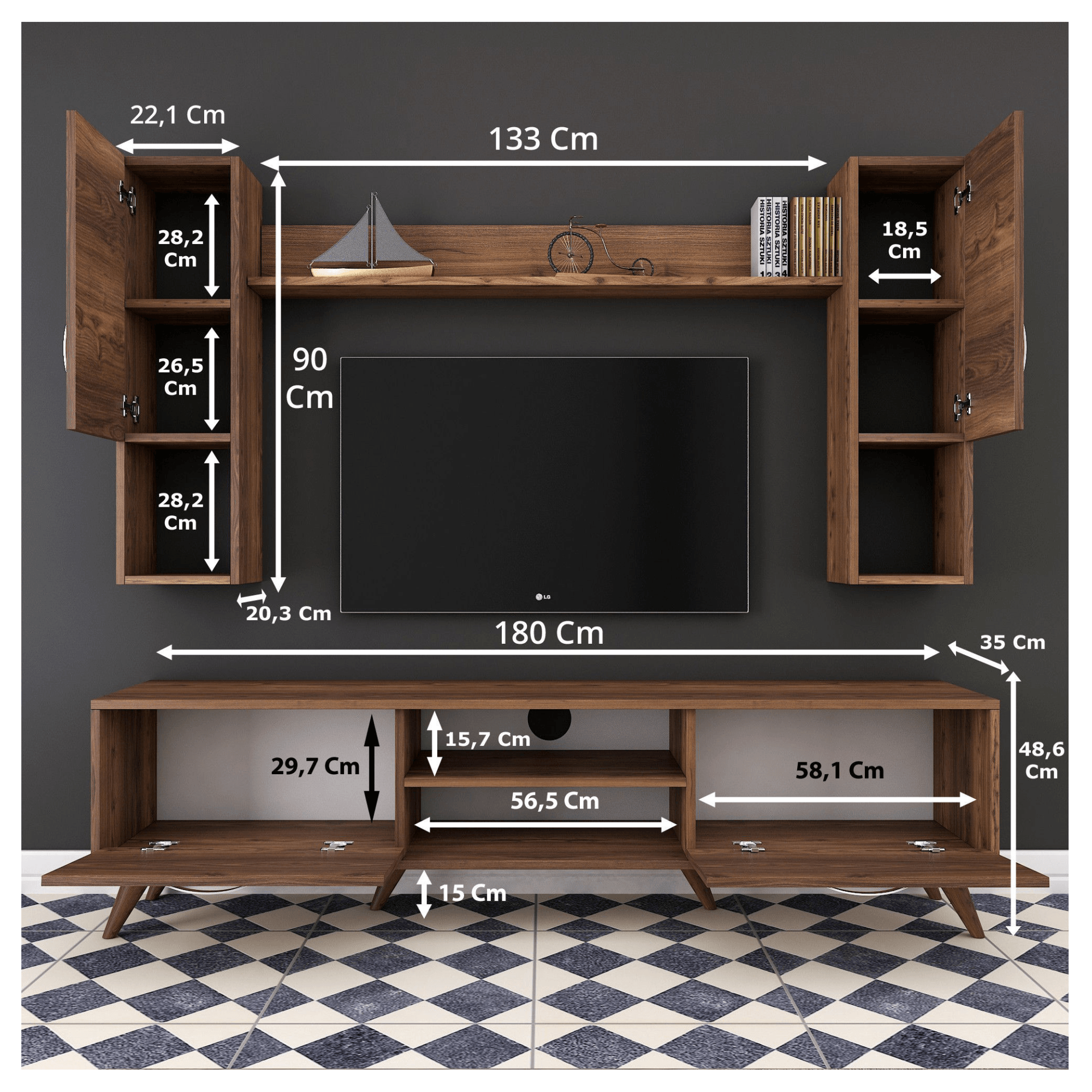 - Skladá sa z: TV komoda, 2x nástenná skrinka, nástenná polica