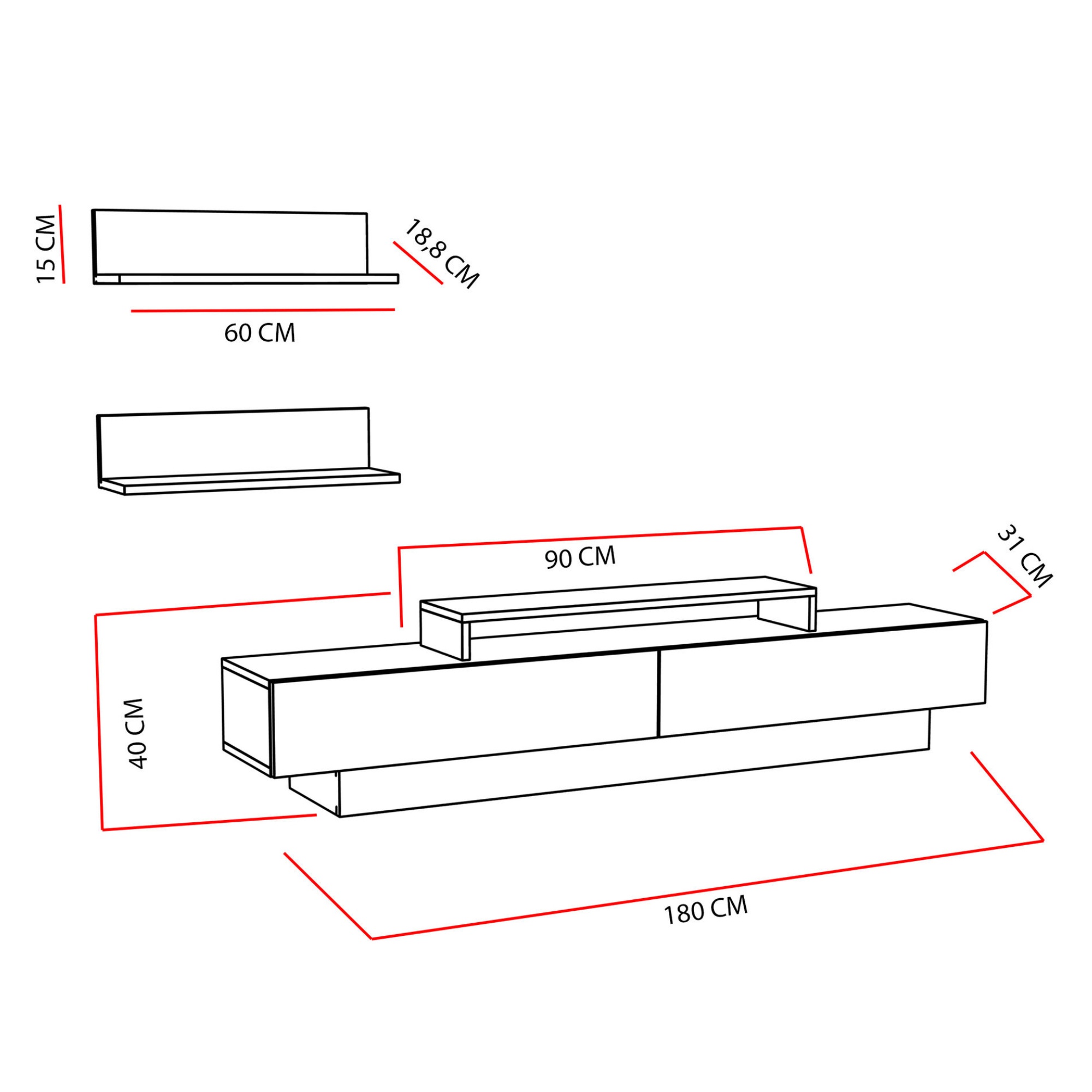 | Časť 1 (ŠxVxH) | Rozmery TV komody: 180x40x31 cm |