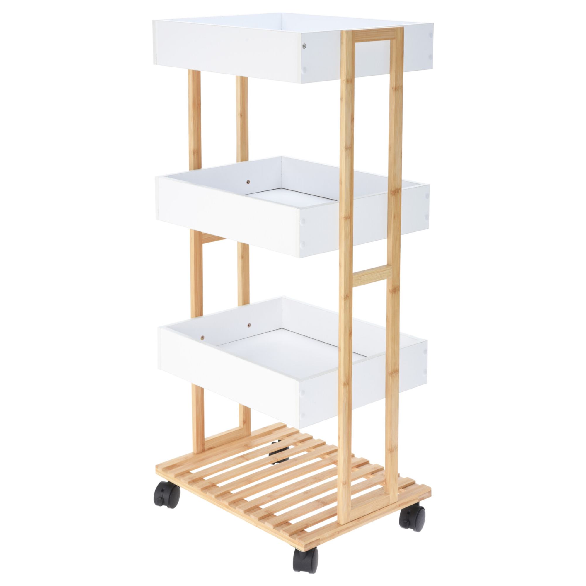Jeho konštrukcia z bambusového dreva prináša do vášho domova prírodný a elegantný vzhľad, zatiaľ čo biele lakované zásuvky z MDF materiálu dodávajú moderný a čistý dizajn, ktorý ľahko zapadne do akéhokoľvek štýlu interiéru. Regál disponuje 4 praktickými úložnými úrovňami. Horné 3 priestranné zásuvky sú ideálne na ukladanie drobností, kozmetiky či dekorácií, zatiaľ čo spodná roštová polica poskytuje ideálne miesto na textílie, ako sú uteráky, utierky alebo iné doplnky.