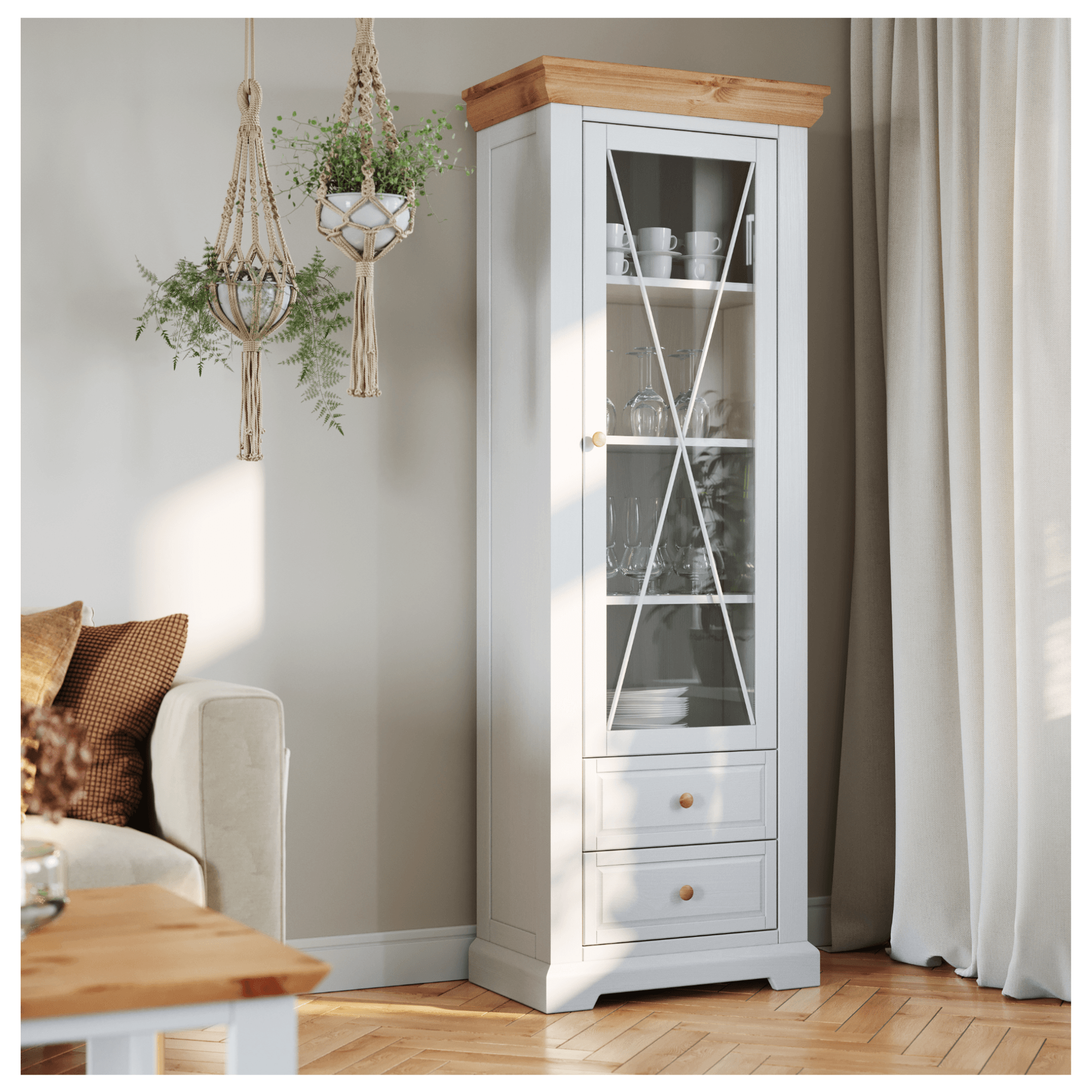 Úzka vitrína MARON vám umožní vystaviť suveníry z ciest či zberateľské predmety a zároveň prehľadne uschovať drobnosti dennej potreby. Vyrobená je z masívneho borovicového dreva, ktoré jej dodáva potrebnú odolnosť a pevnosť. Nadčasové biele vyhotovenie s detailom v prirodzenej farbe s ozdobnými prvkami ako je vrchná časť pripomínajúca antický pilaster, dekoratívne frézovanie alebo zaujímavo tvarovaná podstava dokonale odráža provensálsky štýl.