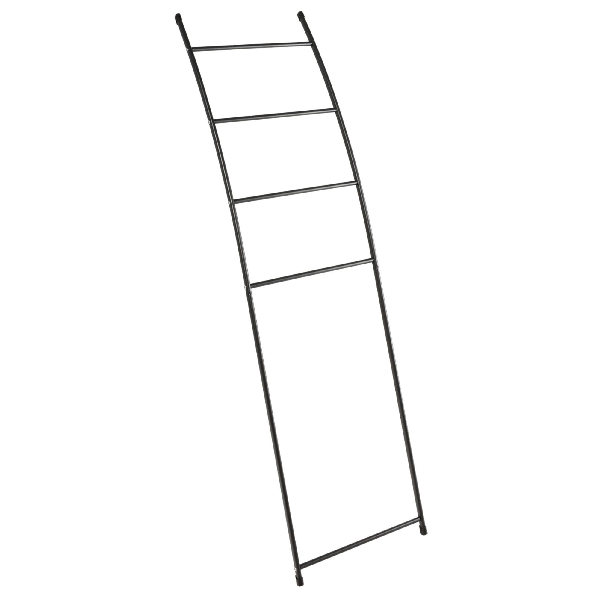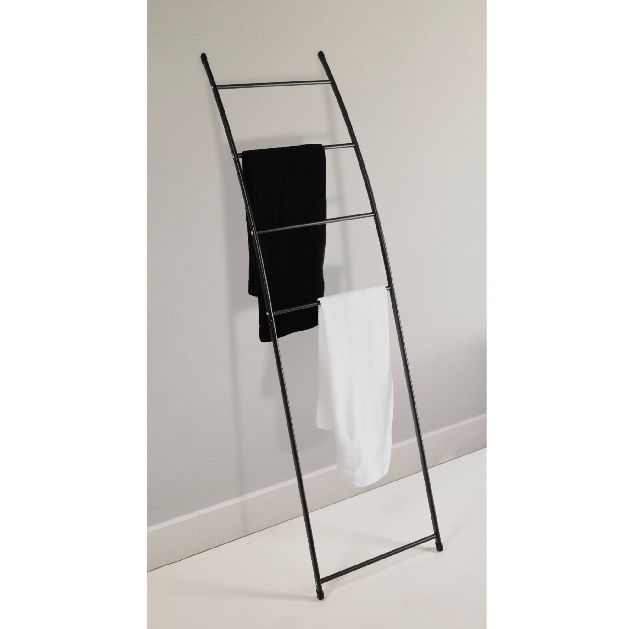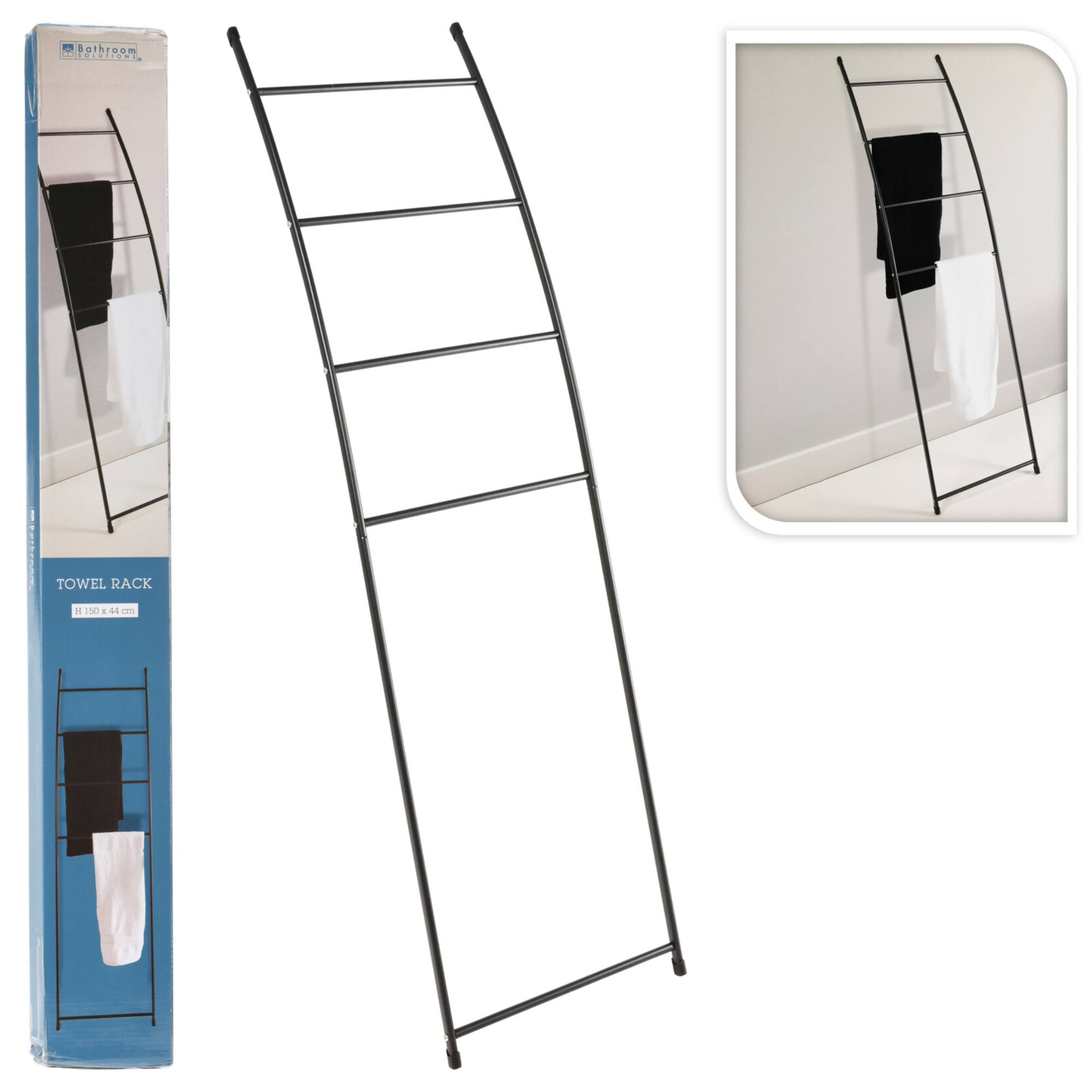 Kovový vešiak na uteráky PETE je nielen dizajnovým doplnkom, ale predovšetkým praktickým pomocníkom. Je lakovaný čiernou farbou a ponúka dostatok priestoru na uteráky, osušky aj oblečenie. Dodajte vašej kúpeľni týmto štýlovým stojanom nádych jednoduchosti a praktickosti. Na použitie je nutné vešiak oprieť o stenu.