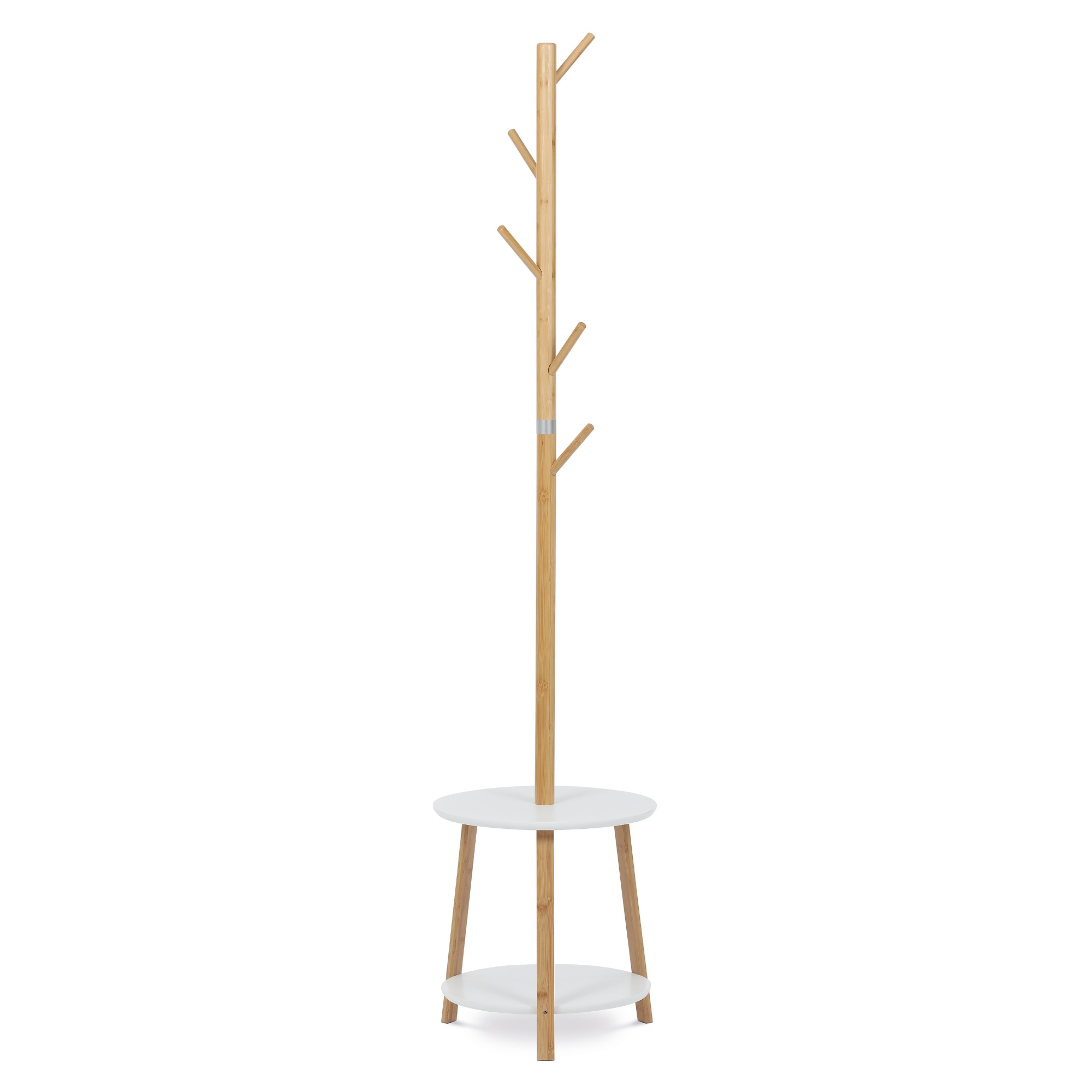 Konštrukcia je z masívneho bambusového dreva, pripomínajúca tvarom strom, bude originálnym a zároveň praktickým interiérovým doplnkom. V spodnej časti disponuje dvoma odkladacími policami v bielej farbe, ktoré poskytujú dodatočný úložný priestor na vaše topánky, tašky alebo dekorácie.