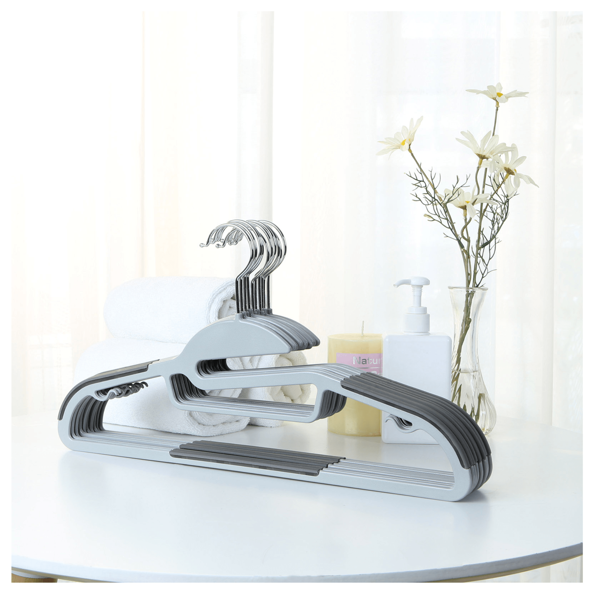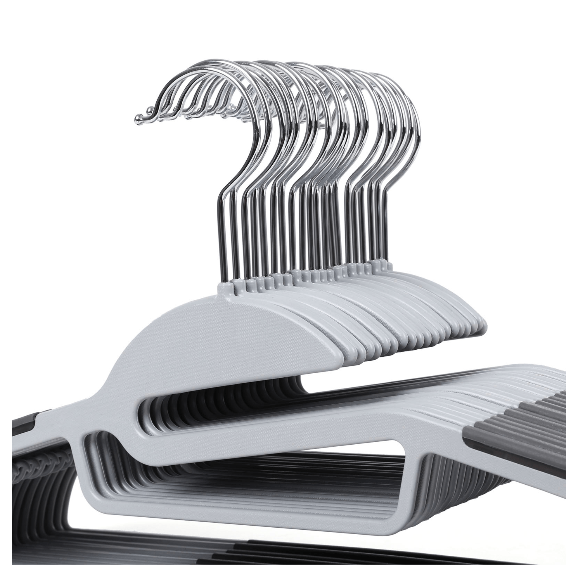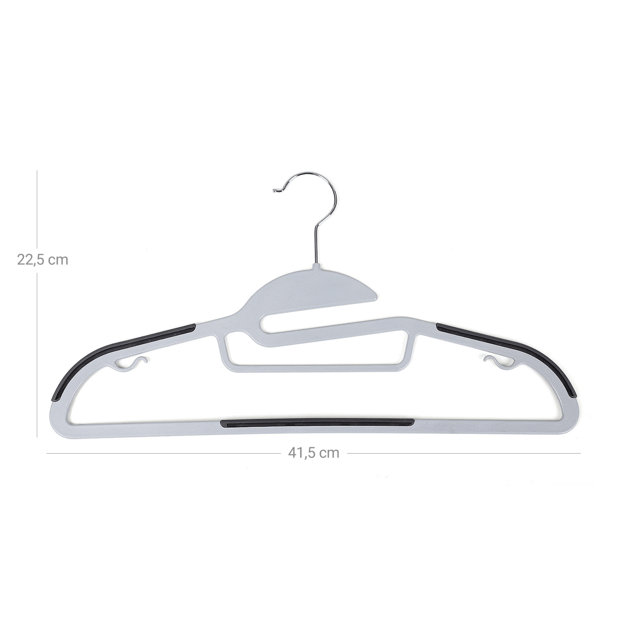 20 kusov vešiakov HANGER je vyrobených z plastu v kombinácii svetlo a tmavosivej farby. Na bokoch a uprostred odkladacej lišty sú vešiaky potiahnuté syntetickou gumou, vďaka ktorej nebude uložené oblečenie nepríjemne skĺzavať. Na bokoch z vnútornej strany sa nachádzajú drobné háčiky, umožňujúce zavesenie ramienkových topov, šiat alebo sukní. Plastovú konštrukciu dopĺňa kovový, otočný háčik, ktorý jednoducho otočíte o 360 ° a uľahčíte si každodenné používanie. Vďaka tenšiemu vyhotoveniu ušetríte cenné miesto a môžete do skrine uložiť viac oblečenia alebo ich ľahko použijete aj v užších skriniach.