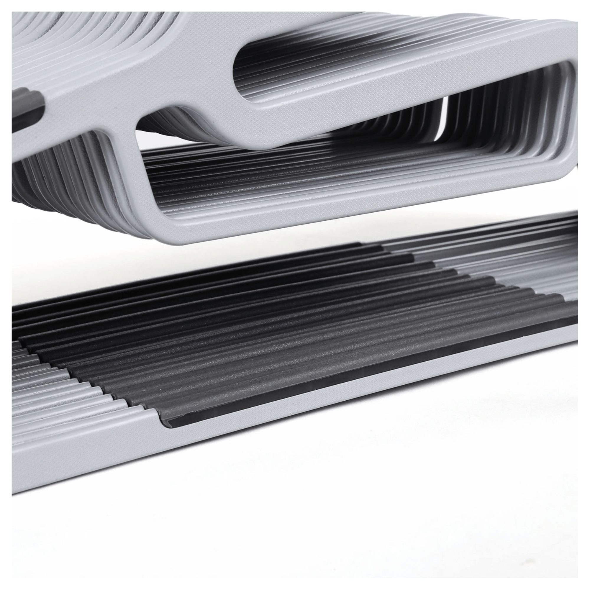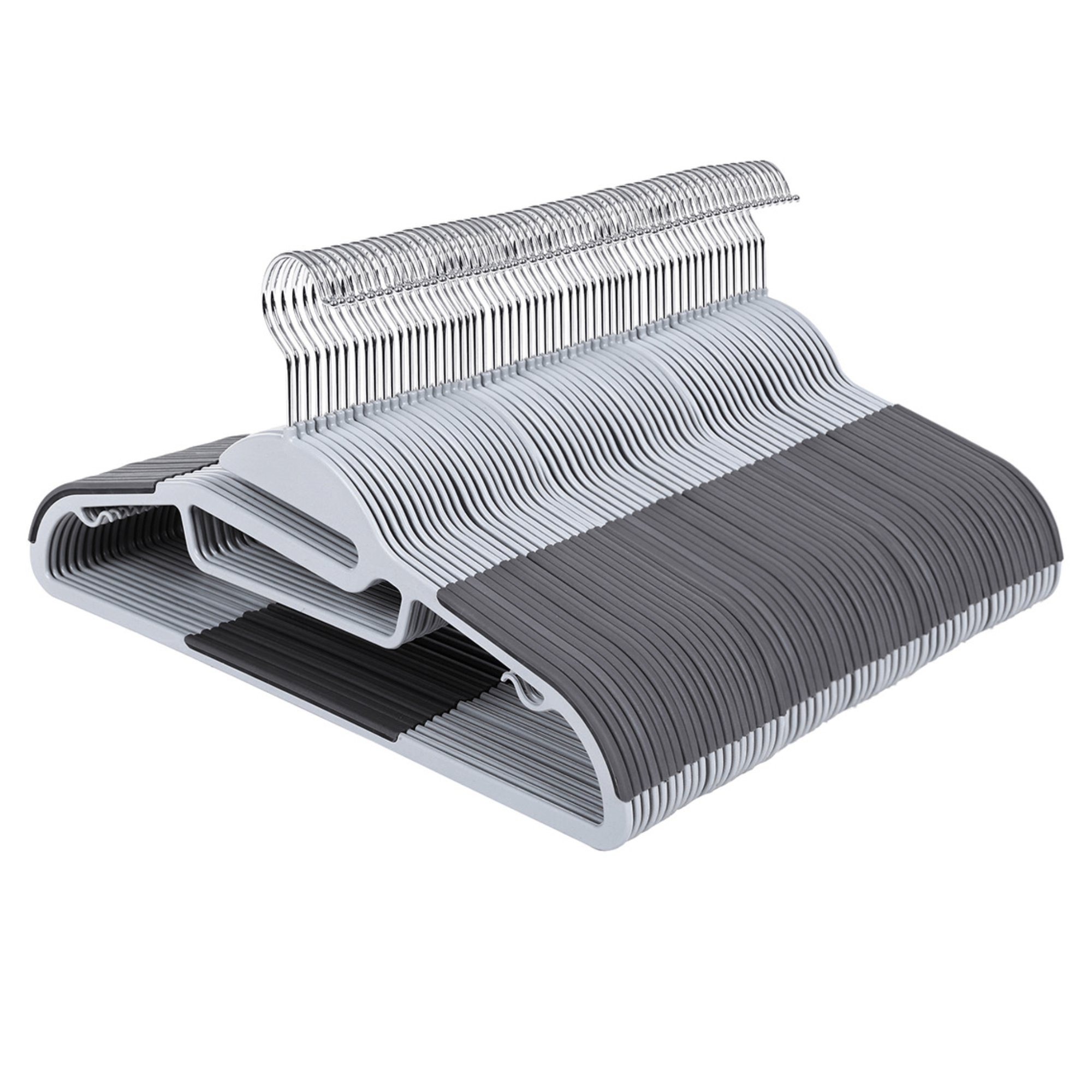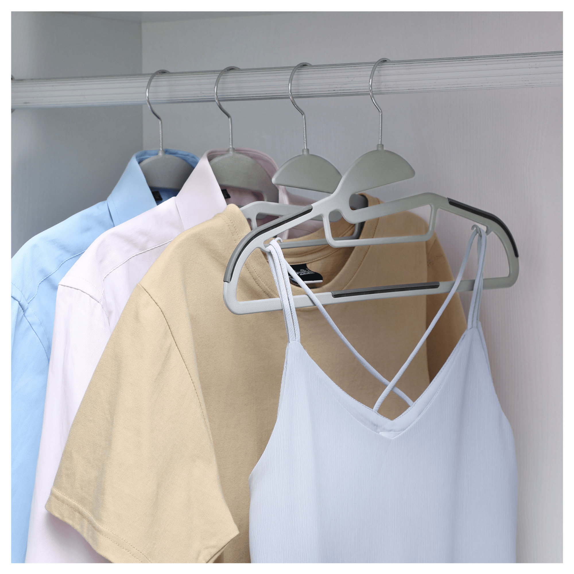 20 kusov vešiakov HANGER je vyrobených z plastu v kombinácii svetlo a tmavosivej farby. Na bokoch a uprostred odkladacej lišty sú vešiaky potiahnuté syntetickou gumou, vďaka ktorej nebude uložené oblečenie nepríjemne skĺzavať. Na bokoch z vnútornej strany sa nachádzajú drobné háčiky, umožňujúce zavesenie ramienkových topov, šiat alebo sukní. Plastovú konštrukciu dopĺňa kovový, otočný háčik, ktorý jednoducho otočíte o 360 ° a uľahčíte si každodenné používanie. Vďaka tenšiemu vyhotoveniu ušetríte cenné miesto a môžete do skrine uložiť viac oblečenia alebo ich ľahko použijete aj v užších skriniach.