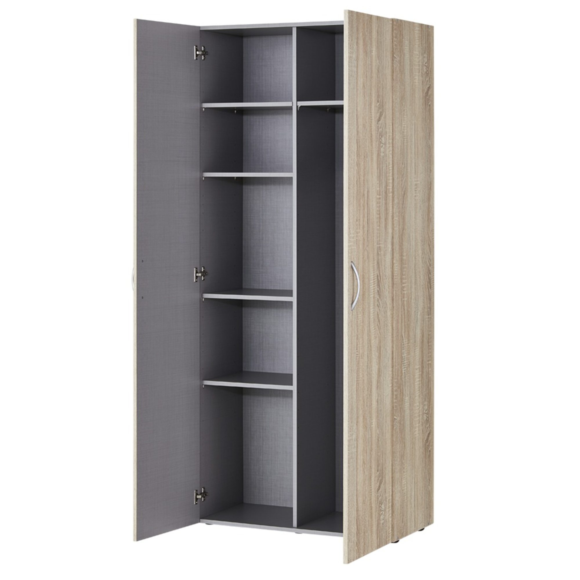 Skriňa má 2 otočné dvere s decentnými rúčkami vo farbe kovu na ľahkú manipuláciu. Za dverami sa nachádza 5 vložených políc na uskladnenie najrôznejších predmetov. Korpus je vyrobený je z laminovaného dreveného materiálu a dvere z fóliovaného. Vďaka použitému materiálu nevyžaduje špeciálnu údržbu. Túžite po interiéri zjednotenom do jedného štýlu? Pozrite sa na ďalšie nábytkové kusy z rovnomenného programu MULTIRAUMKONZEPT.