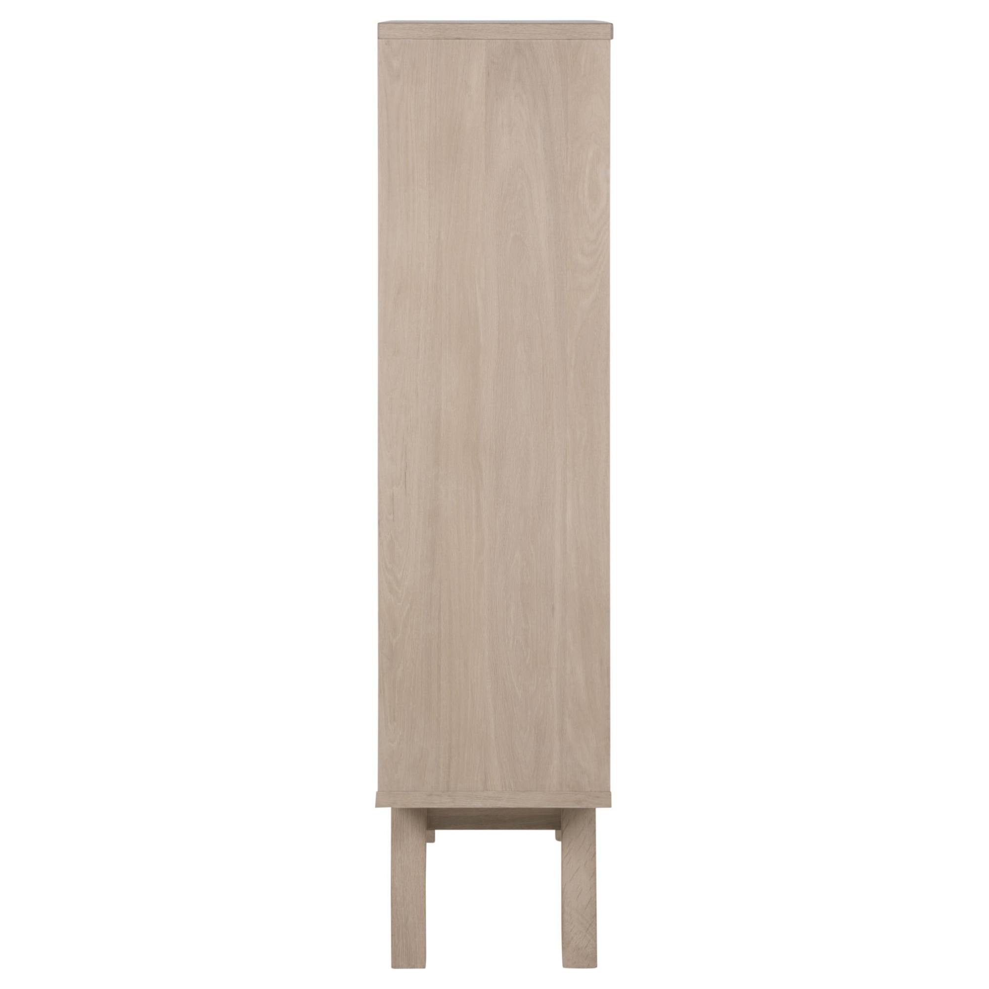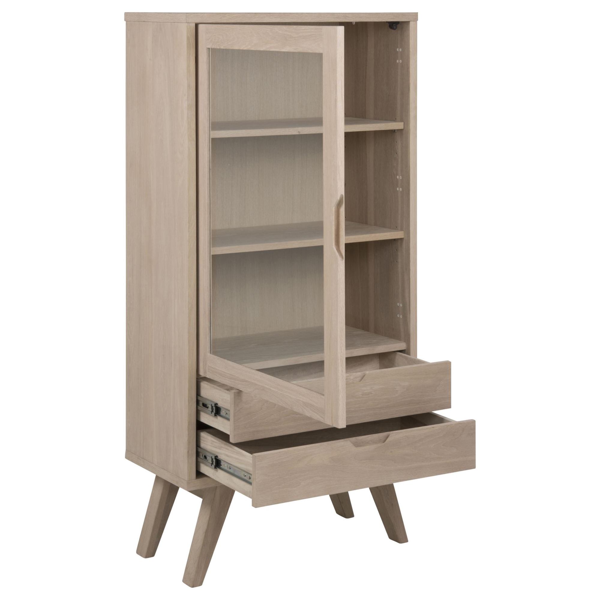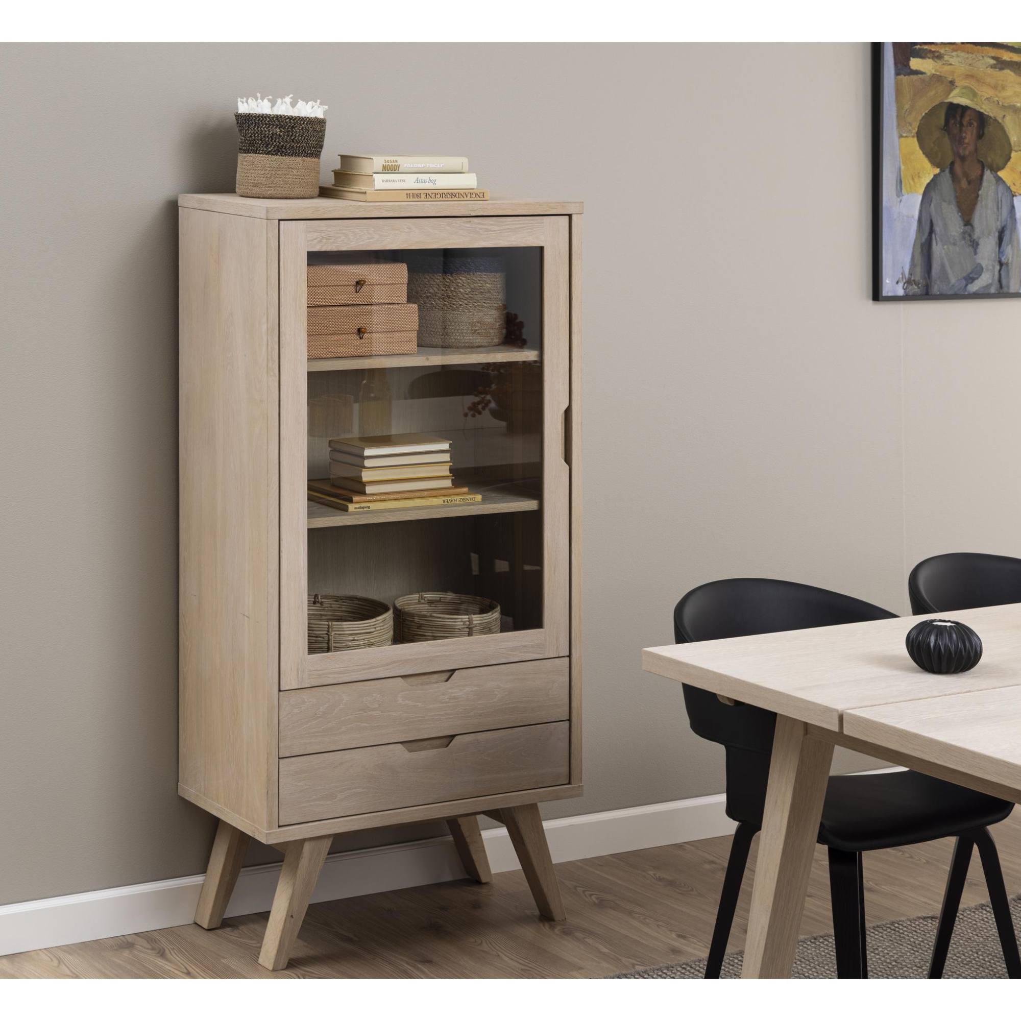 Vitrína je vyrobená z dyhovanej drevotrieskovej dosky, ktorá je ošetrená olejom. Otvorená časť s 2 policami za presklenými dvierkami z tvrdeného skla ponúka miesto na všetky vaše dekorácie, knihy či fotografie. Spodná časť ďalej disponuje 2 praktickými zásuvkami, kde sa vám na uložené predmety nebude prášiť. Manipuláciu vám uľahčia štýlové integrované rukoväte.