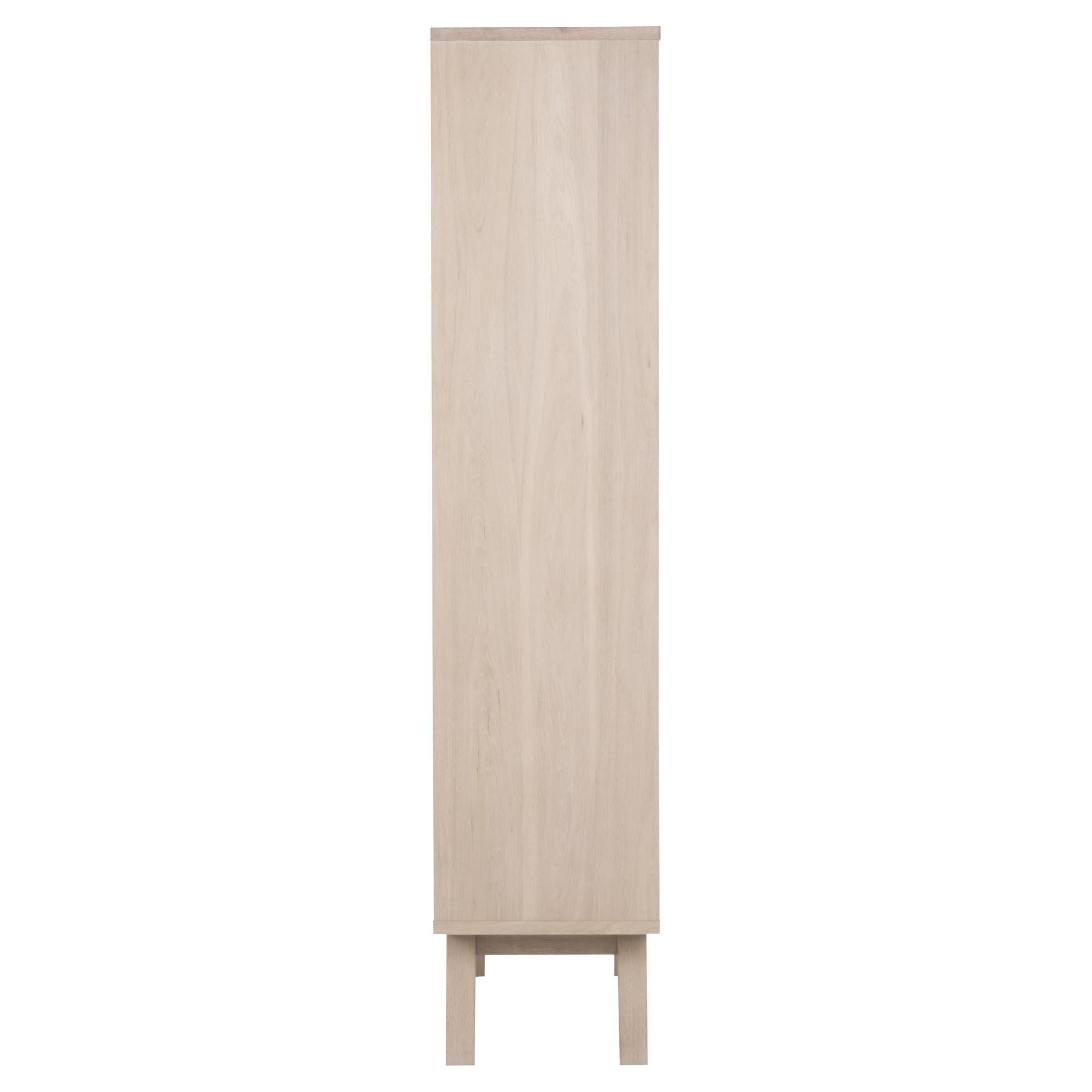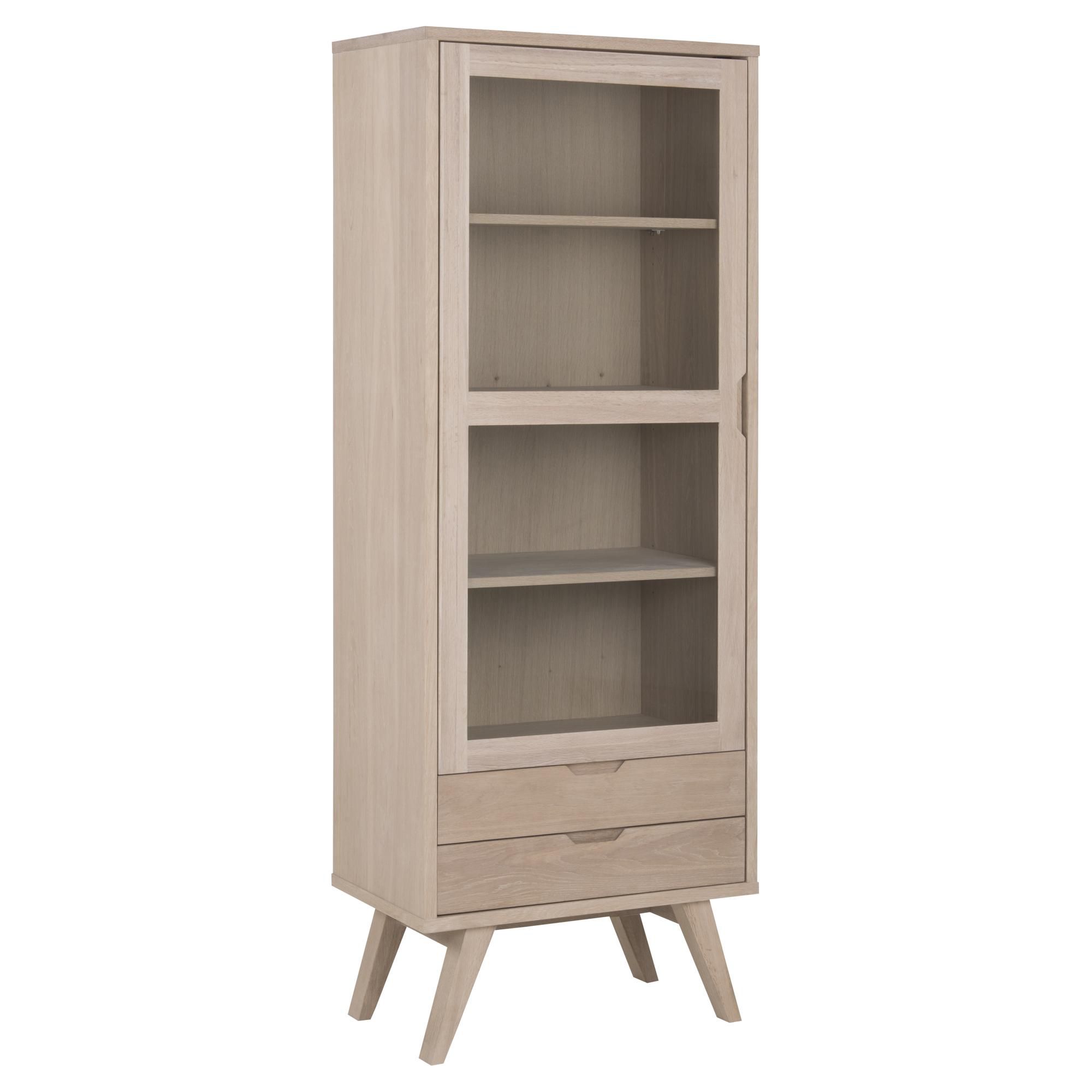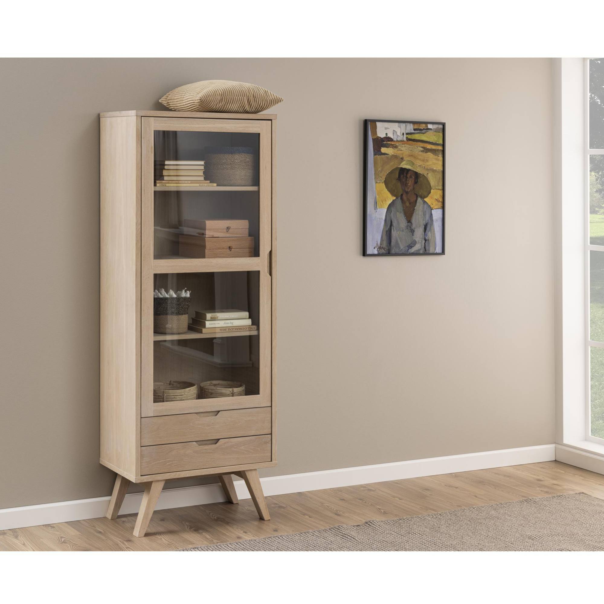 Vitrína je vyrobená z dyhovanej drevotrieskovej dosky, ktorá je ošetrená olejom. Otvorená časť s tromi policami za presklenými dvierkami z tvrdeného skla ponúka miesto na všetky vaše dekorácie, knihy či fotografie. Spodná časť ďalej disponuje dvoma praktickými zásuvkami, kde sa vám na uložené predmety nebude prášiť. Manipuláciu vám uľahčia štýlové integrované rukoväte.