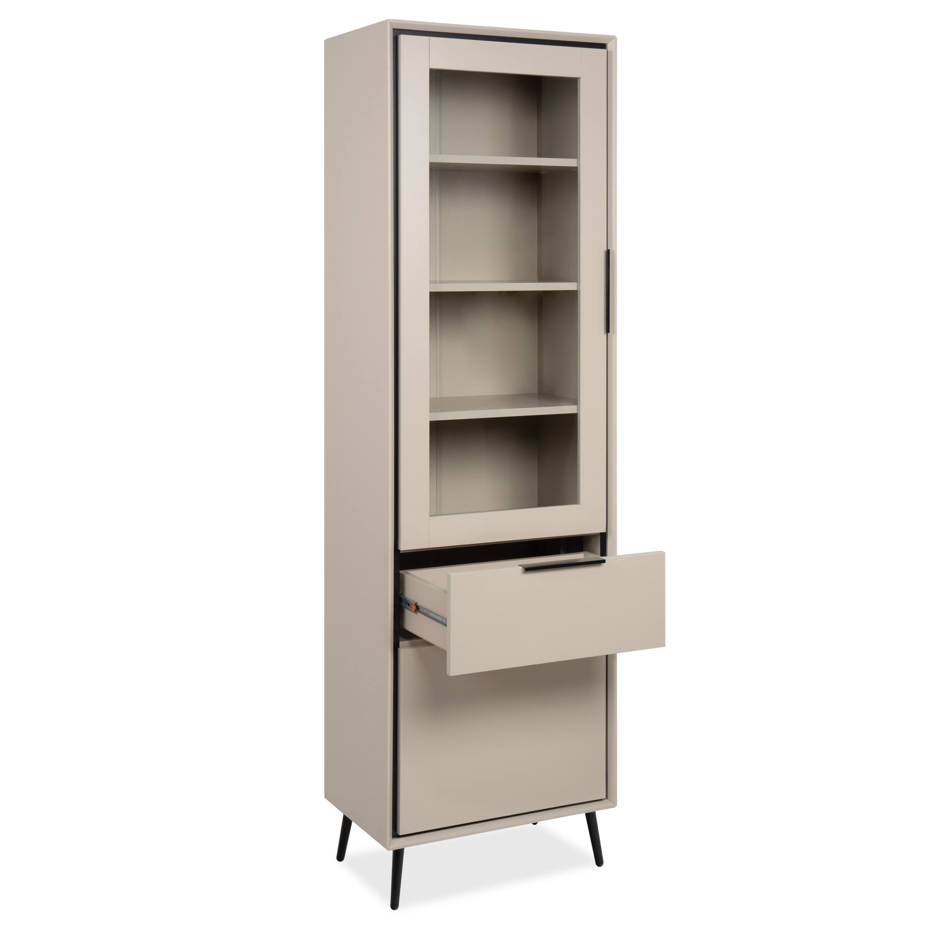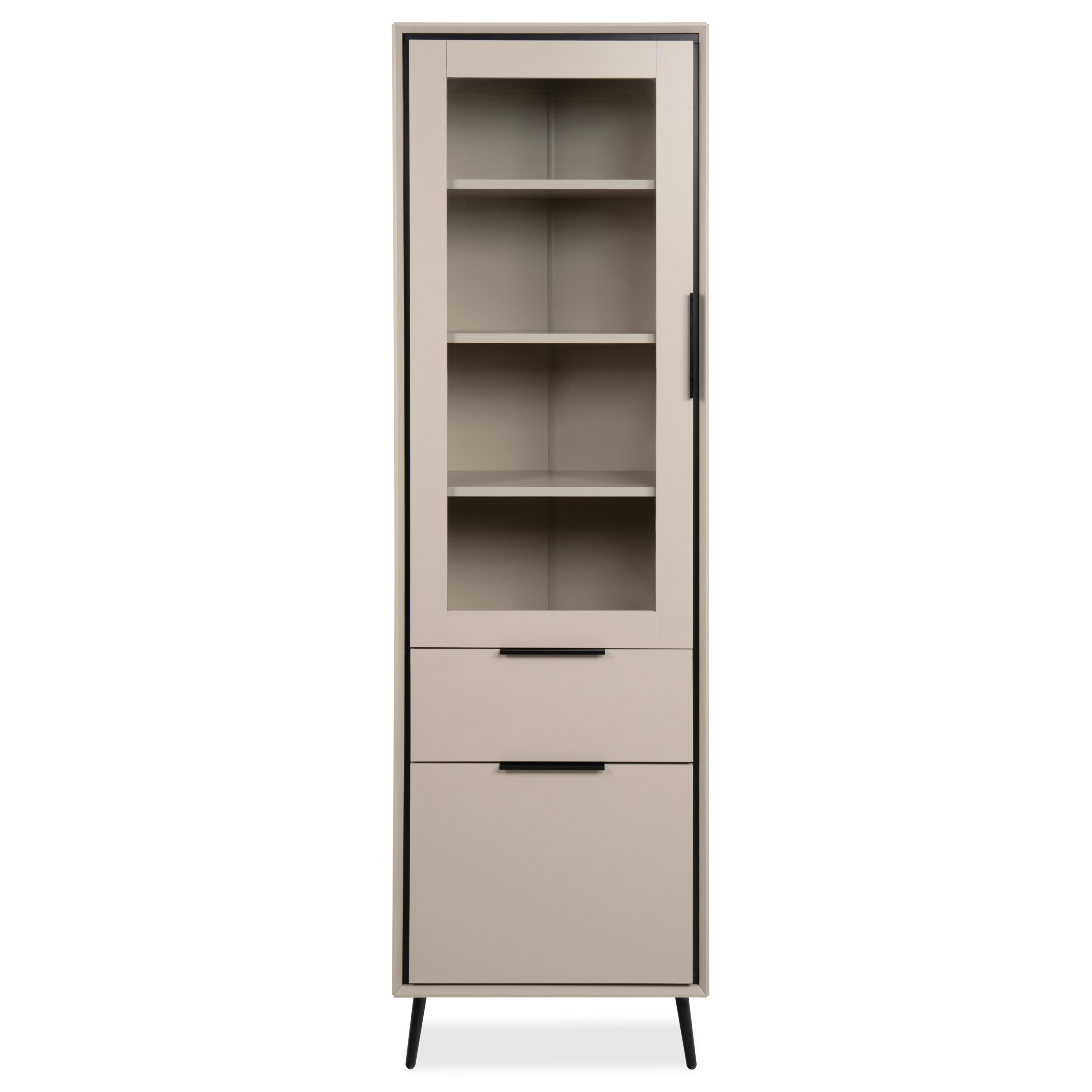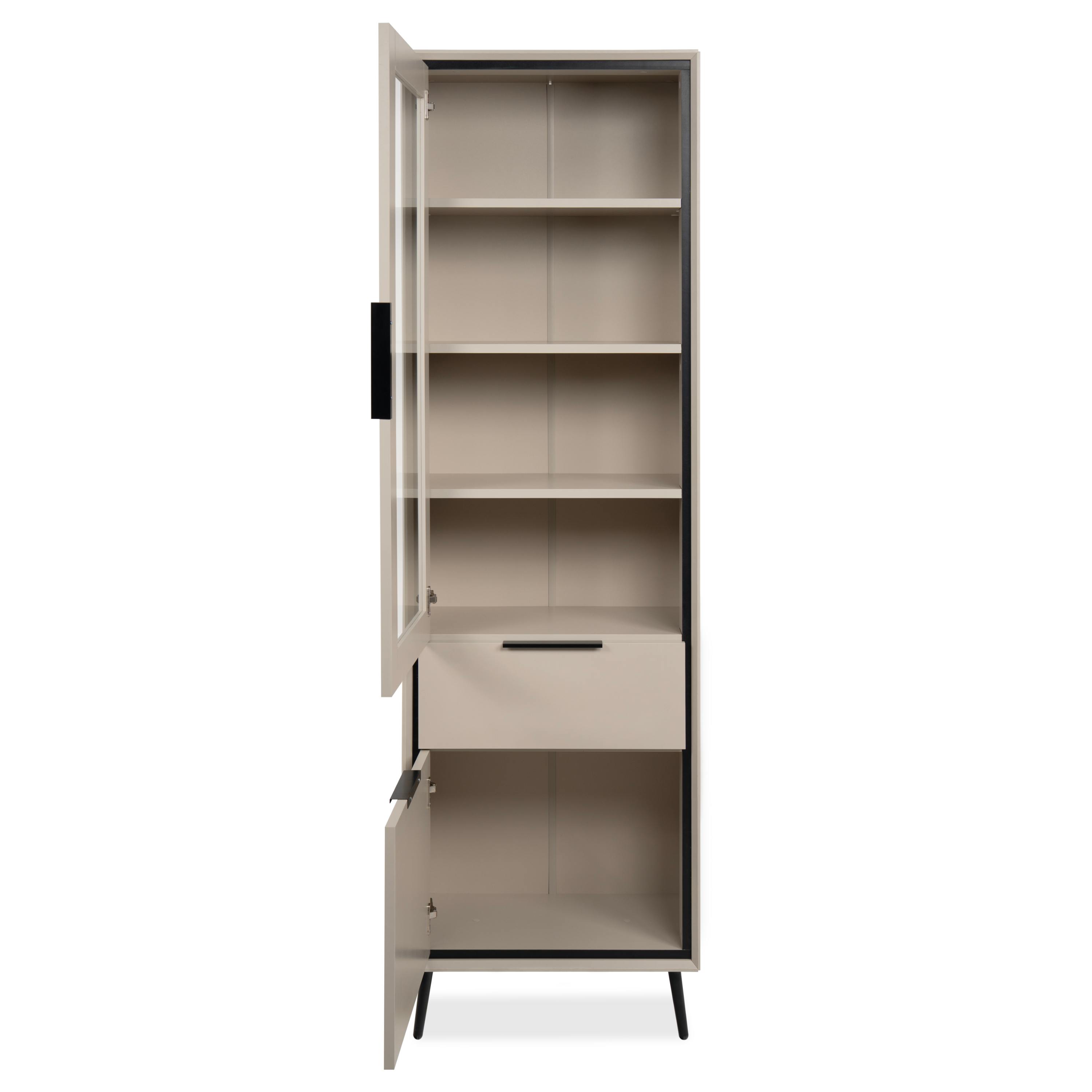Vitrína ponúka bohatý úložný priestor v podobe 4 vložených políc, ktoré sa ukrývajú za presklenými a plnými dvierkami. Na prehľadné uskladnenie slúži aj priestranná zásuvka. Celú konštrukciu podopierajú kónické plastové nožičky s výškou 15 cm. Vitrína je vyrobená z laminovanej drevotriesky s jednoduchou povrchovou údržbou.