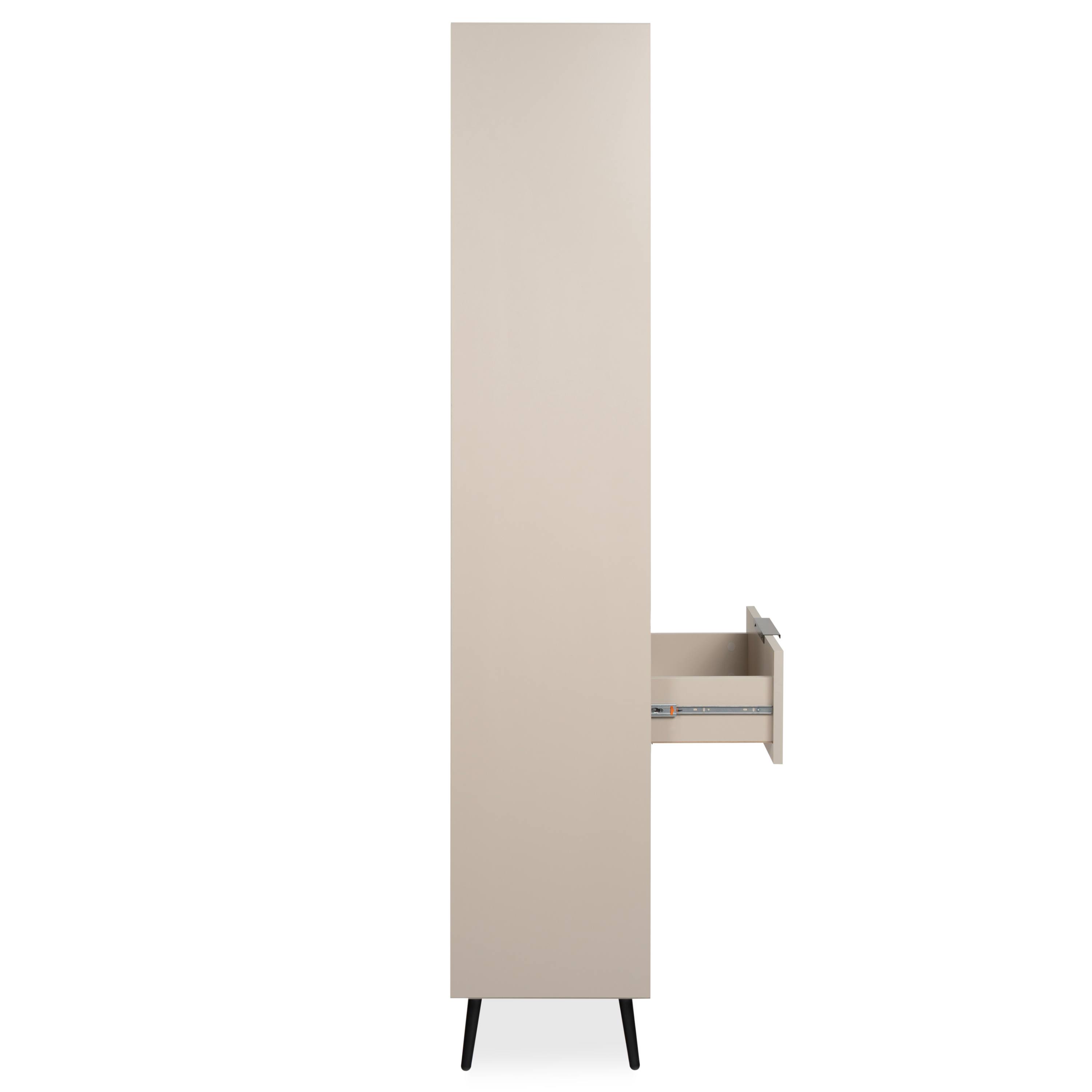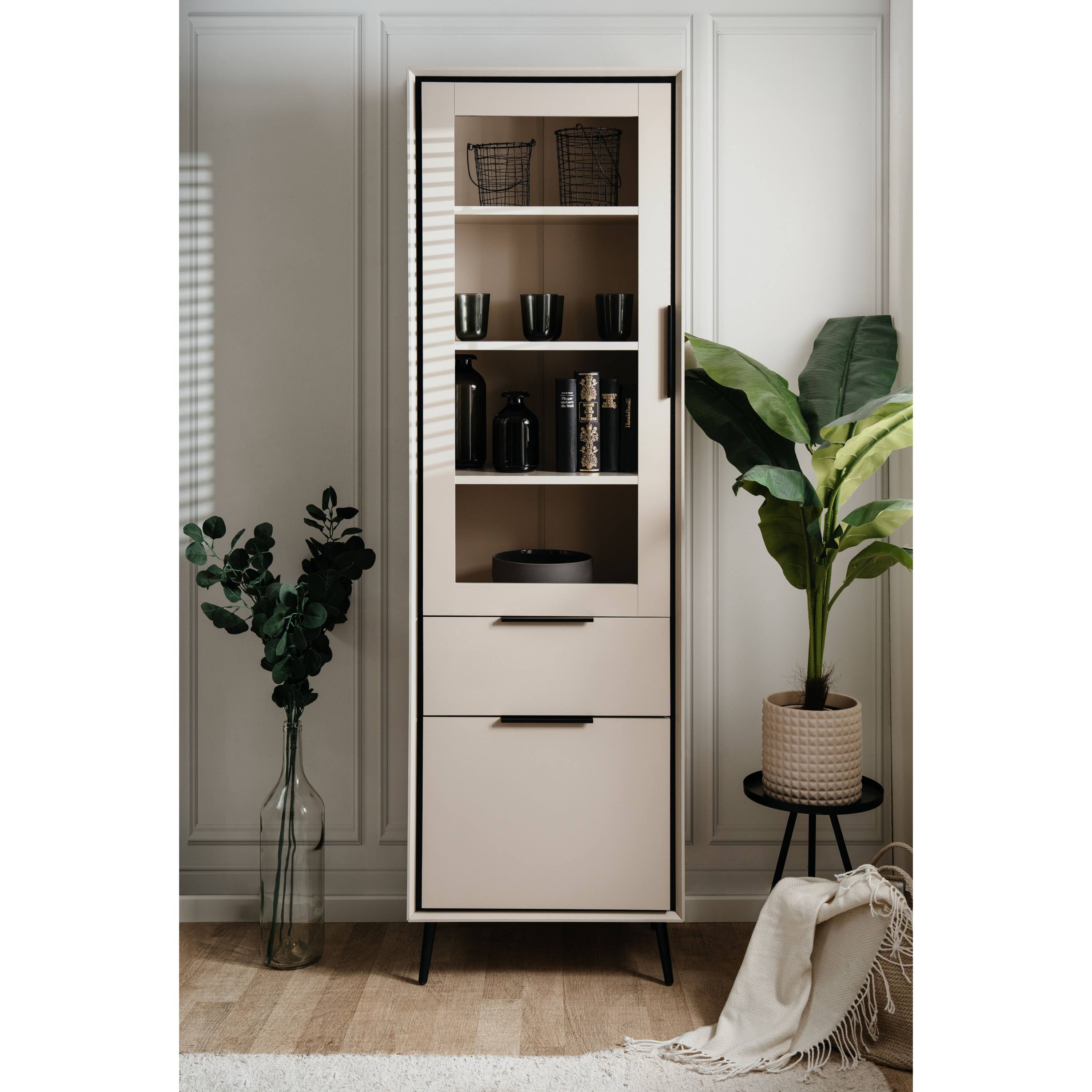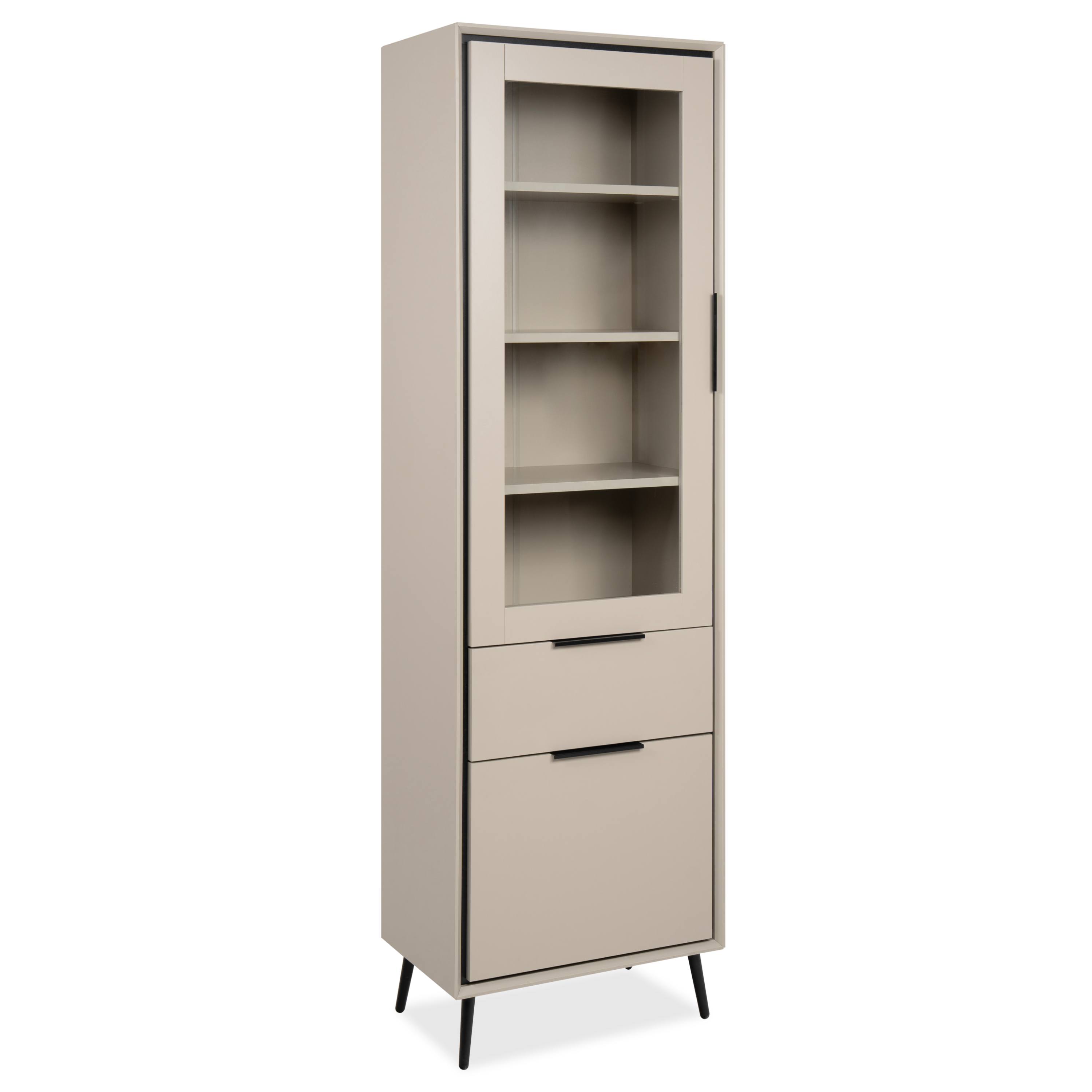Vitrína ponúka bohatý úložný priestor v podobe 4 vložených políc, ktoré sa ukrývajú za presklenými a plnými dvierkami. Na prehľadné uskladnenie slúži aj priestranná zásuvka. Celú konštrukciu podopierajú kónické plastové nožičky s výškou 15 cm. Vitrína je vyrobená z laminovanej drevotriesky s jednoduchou povrchovou údržbou.