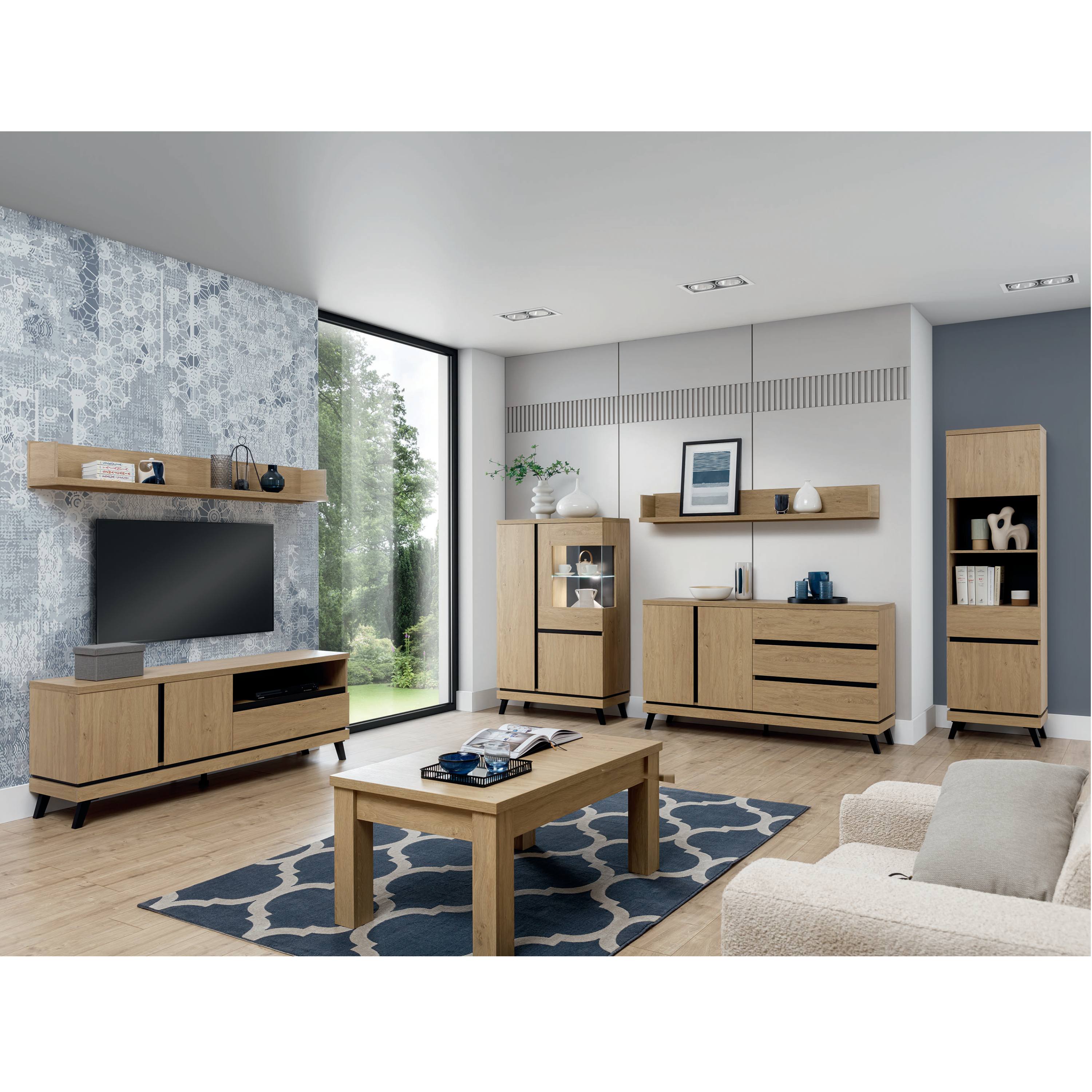 Vitrína ATHEIA AT04 v trendovej kombinácii prírodného dubového dekoru a čiernych detailov vytvára ideálny kontrast, ktorý pritiahne pozornosť a dodá miestnosti elegantný nádych.