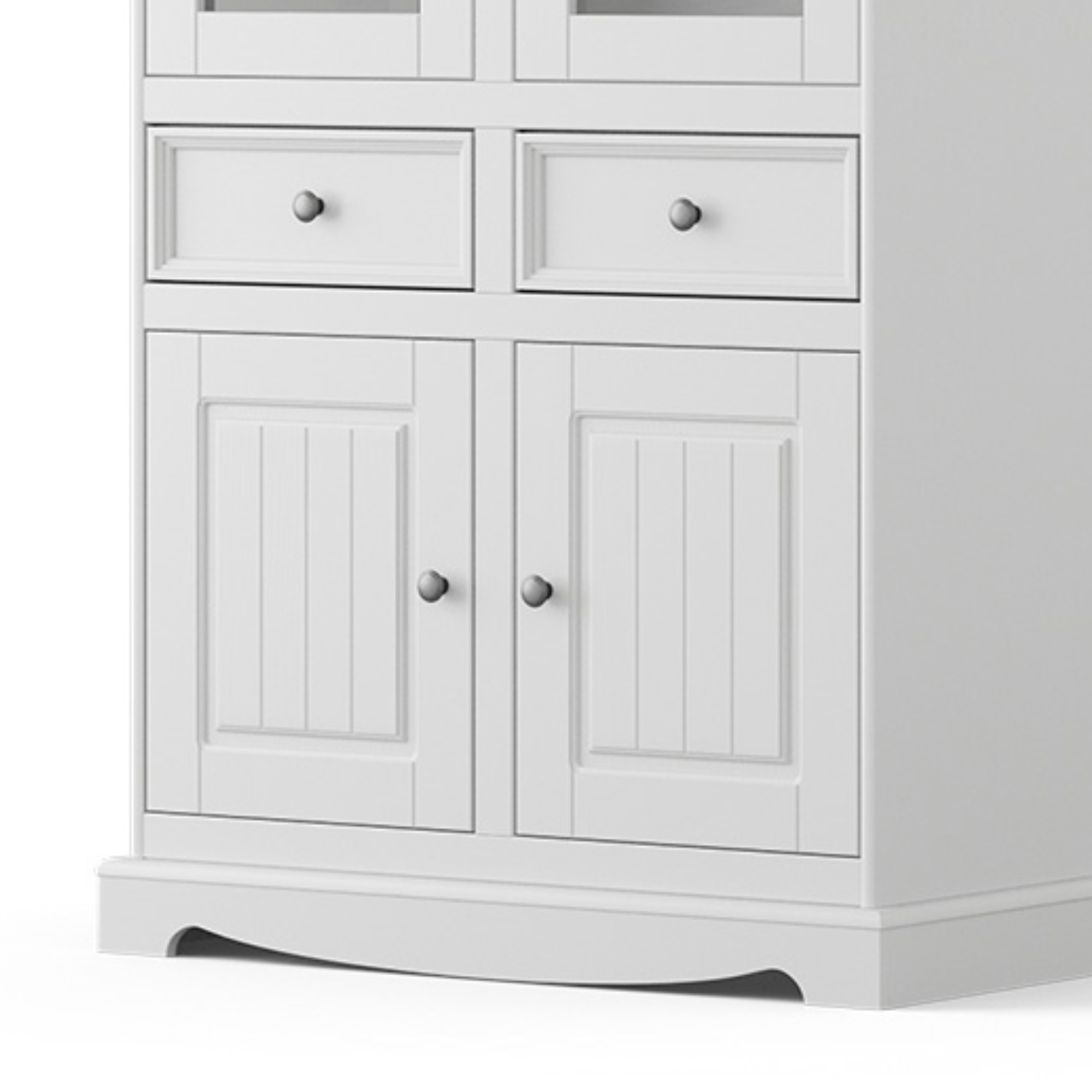 Vitrína je ideálnym miestom na uloženie predmetov, ktoré chcete nechať skryté aj tých, ktoré chcete mať neustále na očiach. Horná polovica obsahuje 2 otočné, presklené dvere so 4 vloženými policami, ktoré sú ideálne na vystavenie vašich pokladov. Vystavené predmety budú chránené pred všadeprítomným prachom. Nižšie nájdete 2 praktické zásuvky s tichým dovieraním, vďaka ktorým už nebudete musieť zložito hľadať rôzne drobnosti. Dvojica otočných dverí v spodnej časti uzatvára vnútorný priestor s 2 vloženými policami. Všetky predné plochy sú doplnené o kovové, okrúhle rúčky v starožitnej, zlatej farbe.