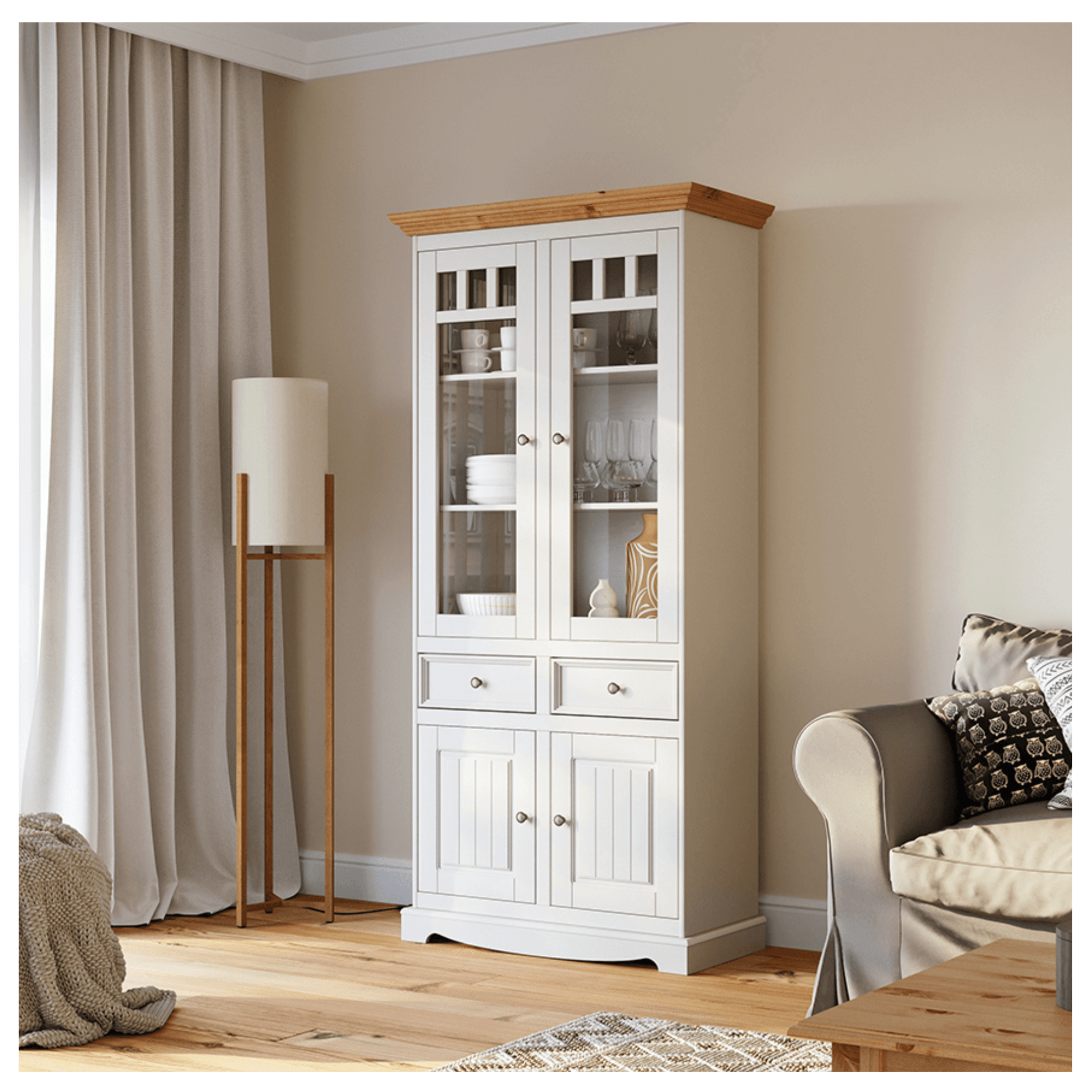 Vitrína BELLU 2D ponúka praktický, úložný priestor a tiež atraktívny vzhľad, vďaka ktorému zaujme na prvý pohľad. Je vyhotovená z masívneho dreva fínskej borovice zaručujúceho odolnosť a dlhú životnosť. Pod bielou farbou nenápadne presvitá prírodná kresba dreva, ktorá robí z každého kusa nábytku originál. Romantický vzhľad s nádychom vidieka dotvára množstvo klasických ozdobných prvkov ako je dekoratívne frézovanie, pilaster vo vrchnej časti a zaujímavo tvarovaná podstava.