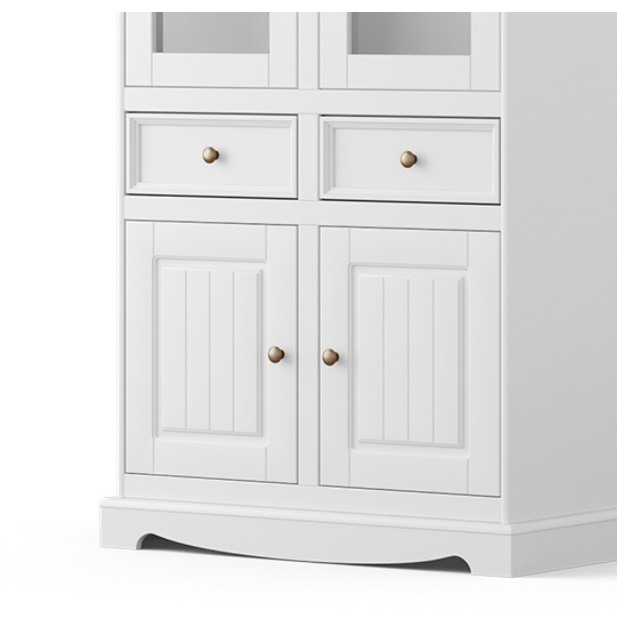 Vitrína je ideálnym miestom na uloženie predmetov, ktoré chcete nechať skryté aj tých, ktoré chcete mať neustále na očiach. Horná polovica obsahuje 2 otočné, presklené dvere so 4 vloženými policami, ktoré sú ideálne na vystavenie vašich pokladov. Vystavené predmety budú chránené pred všadeprítomným prachom. Nižšie nájdete 2 praktické zásuvky s tichým dovieraním, vďaka ktorým už nebudete musieť zložito hľadať rôzne drobnosti. Dvojica otočných dverí v spodnej časti uzatvára vnútorný priestor s 2 vloženými policami. Všetky predné plochy sú doplnené o kovové, okrúhle rúčky v starožitnej, zlatej farbe.