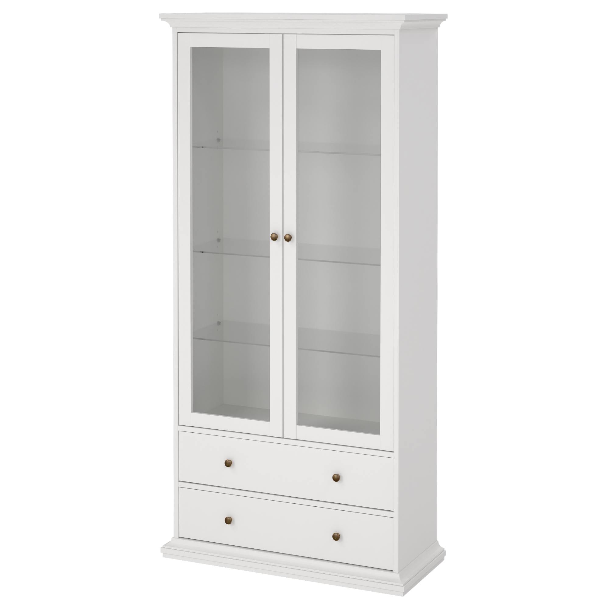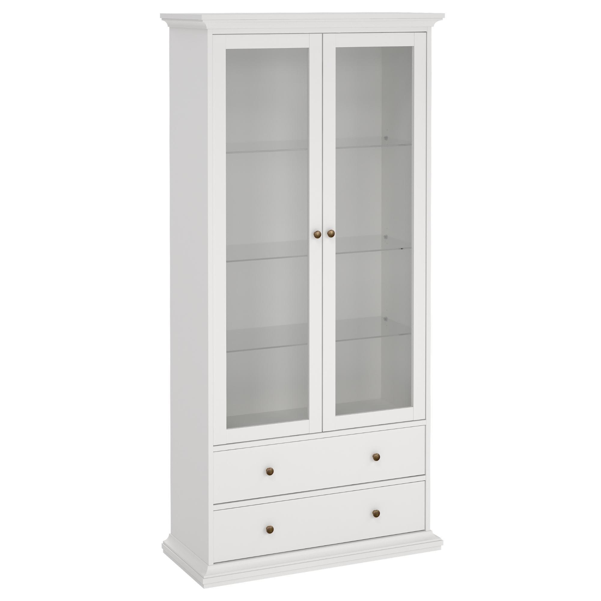 Jej súčasťou sú presklené dvierka s tromi sklenenými policami, kde vystavíte predmety, ktoré chcete mať vždy na očiach. Spodná časť zase disponuje dvoma zásuvkami. Na jednoduchšiu manipuláciu sú dvierka a zásuvky vybavené praktickými rúčkami.
