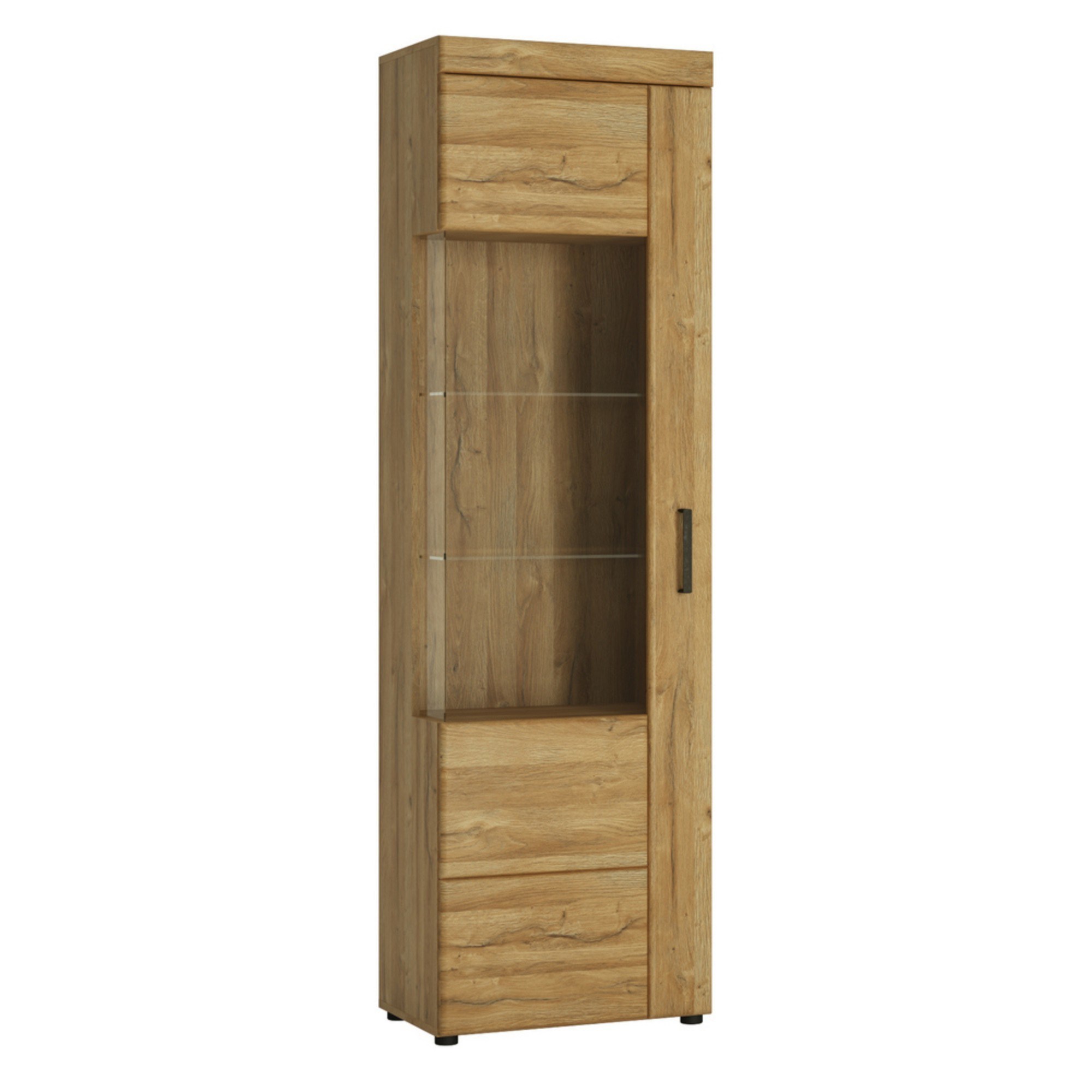 Elegantná vitrína CORTINA necháva vyniknúť výraznú kresbu dreva. Masívna štruktúra dvierok v kombinácii s kovovou rúčkou pripomína klasický drevený nábytok. Vitrína poskytuje dostatok krytého úložného priestoru aj miesto na vystavenie dekorácií vďaka preskleným dvierkam. Nerušené a pohodlné zatváranie dvierok vám zaistí systém SOFT CLOSE. Vitrína CORTINA je dokonalým spojením elegancie, útulnosti a funkčnosti.