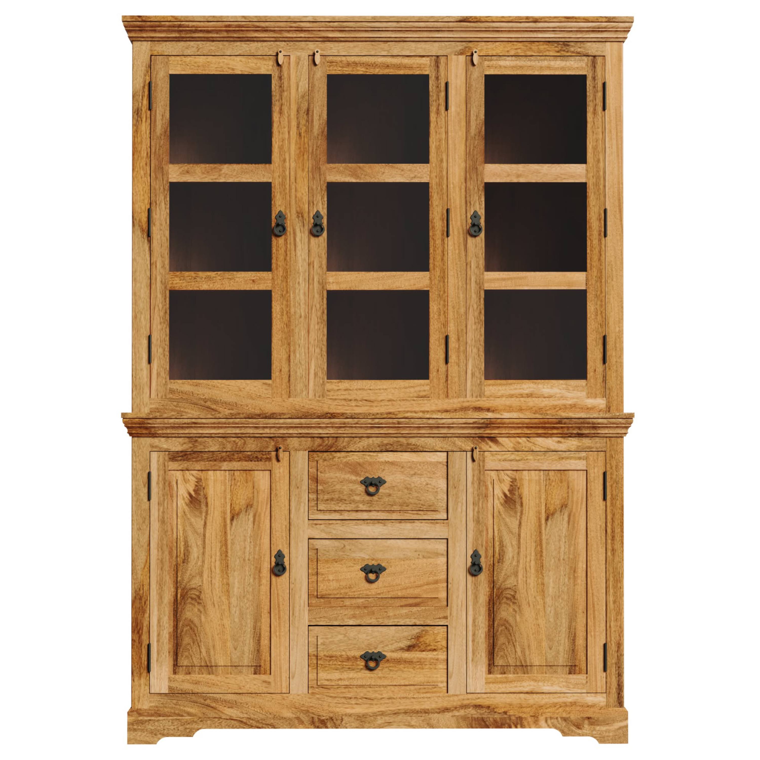 Úložný priestor je rozdelený na presklené a plné dvierka s policami a zásuvky na ktorých otváranie slúžia kovové rúčky. Konštrukcia vitríny je vyrobená z masívneho mangového dreva v prírodnom spracovaní bez povrchovej úpravy. Vďaka použitému materiálu je vitrína nielen pevná, ale tiež disponuje dlhou životnosťou. Prirodzená kresba dreva, sfarbenie a priznané nedokonalosti dodávajú na jedinečnosti každého kusa.