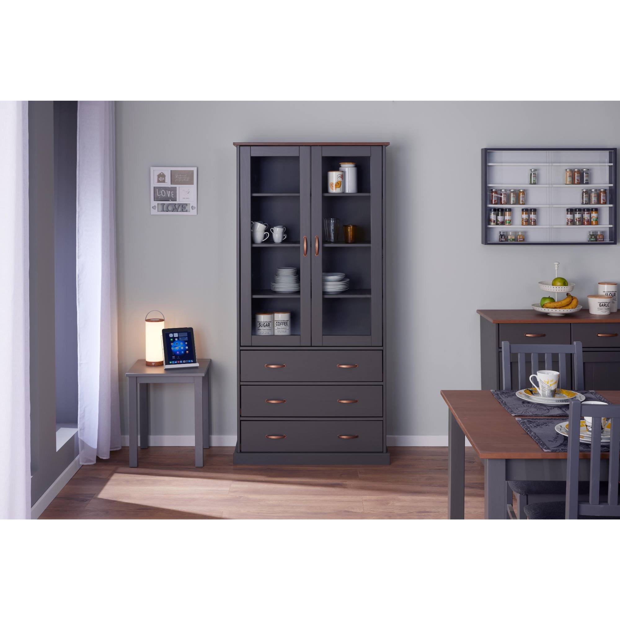 Vitrína HENRIETTA sa vyznačuje ozdobnými prvkami zdôrazňujúcimi charakter provensálskeho štýlu. Konštrukcia z masívnej borovice vo farebnom kontraste hnedej a sivej farby bude vyzerať elegantne a reprezentatívne.