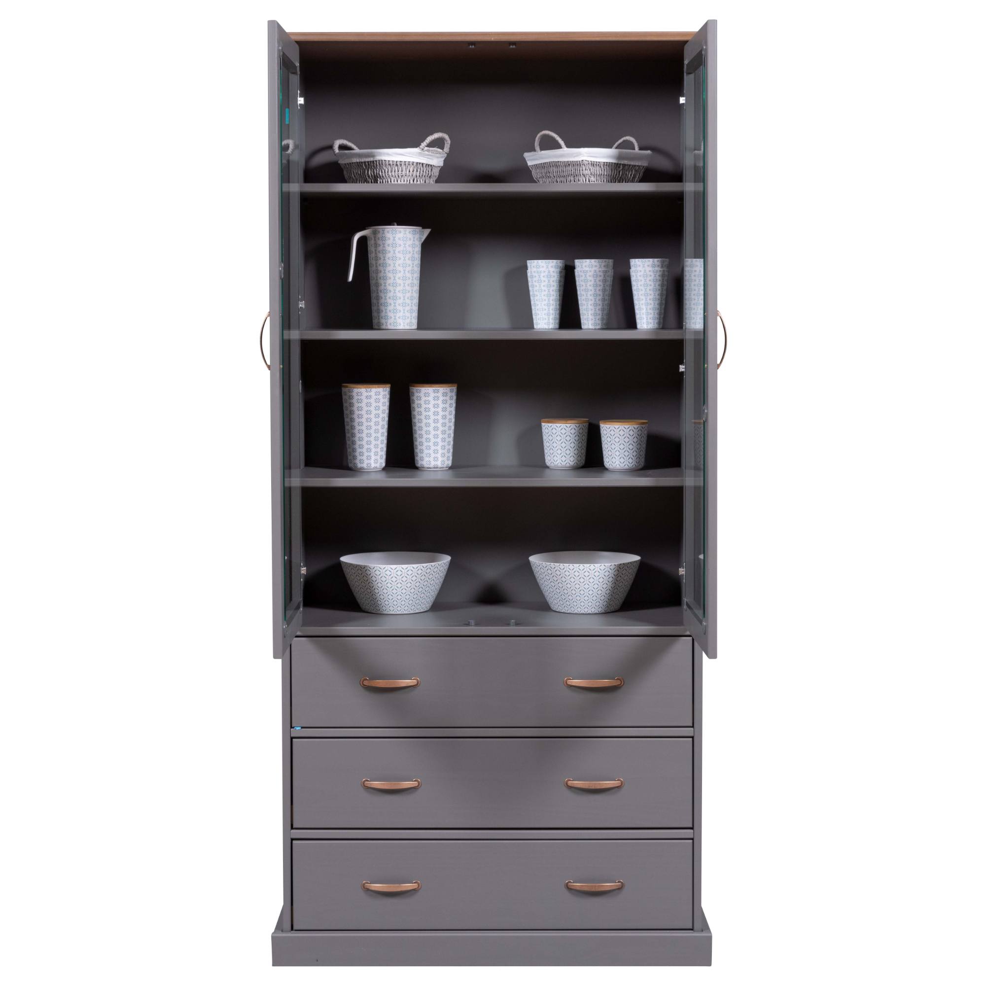 Dostanete priestor na uloženie drobností aj rozmernejších predmetov. Do troch praktických zásuviek a vnútorných políc za presklenými dvierkami ideálne odložíte príbory, taniere alebo iné predmety, ktoré potrebujete mať po ruke. Nadčasový a originálny dizajn zvýrazňujú kovové rúčky.