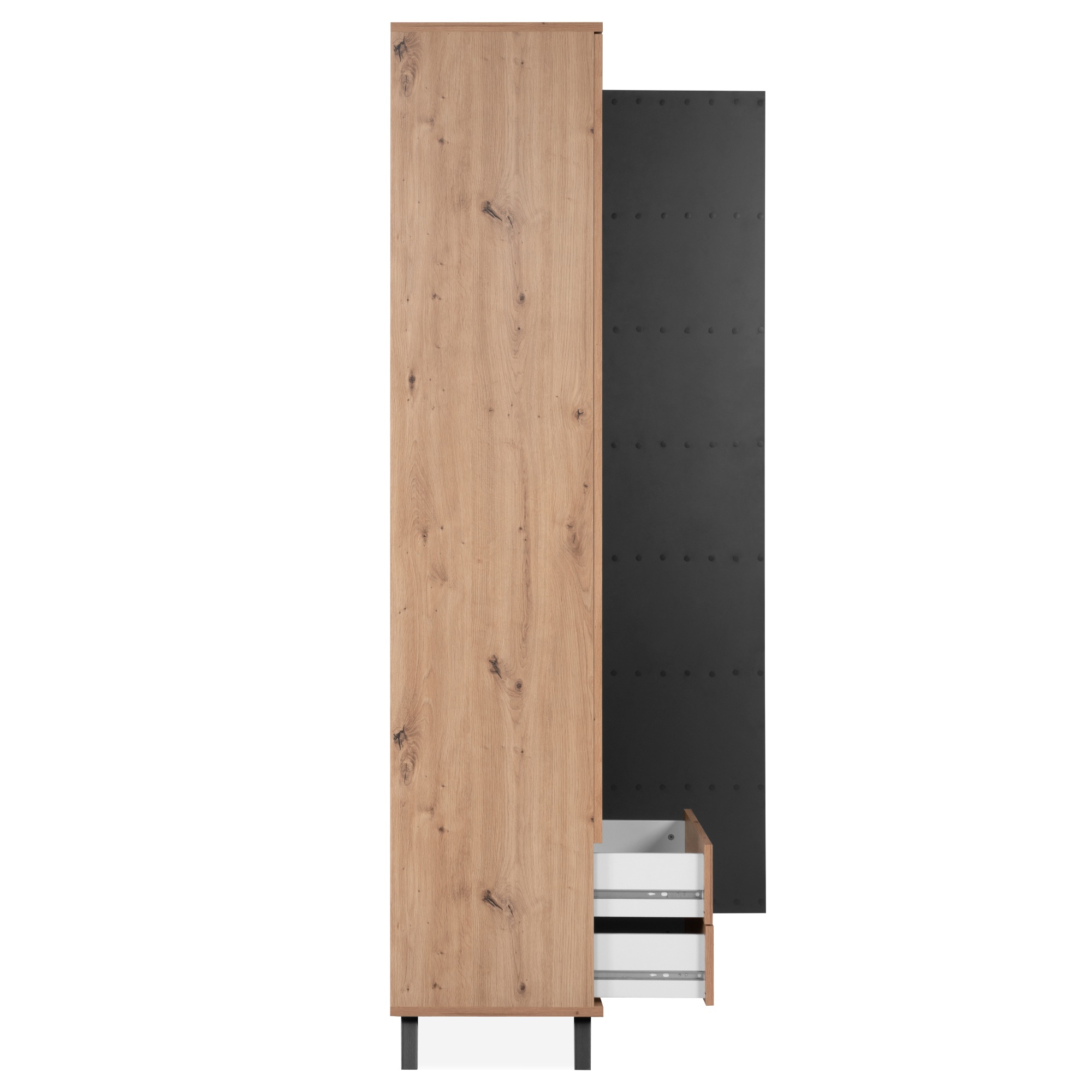 Vyrobená je z laminovaných drevotrieskových dosiek, ktoré sa vyznačujú ľahkou udržiavateľnosťou a dlhou životnosťou. Ladená je do dekora duba artisan s výraznou kresbou dreva, ktoré interiér zútulňuje a obohacuje o prírodný nádych, štýl dopĺňa stabilná podnož z MDF materiálu v kontrastnom antracitovom odtieni. Dostatočný úložný priestor zaisťujú dve zásuvky a vnútorné police za plnými a presklenými dvierkami a prostredné. Pravá časť je navyše doplnená o dekoratívne dvierka. Celkovú manipuláciu uľahčujú decentné rúčky z kovu.