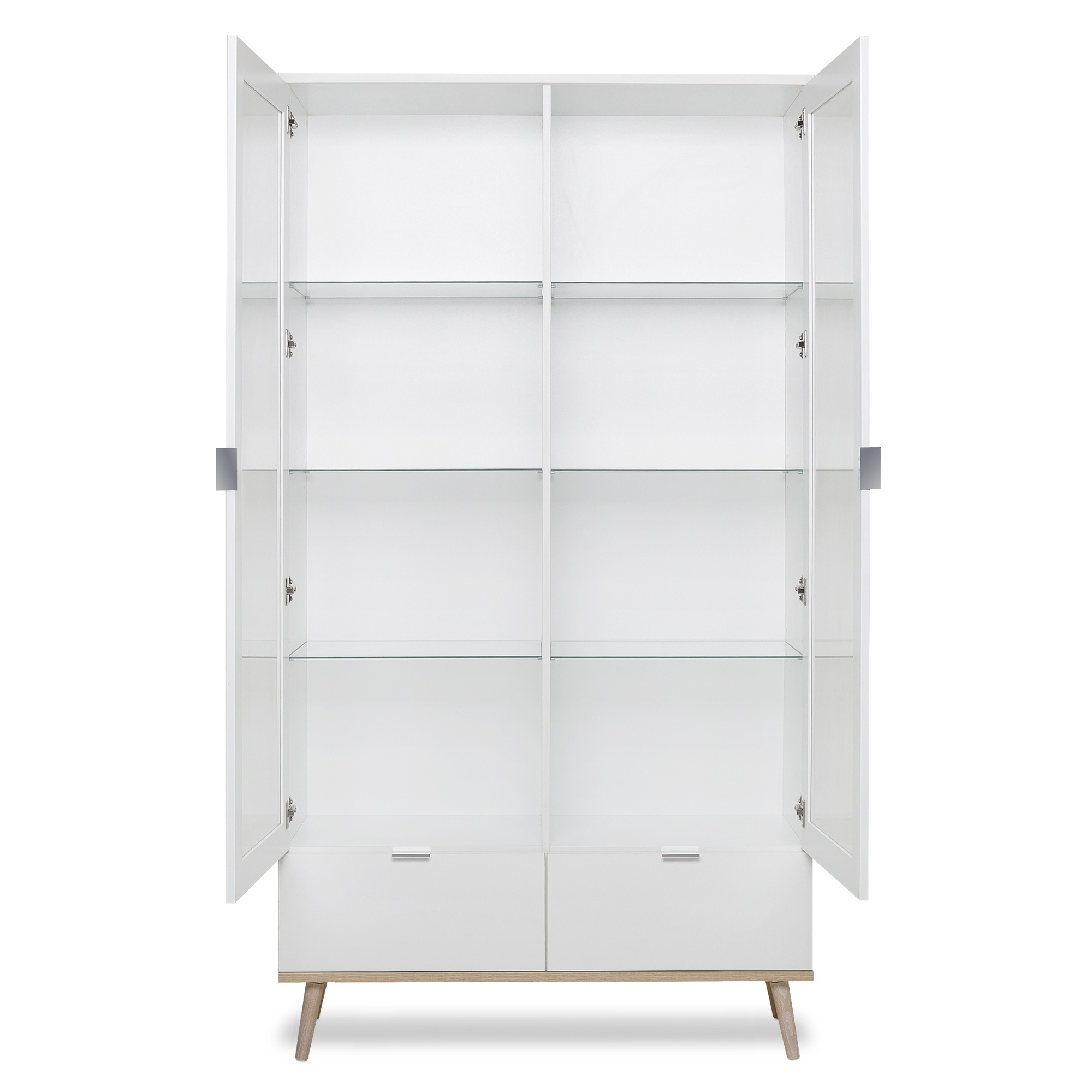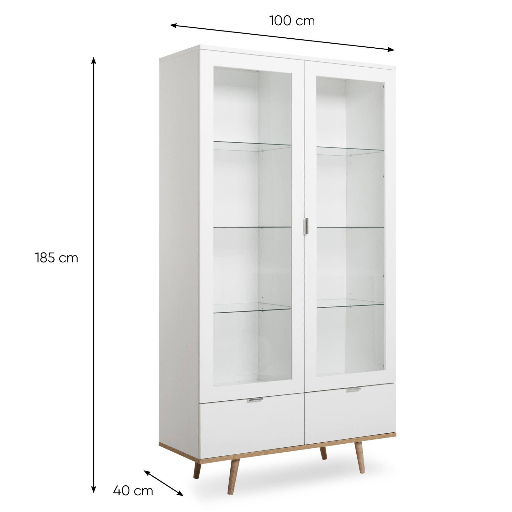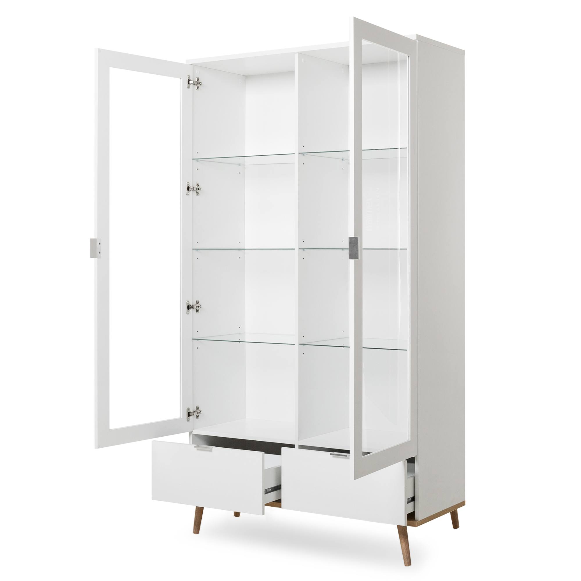 Telo vitríny je vybavené 2 otočnými dverami s presklenými prednými plochami, ktoré umožňujú mať uložené predmety neustále na očiach. Celkom 6 sklenených vložených políc ponúka dostatok úložného priestoru. 2 hlboké zásuvky umožňujú mať po ruke drobnosti, ktoré sa ľahko strácajú. Na ľahkú manipuláciu slúžia praktické kovové rúčky. Celú konštrukciu podopierajú nohy z masívneho dreva, ktoré jej dodávajú potrebnú stabilitu a zároveň utvárajú vzdušnejší dojem.