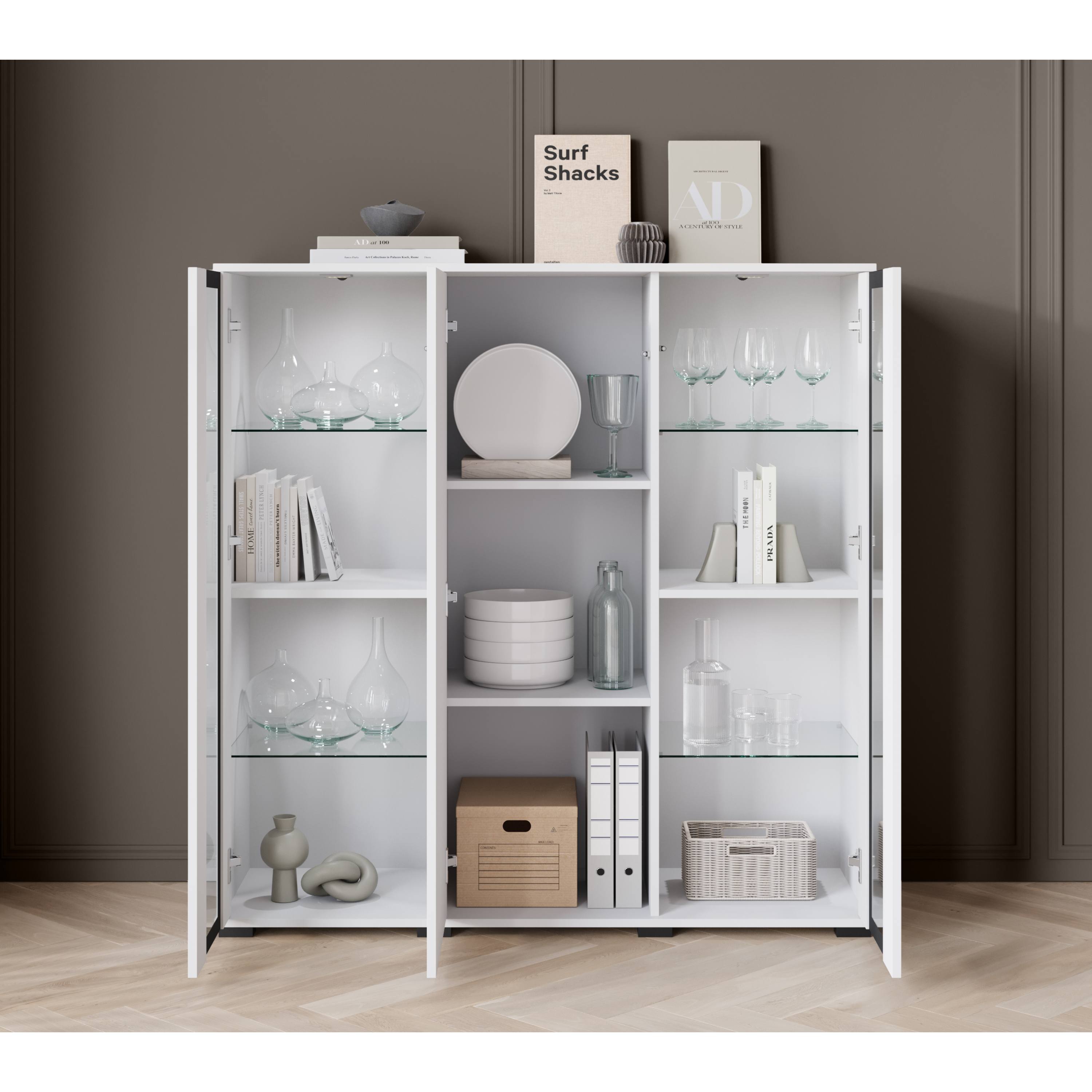 Vnútorné vybavenie pozostáva celkovo z 8 vložených políc, ktoré ponúkajú dostatok úložného priestoru. Vitrína je uzatvárateľná otočnými a čiastočne presklenými dverami a vystavené predmety potom lepšie vyniknú vďaka LED osvetleniu, ktoré je súčasťou dodávky. Moderný vzhľad celku podčiarkuje bezúchytkové otváranie v kombinácii s mechanizmom push to open. Je vyrobená z laminovanej drevotriesky s povrchom nenáročným na údržbu.
