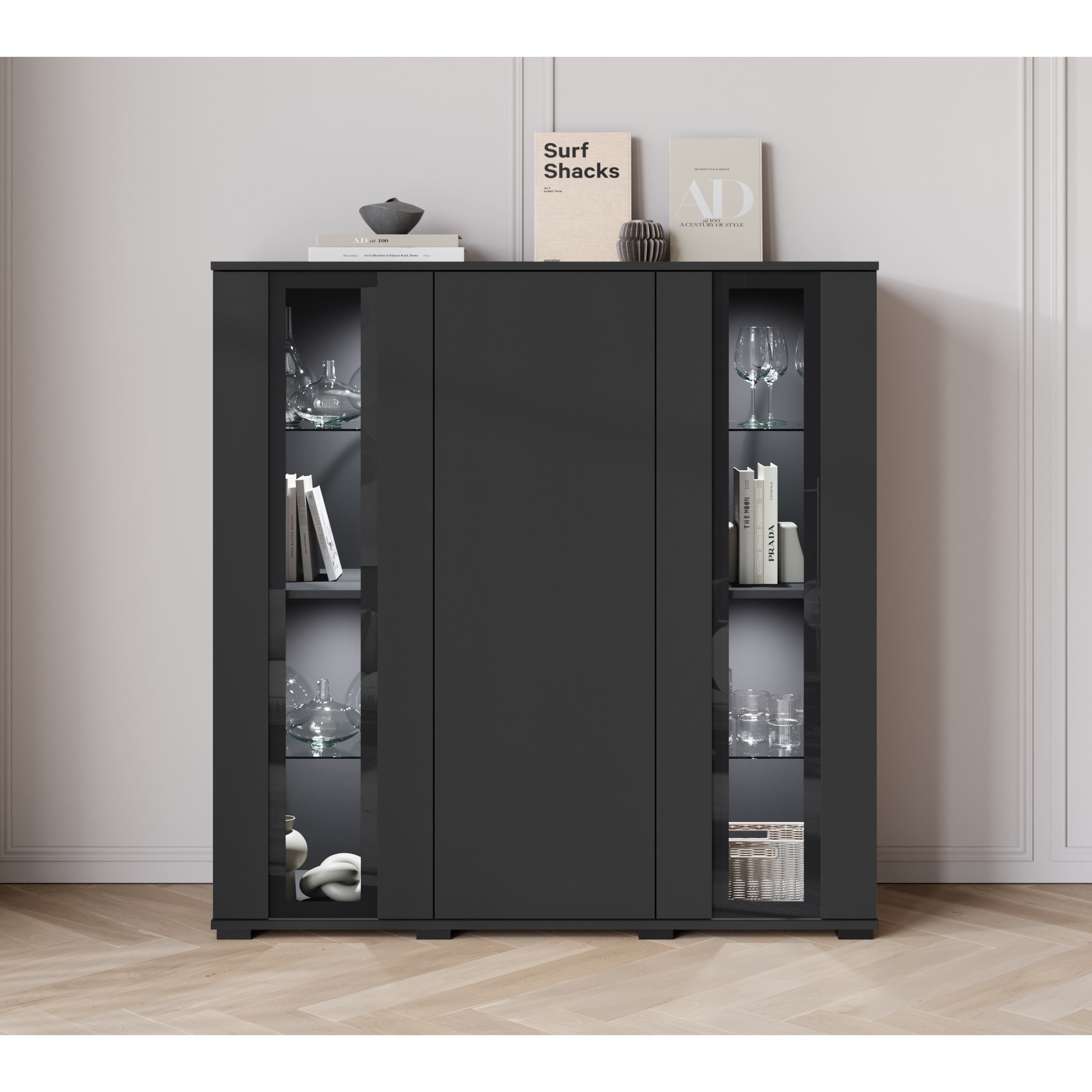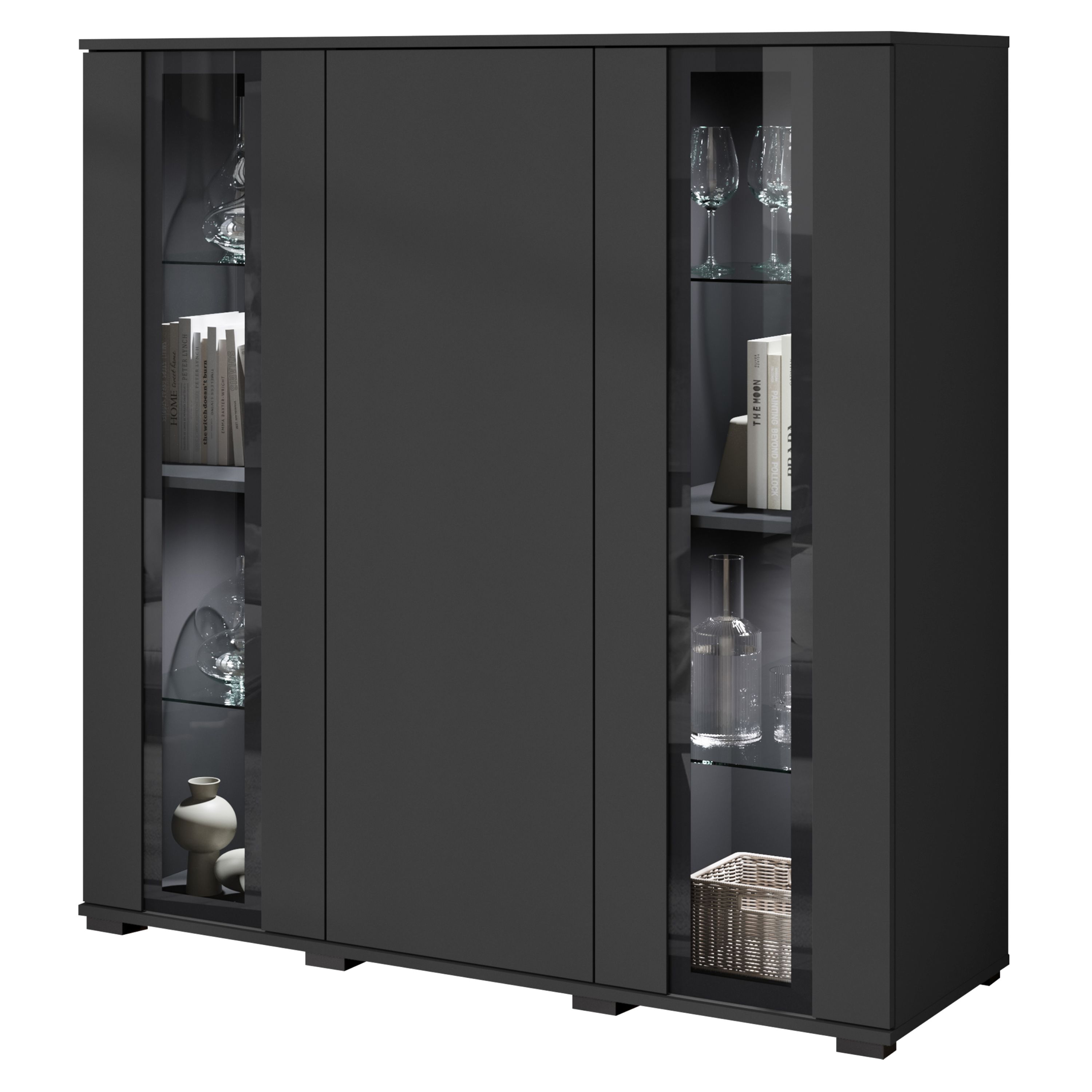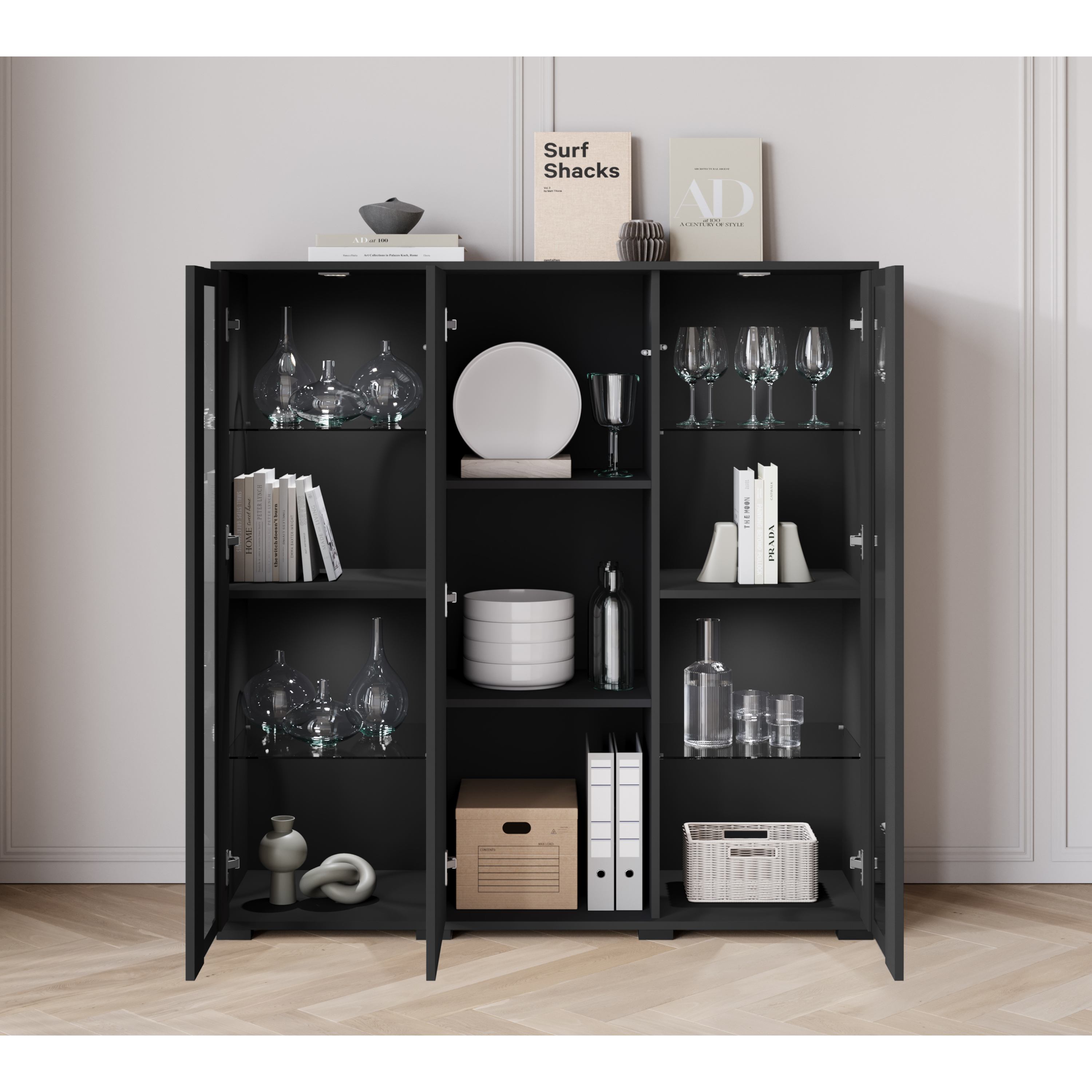 Vnútorné vybavenie pozostáva celkovo z 8 vložených políc, ktoré ponúkajú dostatok úložného priestoru. Vitrína je uzatvárateľná otočnými a čiastočne presklenými dverami a vystavené predmety potom lepšie vyniknú vďaka LED osvetleniu, ktoré je súčasťou dodávky. Moderný vzhľad celku podčiarkuje bezúchytkové otváranie v kombinácii s mechanizmom push to open. Je vyrobená z laminovanej drevotriesky s povrchom nenáročným na údržbu.
