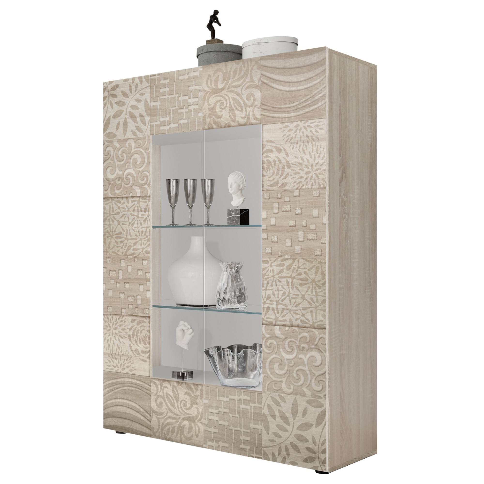 Vďaka štyrom policiam za presklenými dvierkami budete mať stále prehľad o uložených veciach. Budú sa tu vynímať vaše dekorácie, či porcelán, ktoré celú miestnosť príjemne oživia a zútulnia. Bezrúčkové vyhotovenie zvýrazňuje celkový minimalistický vzhľad. Laminovaný drevený materiál sa ľahko udržuje.