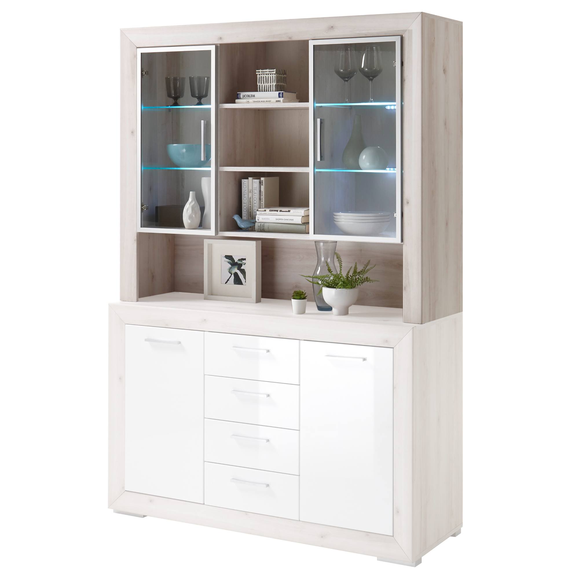 Spojenie prírodného dekora s farebnou prednou časťou pôsobí moderným dojmom. Táto kombinácia je zakomponovaná do prvotriedneho dizajnu konštrukcie, ktorý si vás získa na prvý pohľad. Za presklenými dvierkami sú uschované podsvietené sklenené police, ktoré zvýraznia vystavené predmety. Namontované štýlové rúčky vám uľahčia celkovú manipuláciu dvierok. Prostredná časť disponuje ďalšími policami. Všetko, čo potrebujete tak budete mať vždy po ruke.
