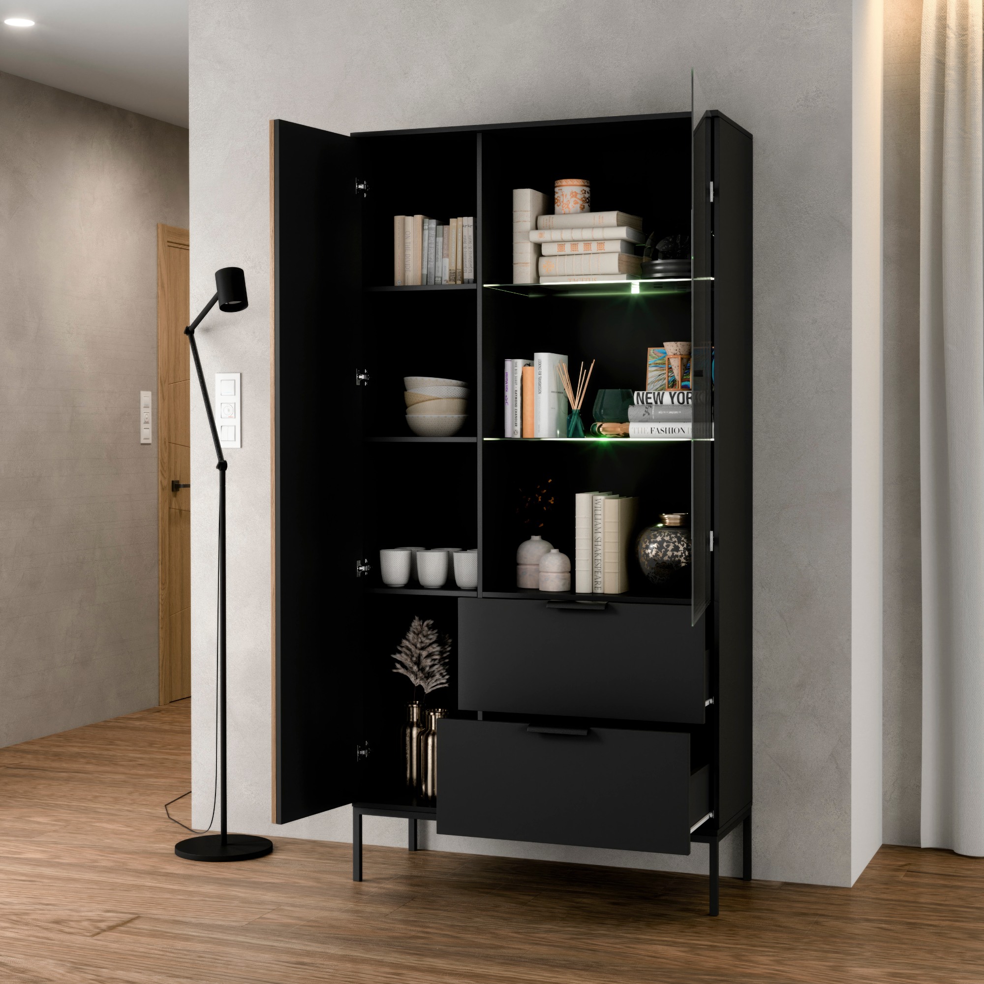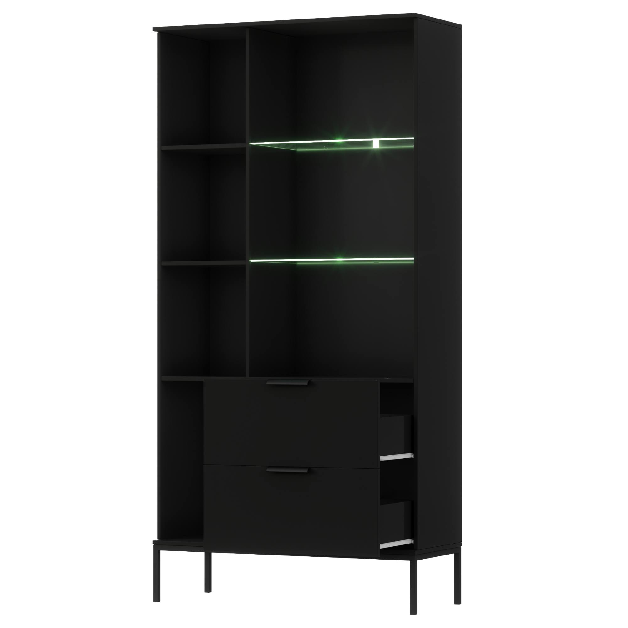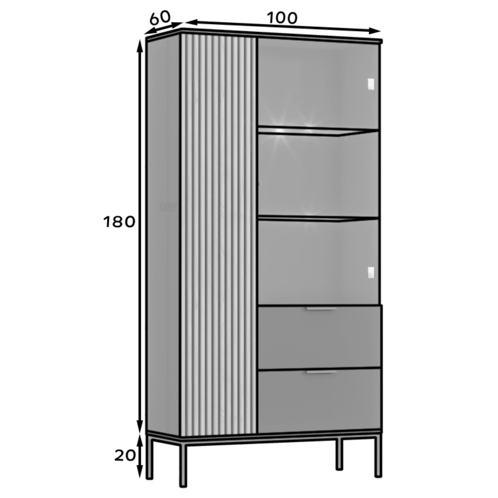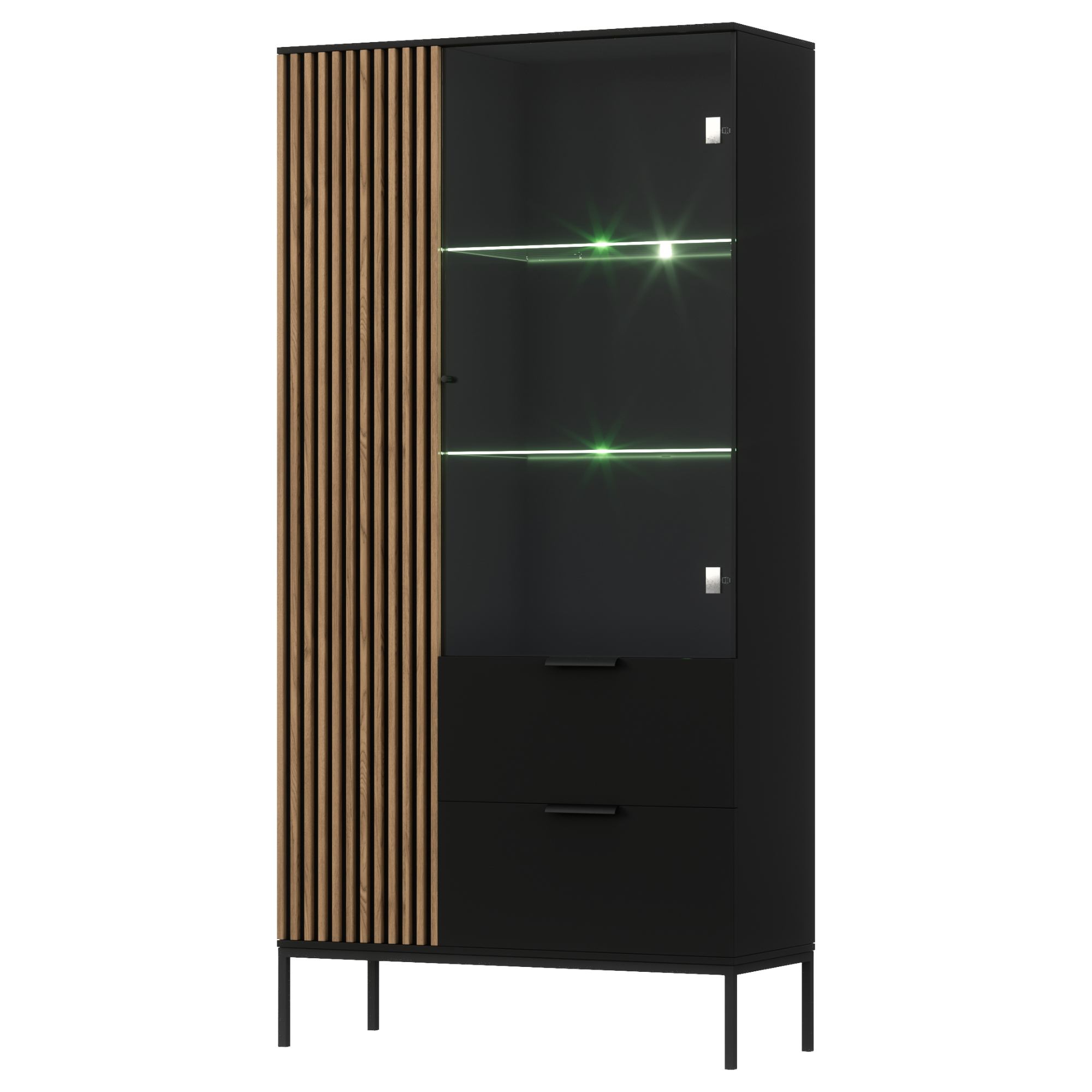 Úložný priestor zahŕňa päť políc, z toho dve presklené a dve zásuvky, ktoré vám poskytnú miesto na všetko potrebné. Štýlové rúčky uľahčujú celkovú manipuláciu. Stabilitu konštrukcie podporujú kovové nôžky. Povrch vitríny zaručuje ľahkú údržbu a dlhú životnosť.